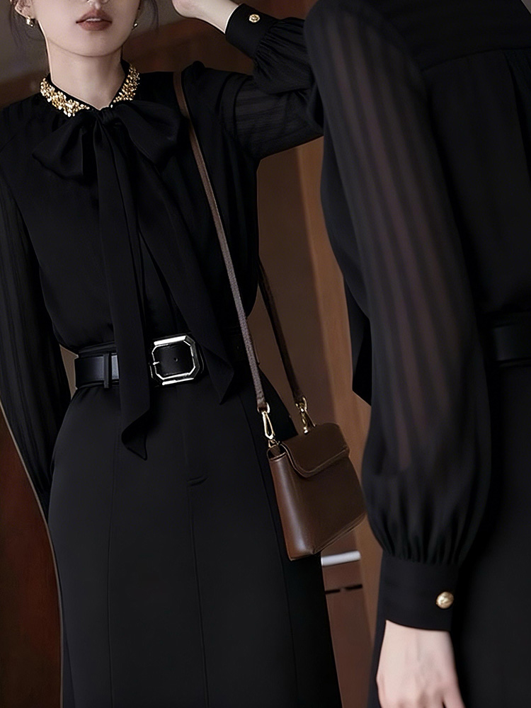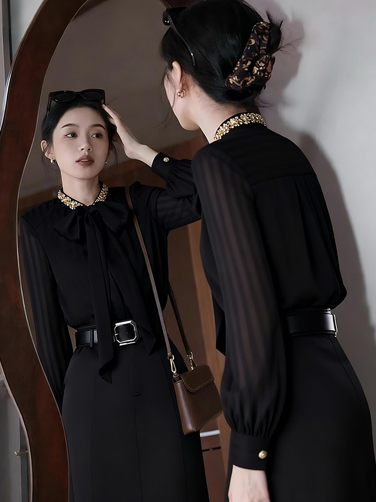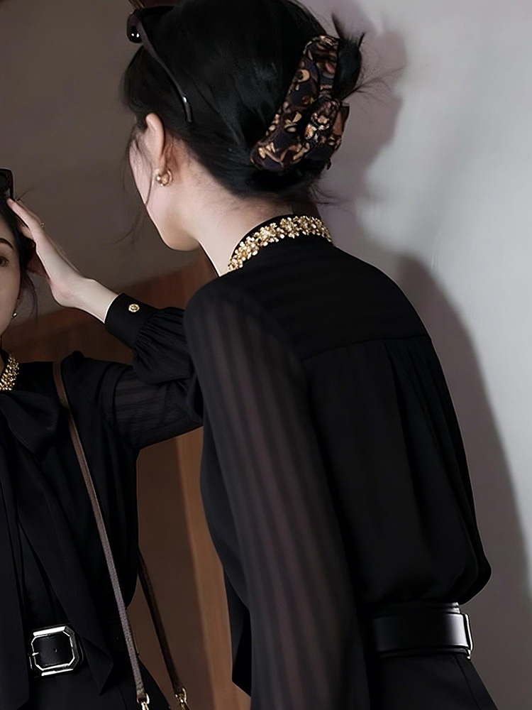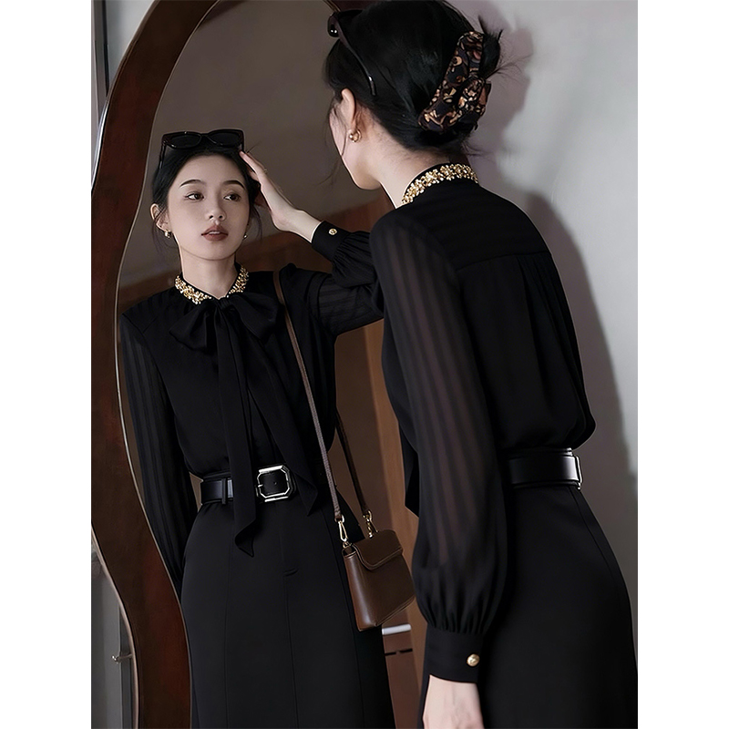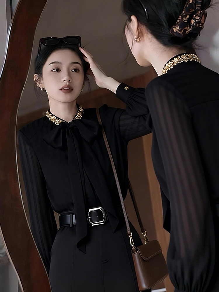 2025 Fall/Winter New Temperament Hot Diamond Bow Tie Long Sleeve High-end Mature and Elegant Style Women's Top
