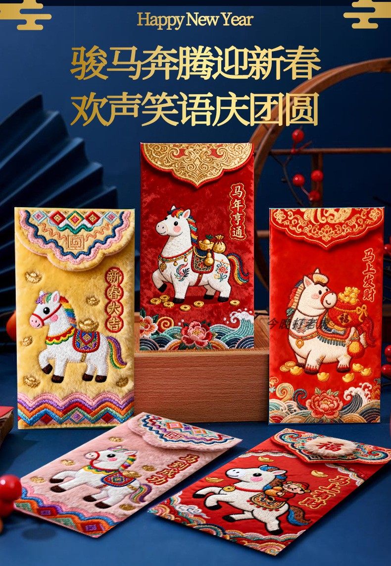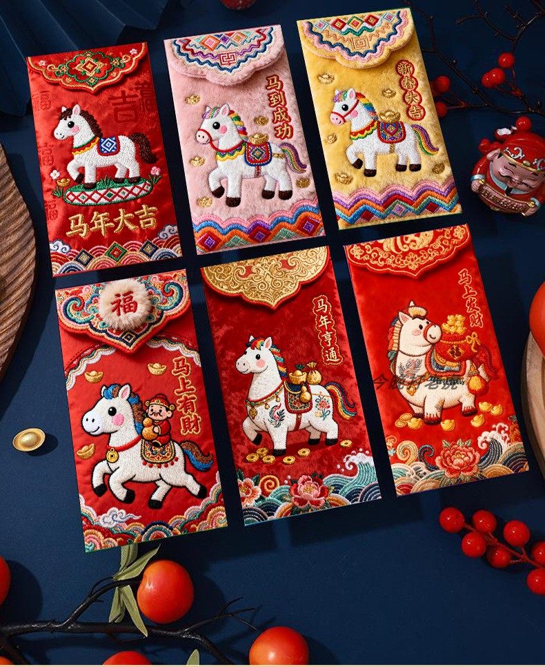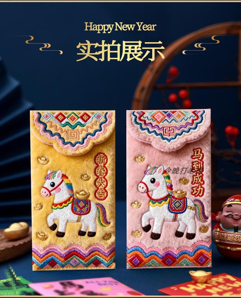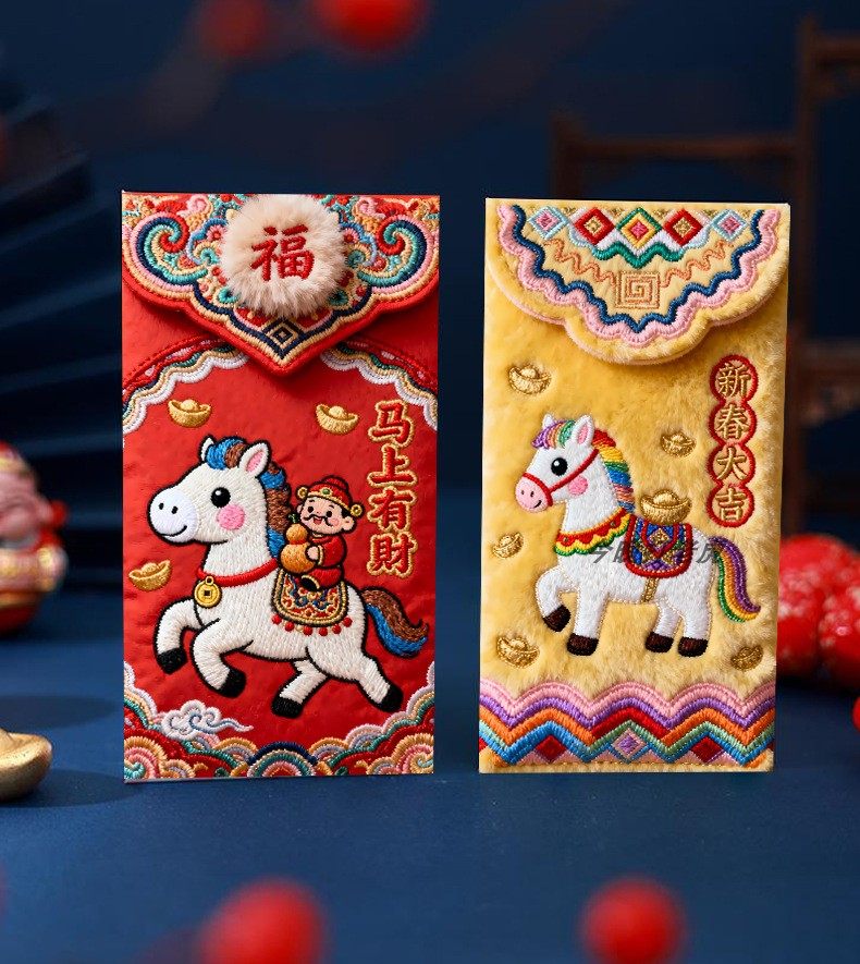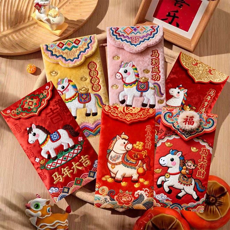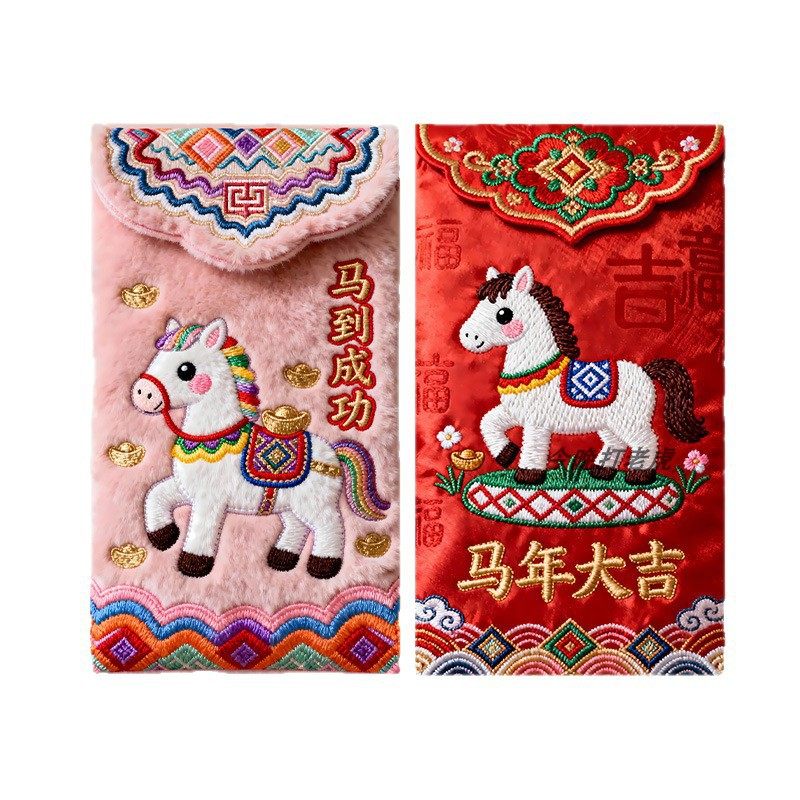 "Douyin Explosive" 2026 Year of the Horse imitation flat embroidery cartoon Fuma red envelope Spring Festival creative New Year's greeting bag