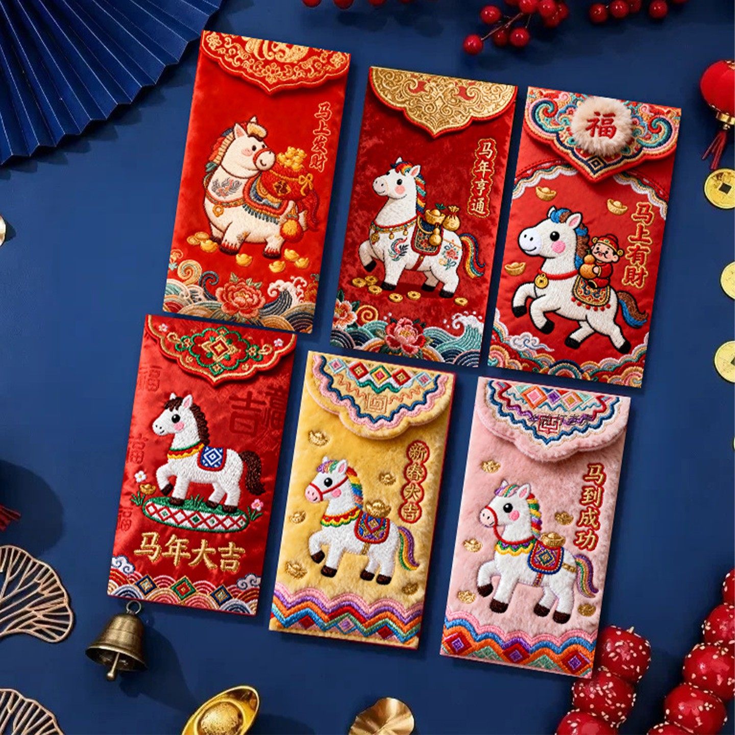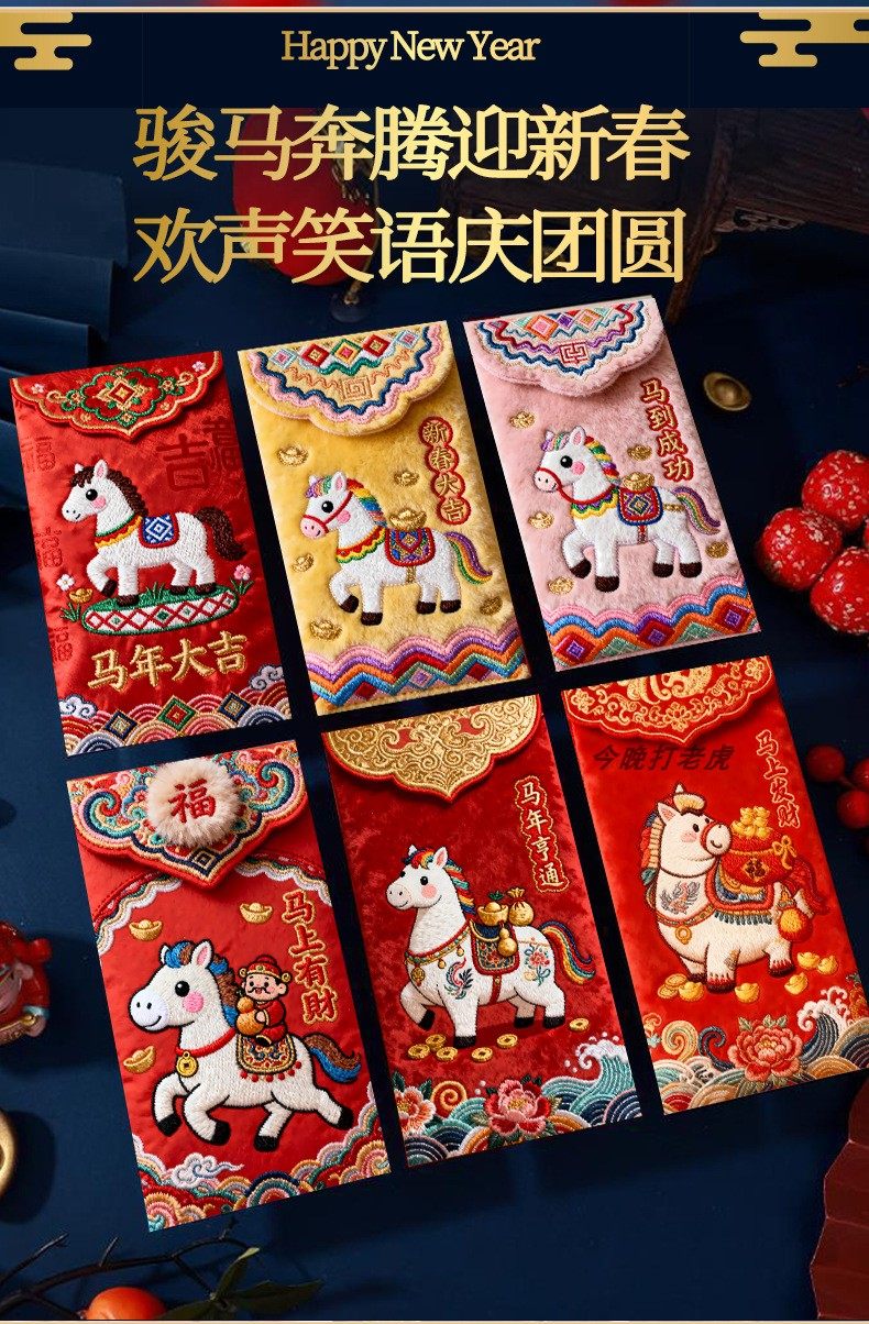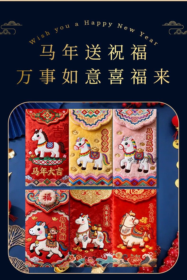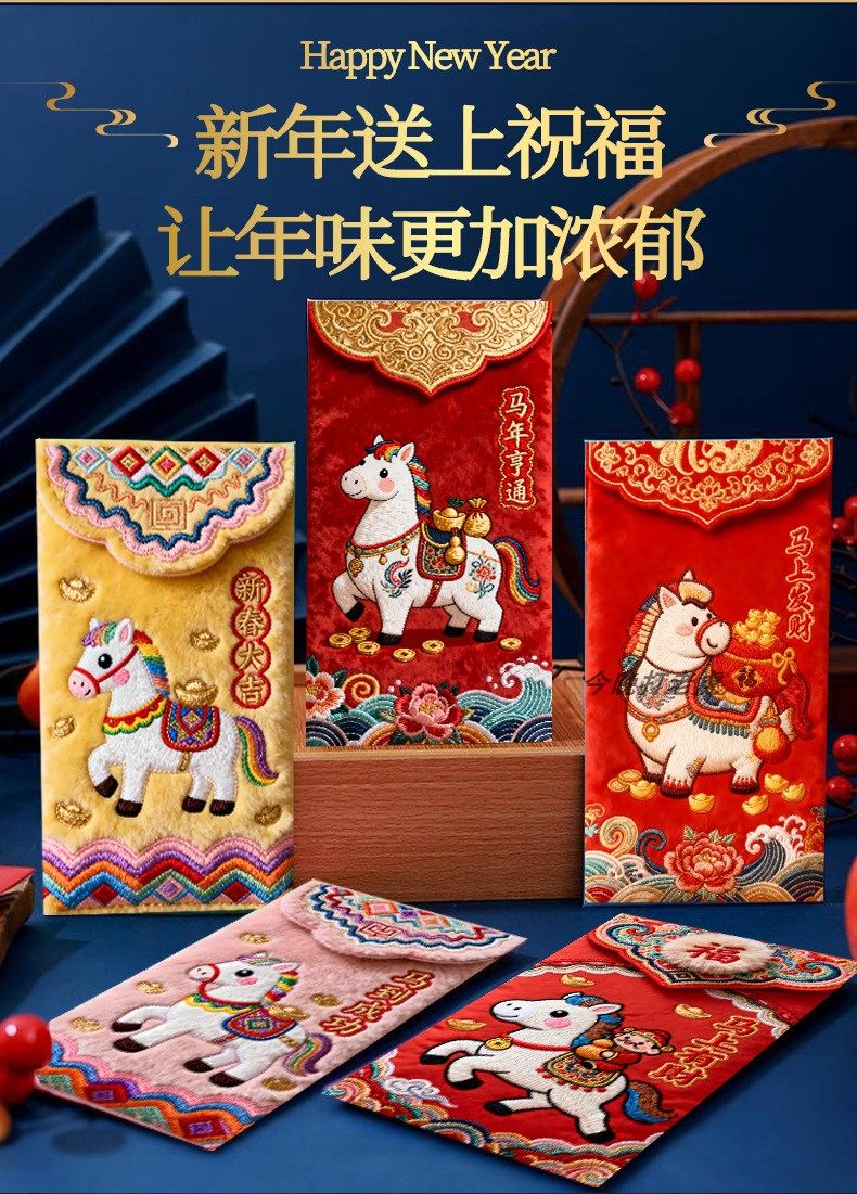 "Douyin Explosive" 2026 Year of the Horse imitation flat embroidery cartoon Fuma red envelope Spring Festival creative New Year's greeting bag