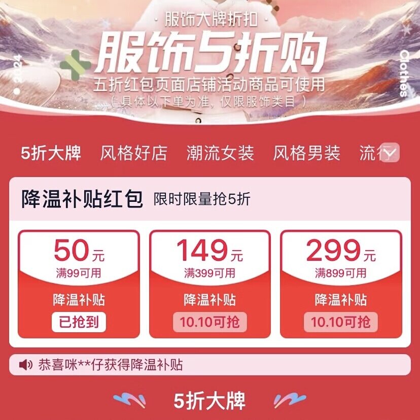 Tmall clothing coupons, skydrop clothing coupons, sports outdoor sports 50% off coupons, clothing category coupons, 90% off outfit coupons