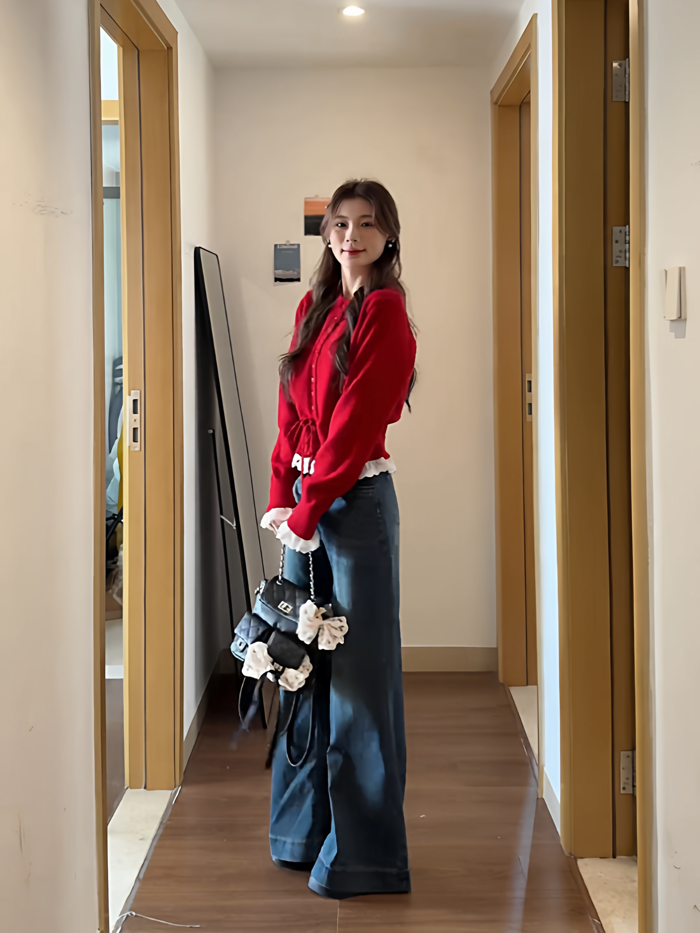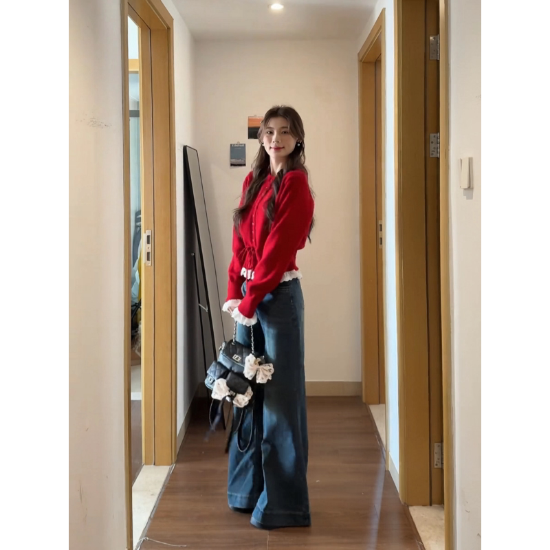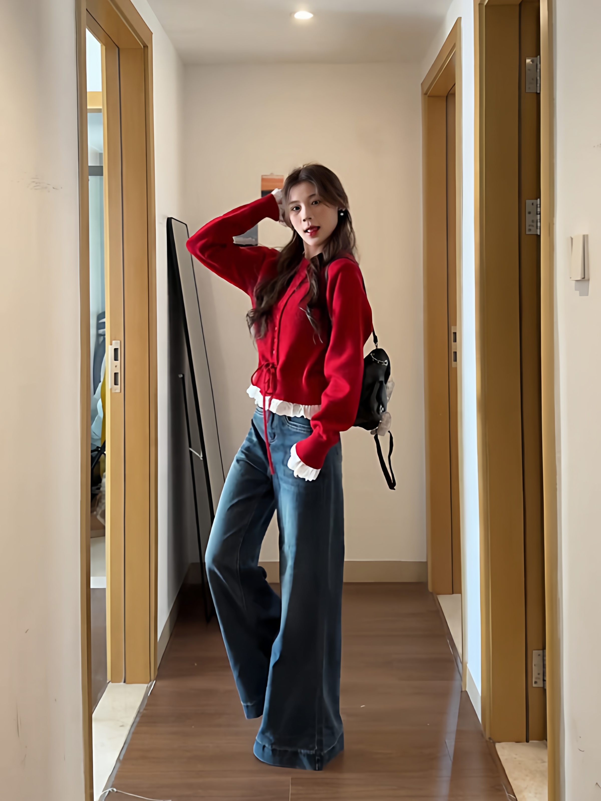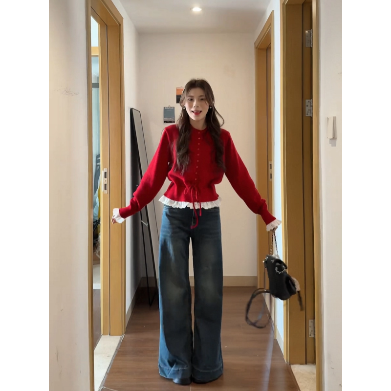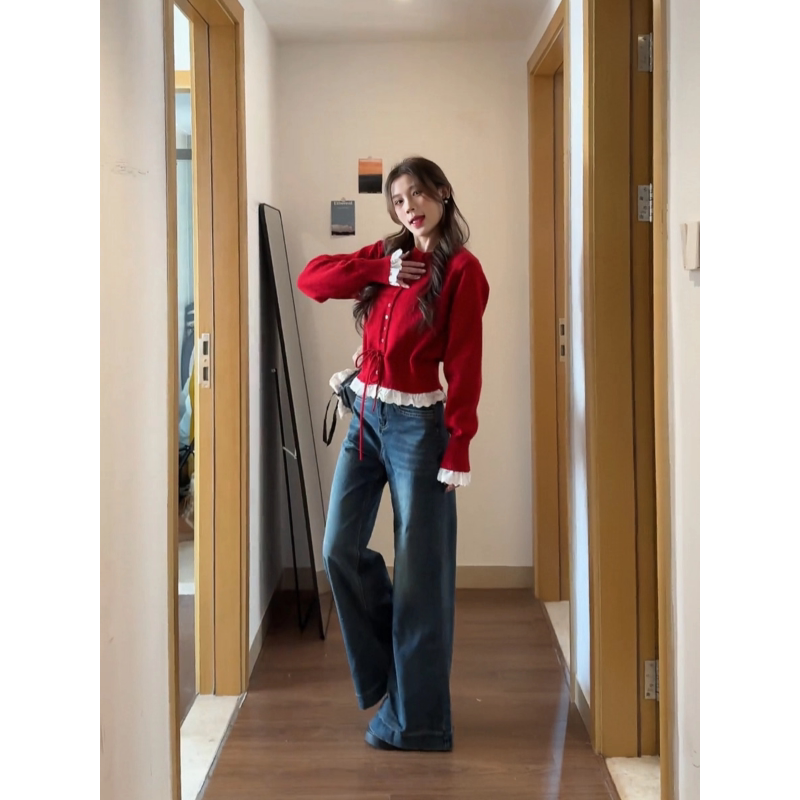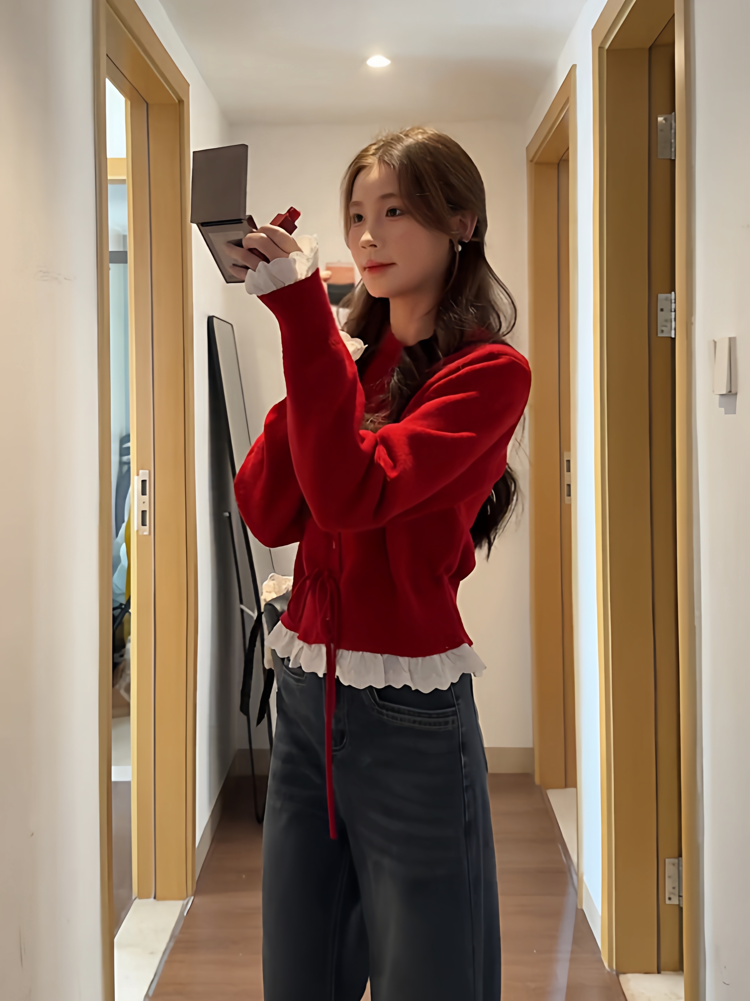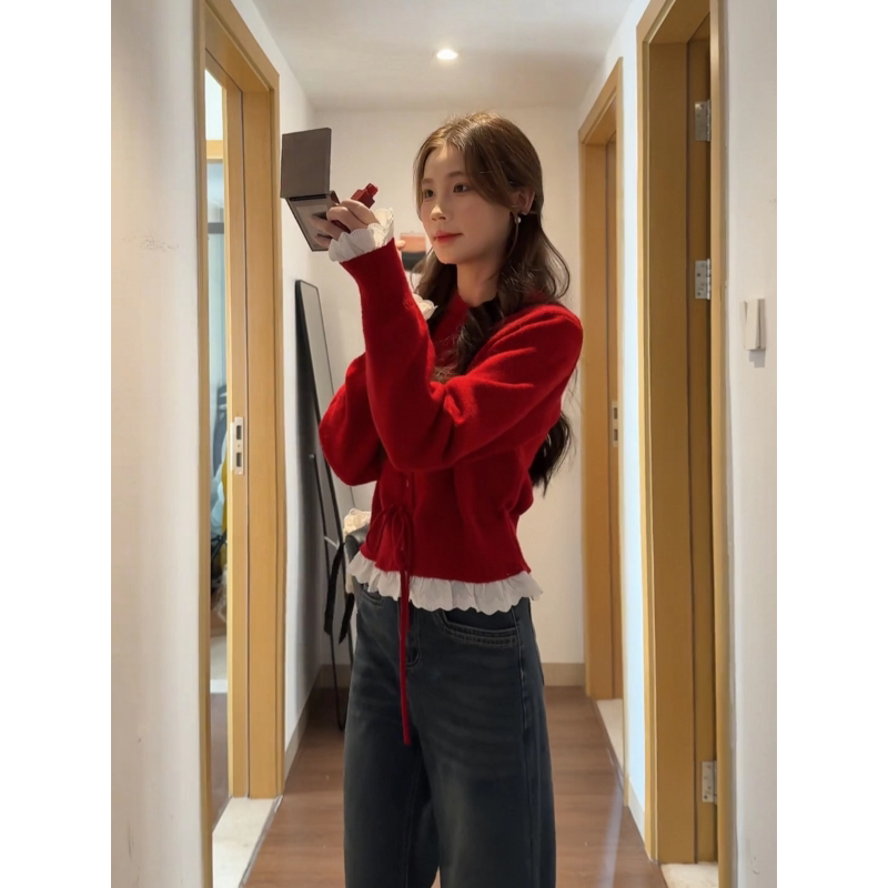 New Year's Natal Year Christmas Red Fake Two Lace Knitted Sweater Women's Fall and Winter Inner Cardigan Jacket Top