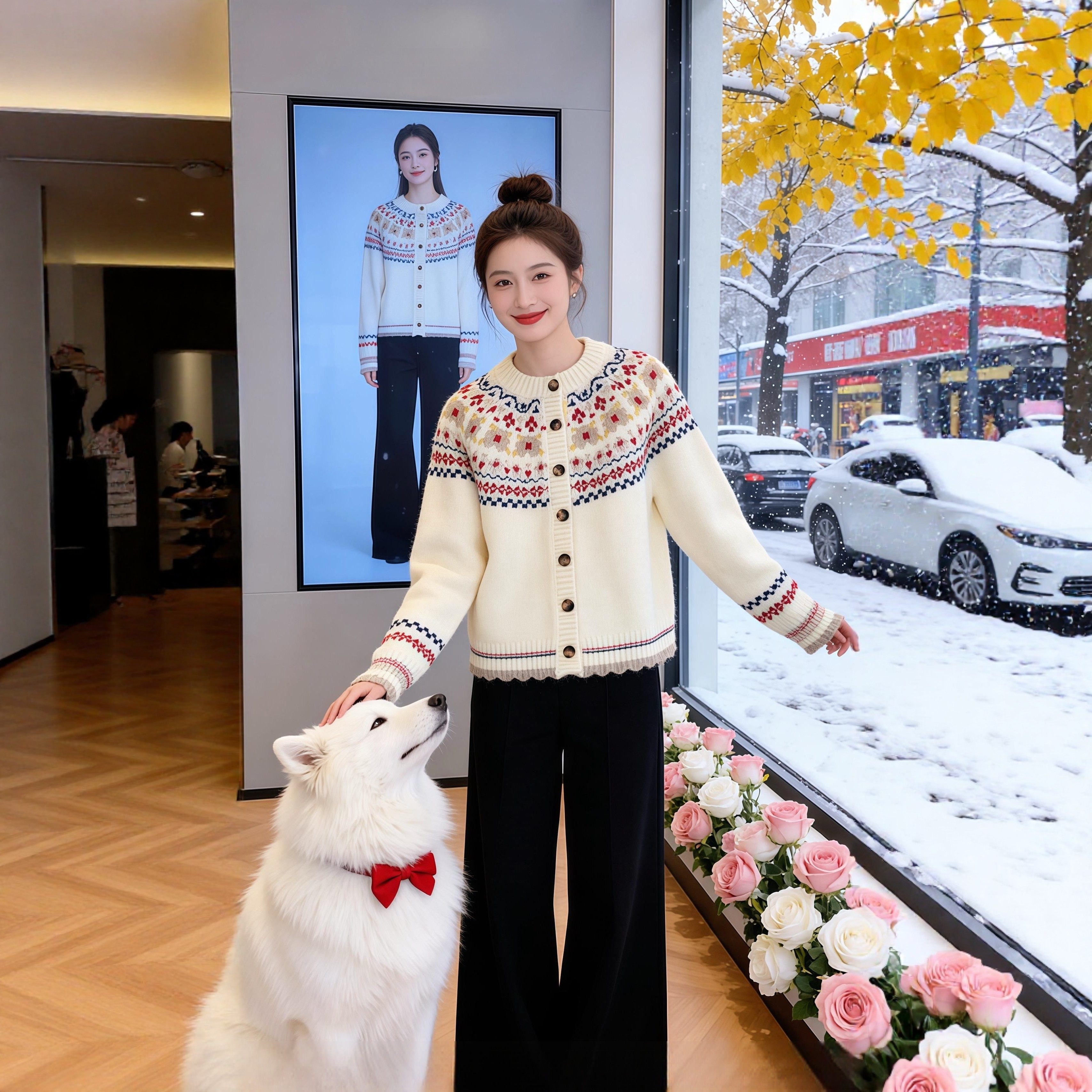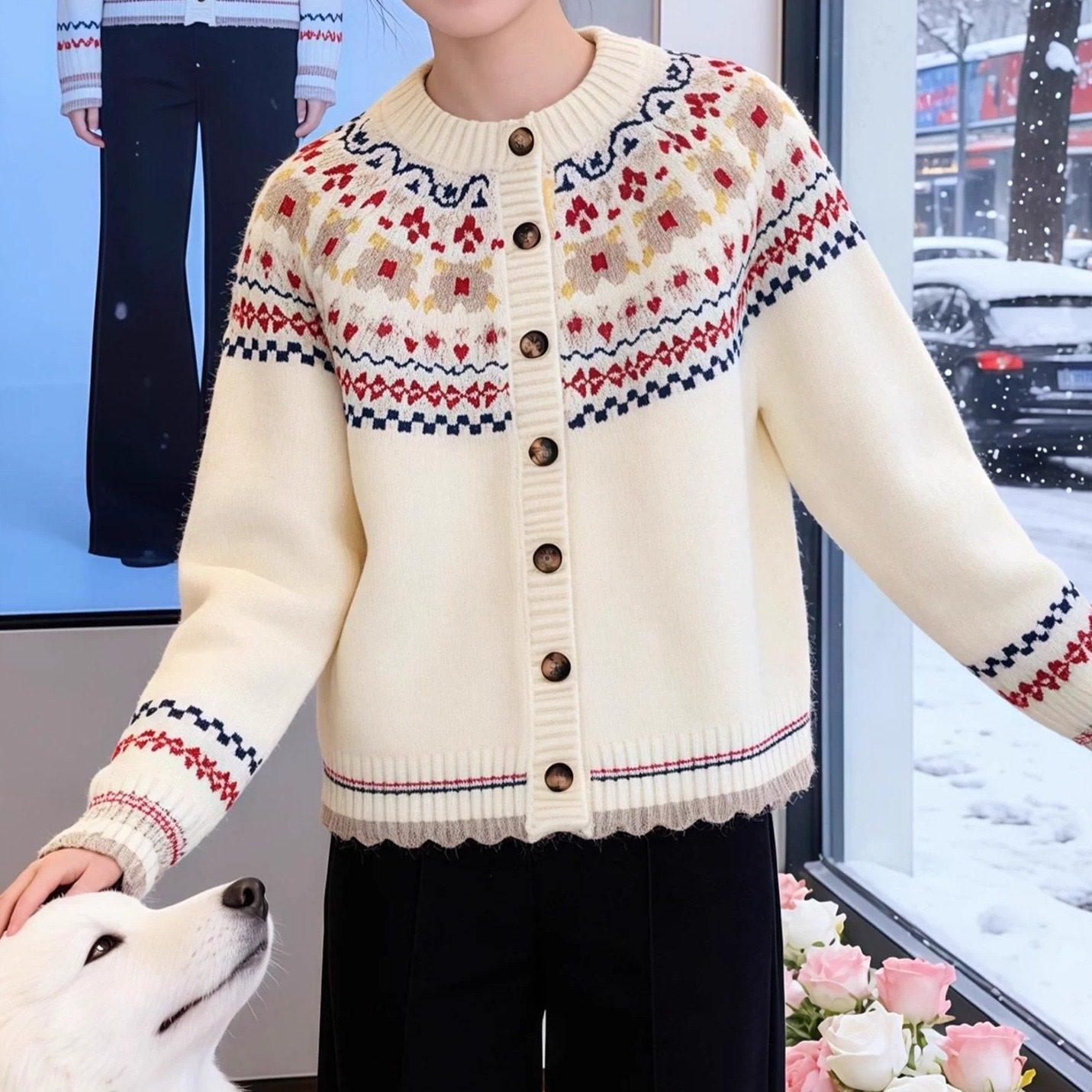 Spring new lazy style knitted cardigan sweater jacket women's Fair Island design sense chic crew neck temperament top