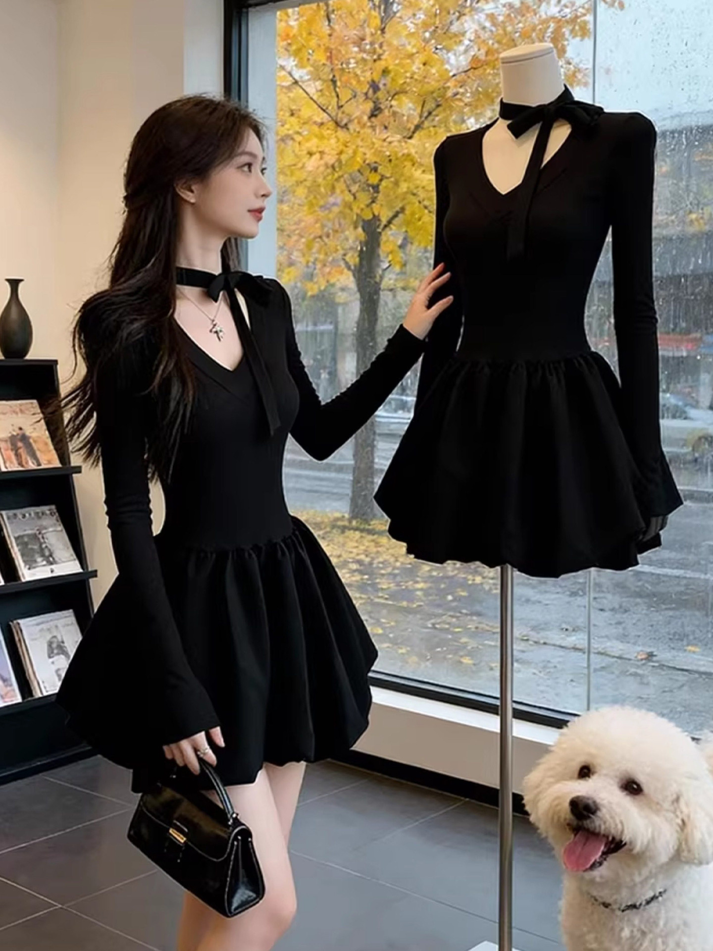 Black Hepburn knitted dress women's early spring 2026 new small flower bud skirt with a waist-cinching skirt underneath