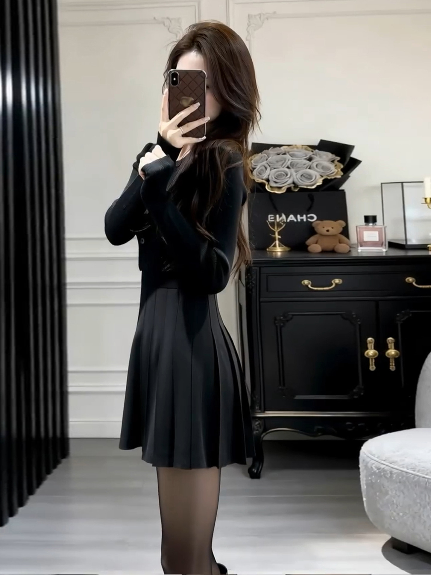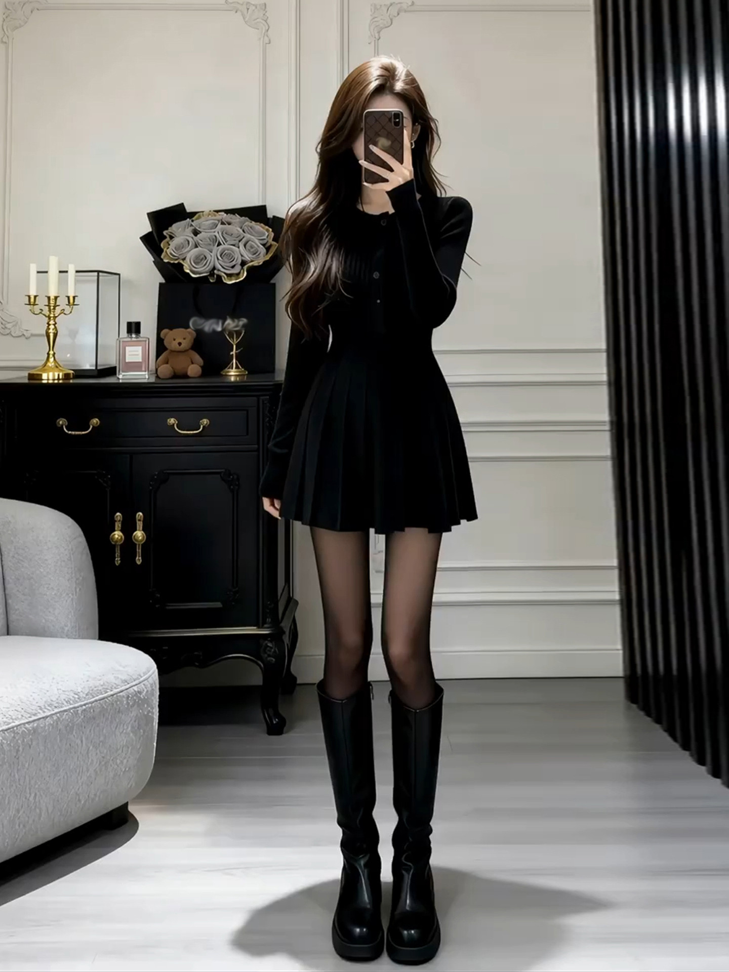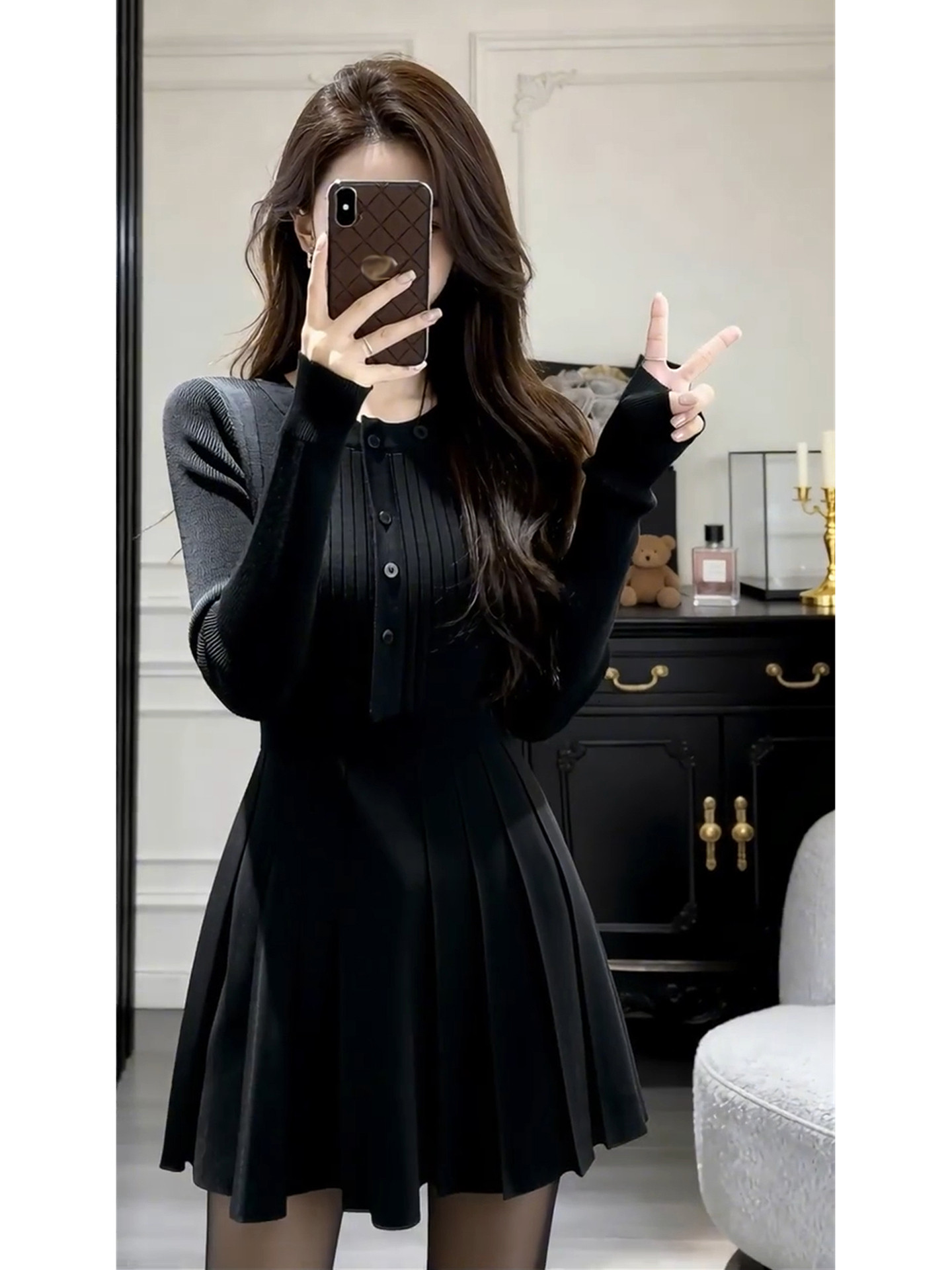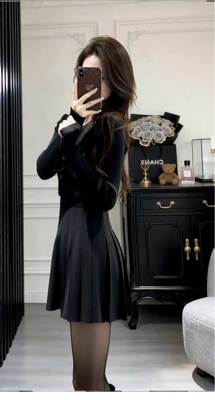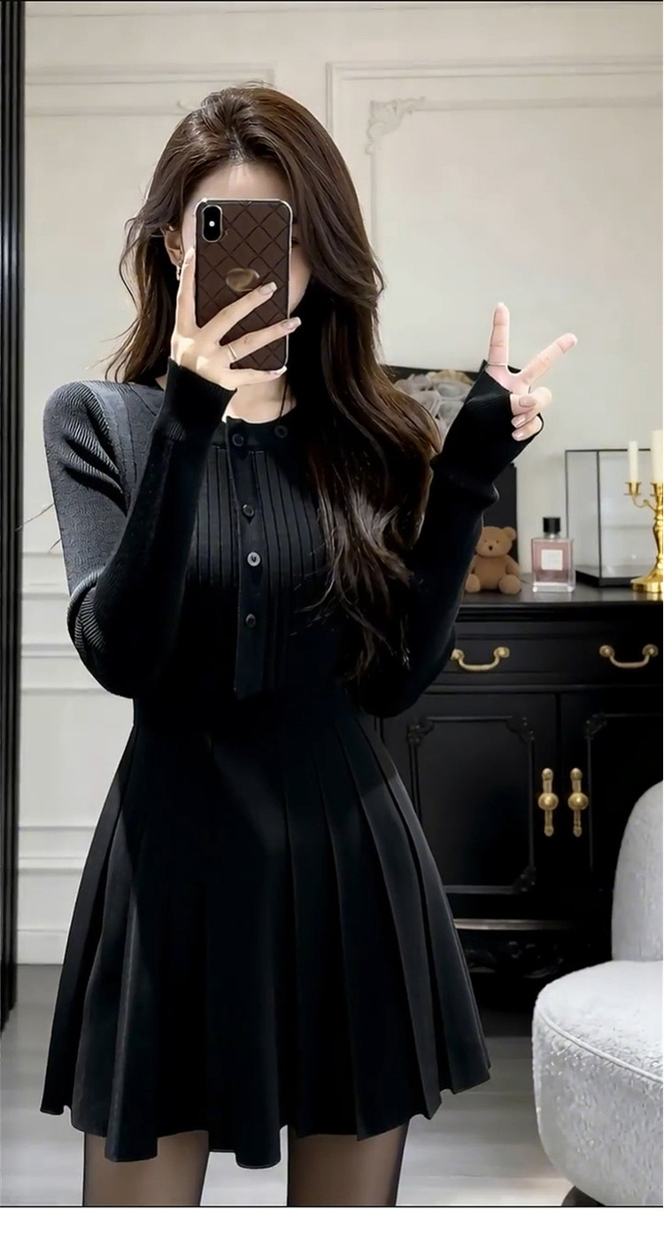 French Hepburn-style black knitted dress women's autumn and winter 2026 new base with waist A-line skirt