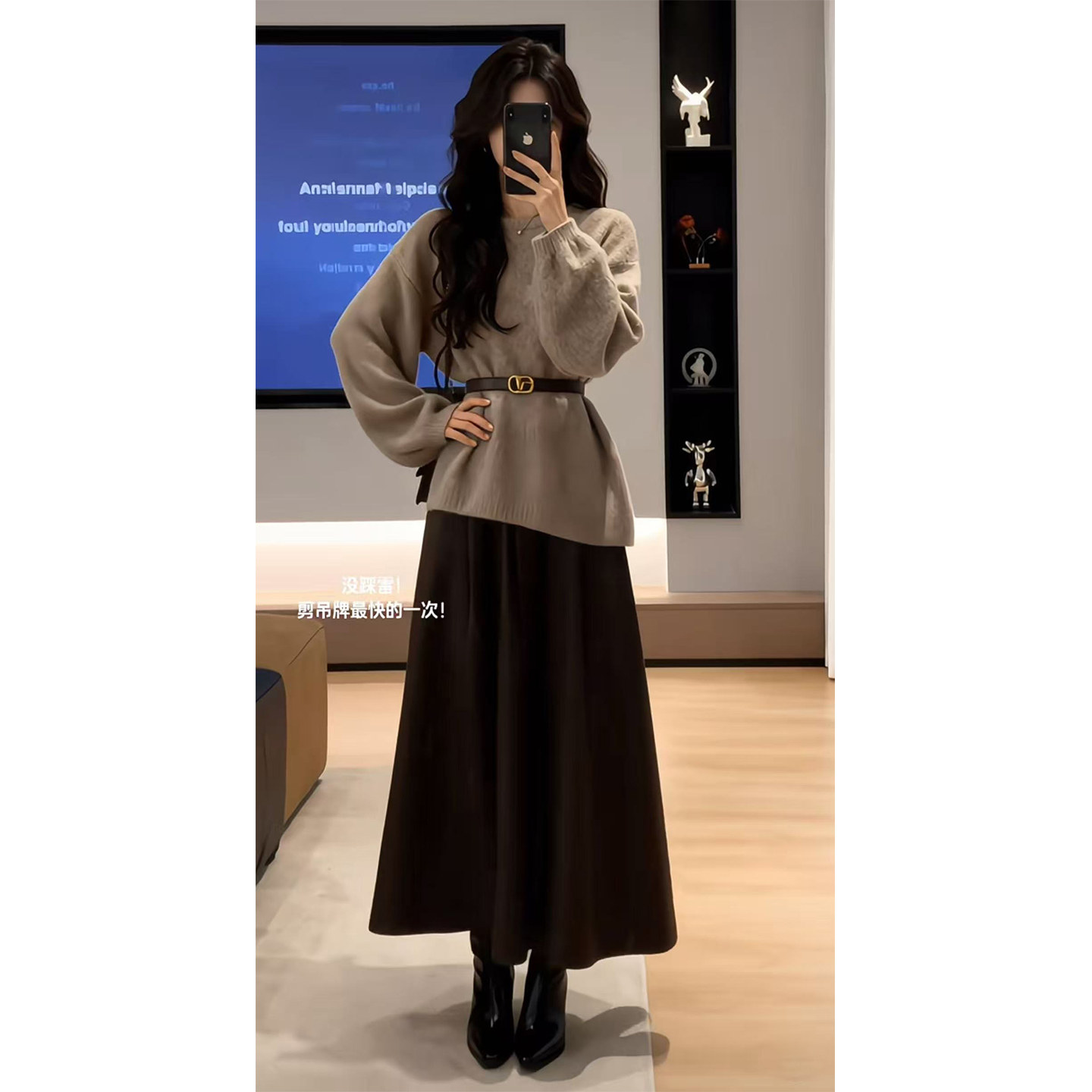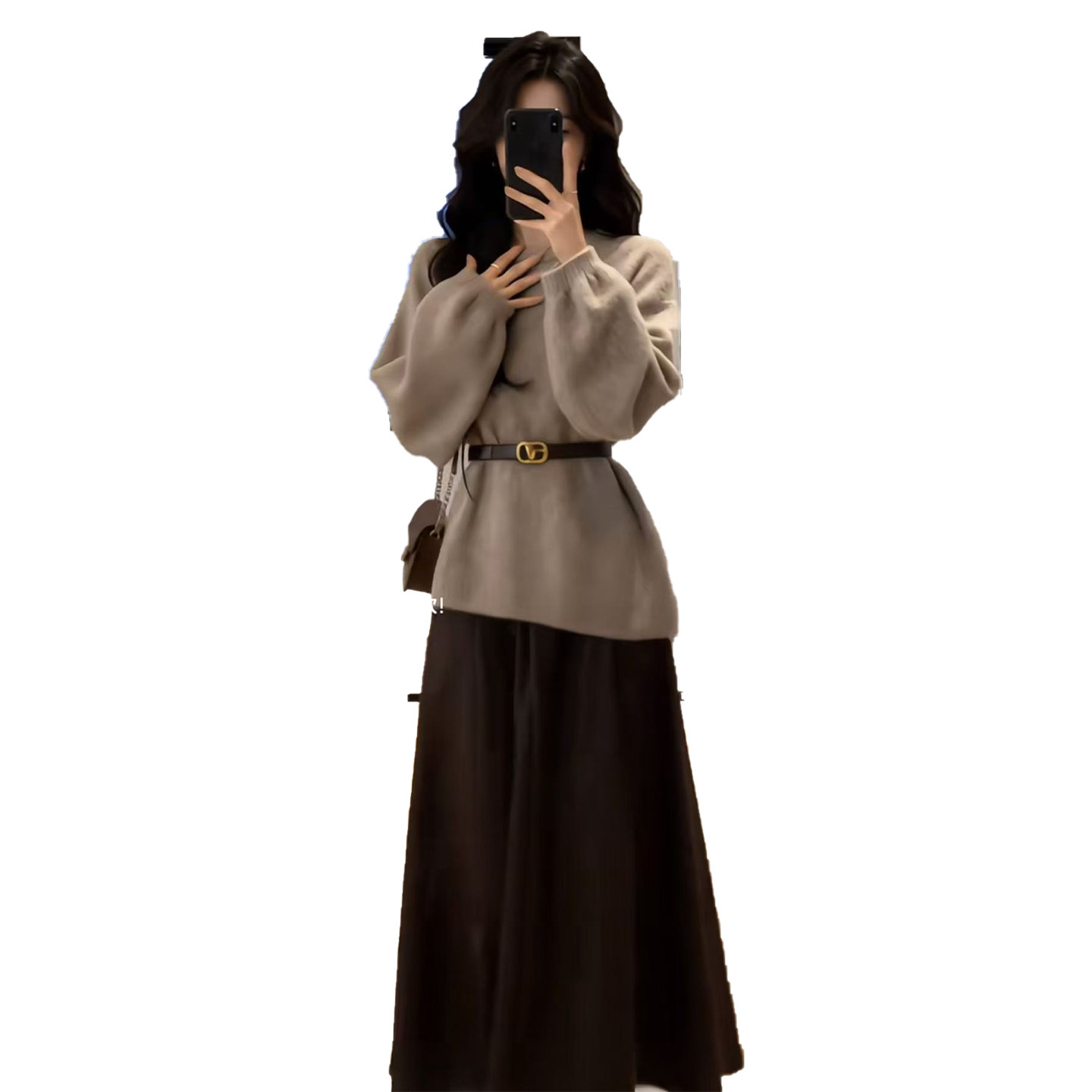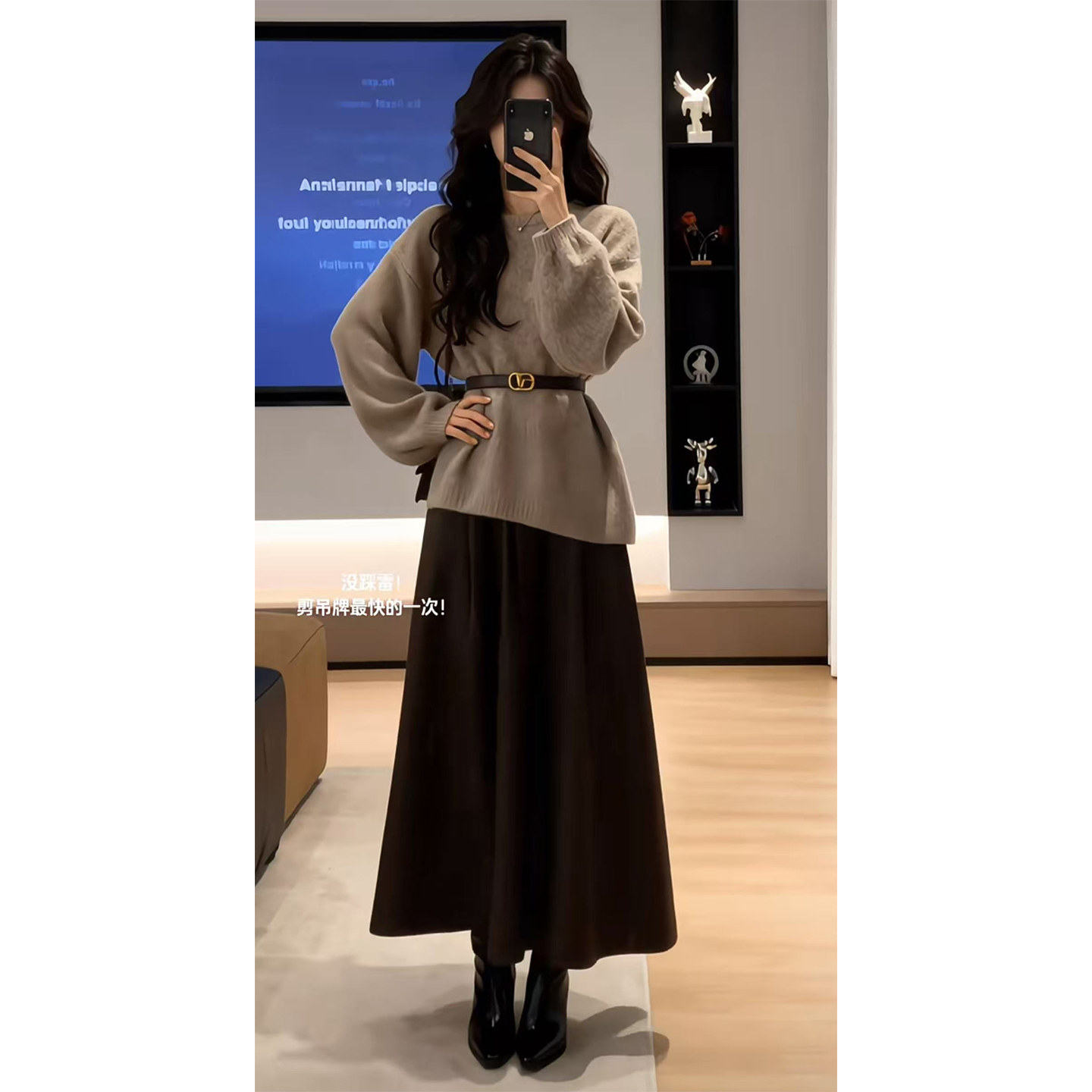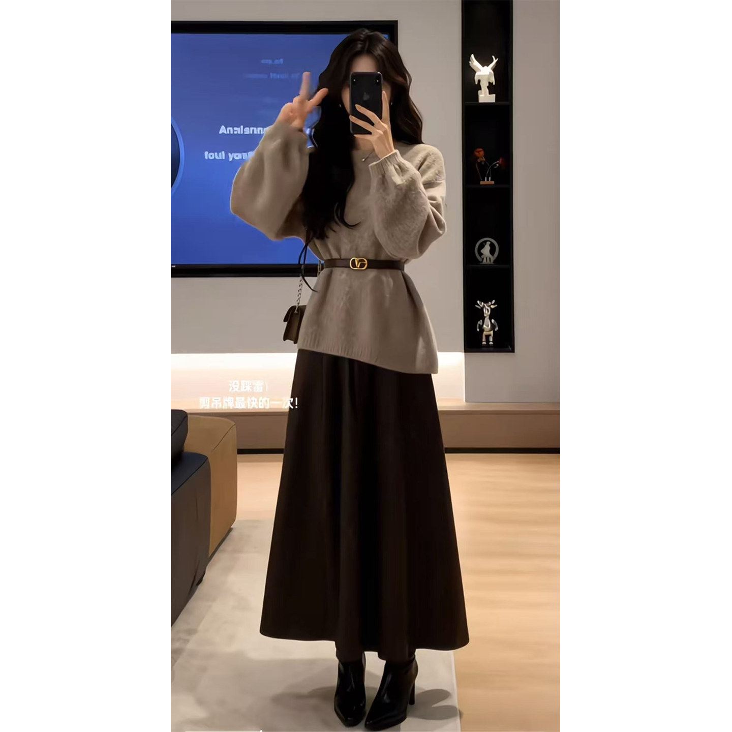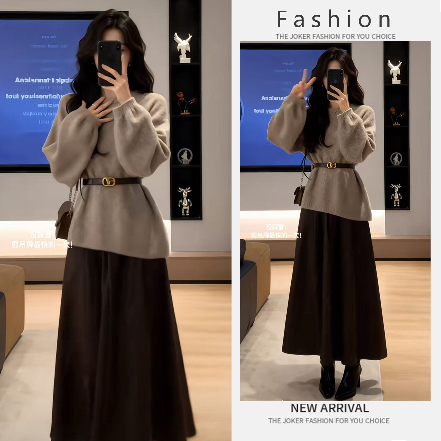 Spring Korean lazy loose crew neck design sense waist knit top high-waisted skirt two-piece suit trend