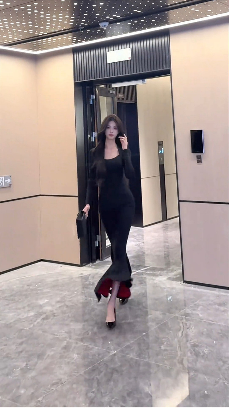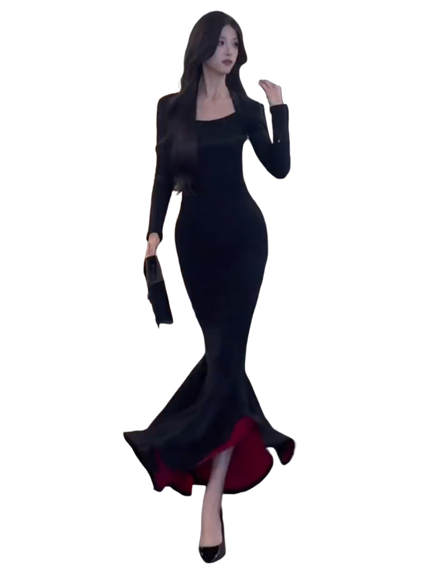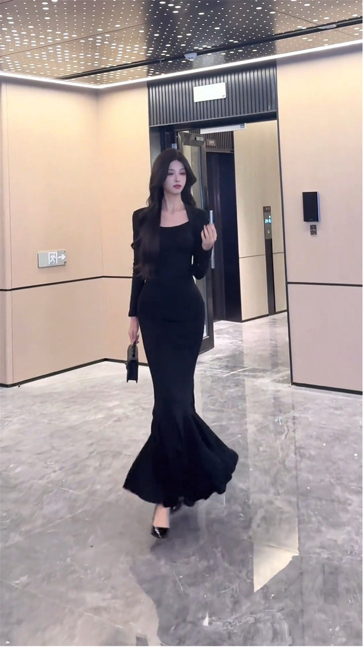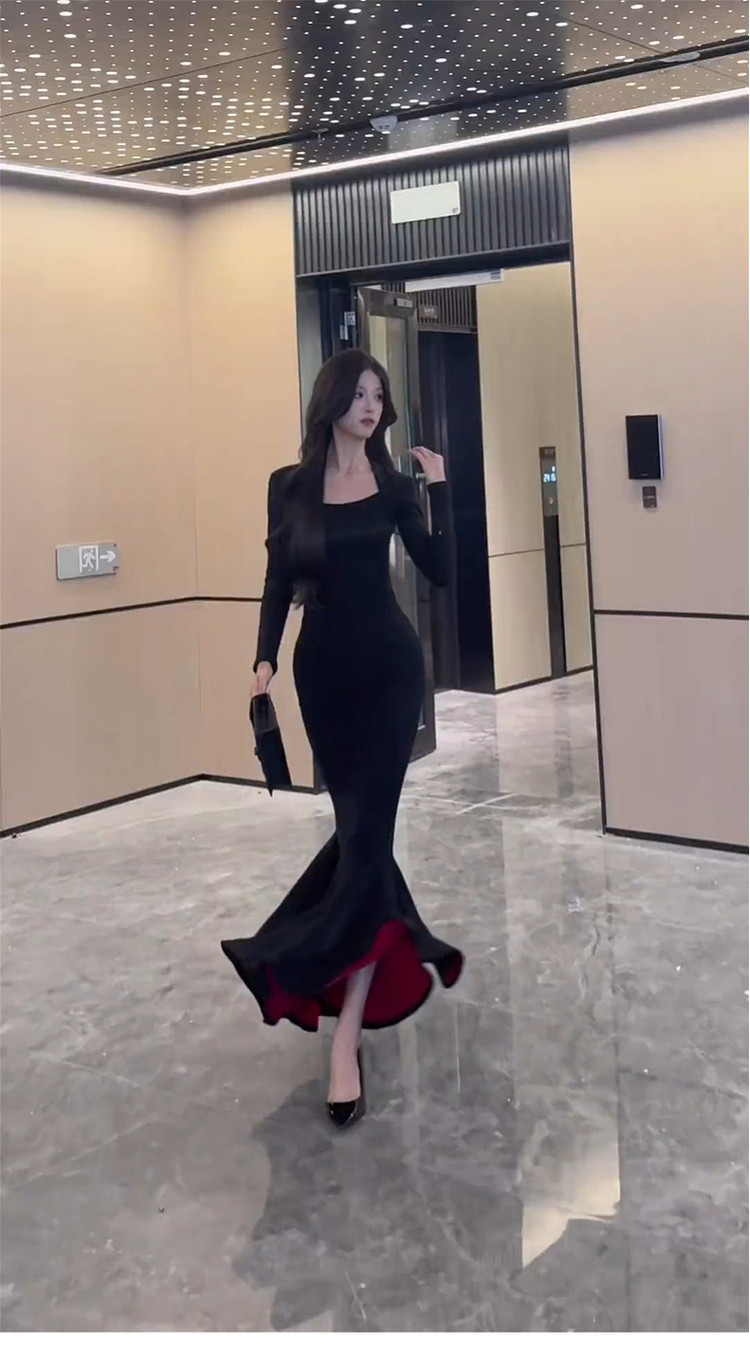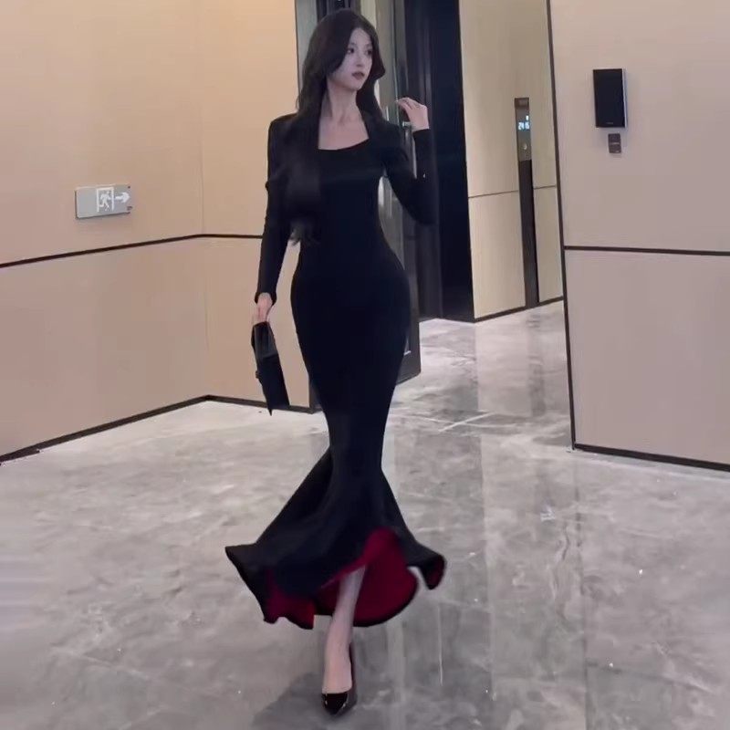 French royal sister black hip-hugging dress women's autumn and winter 2026 new step-by-step lotus red background mermaid long skirt