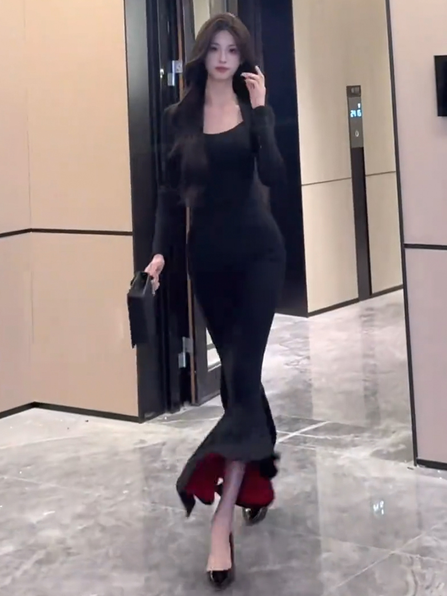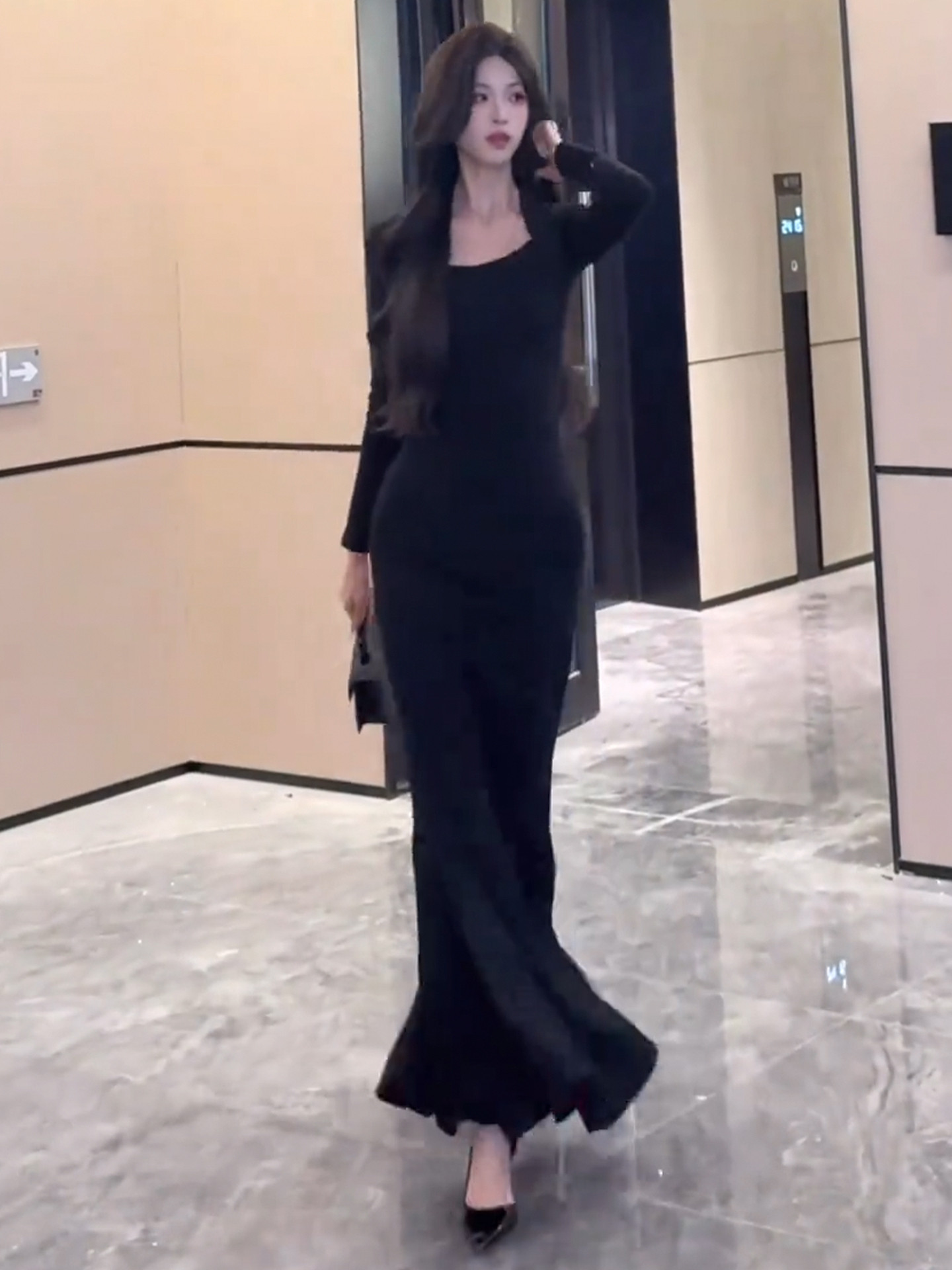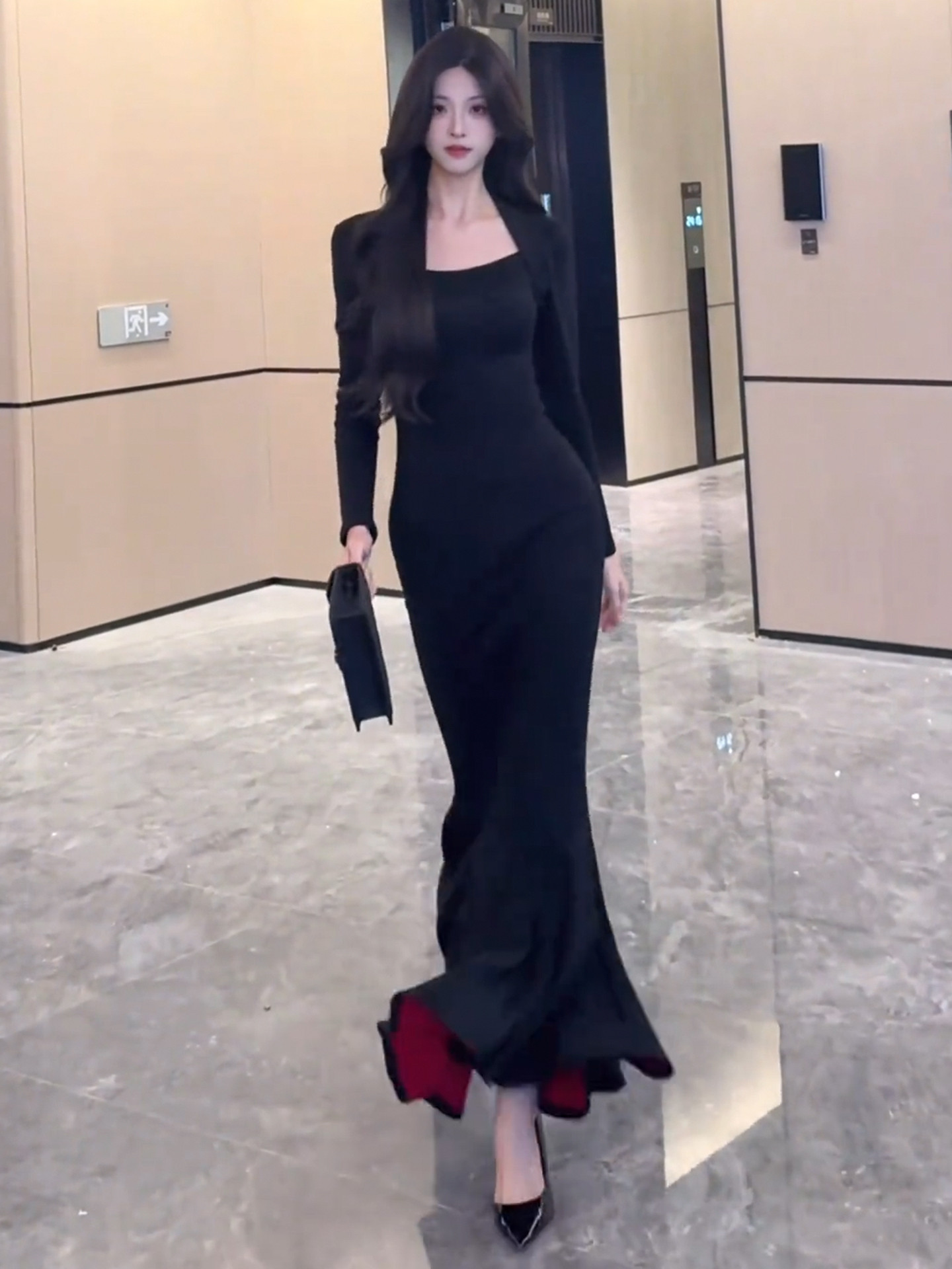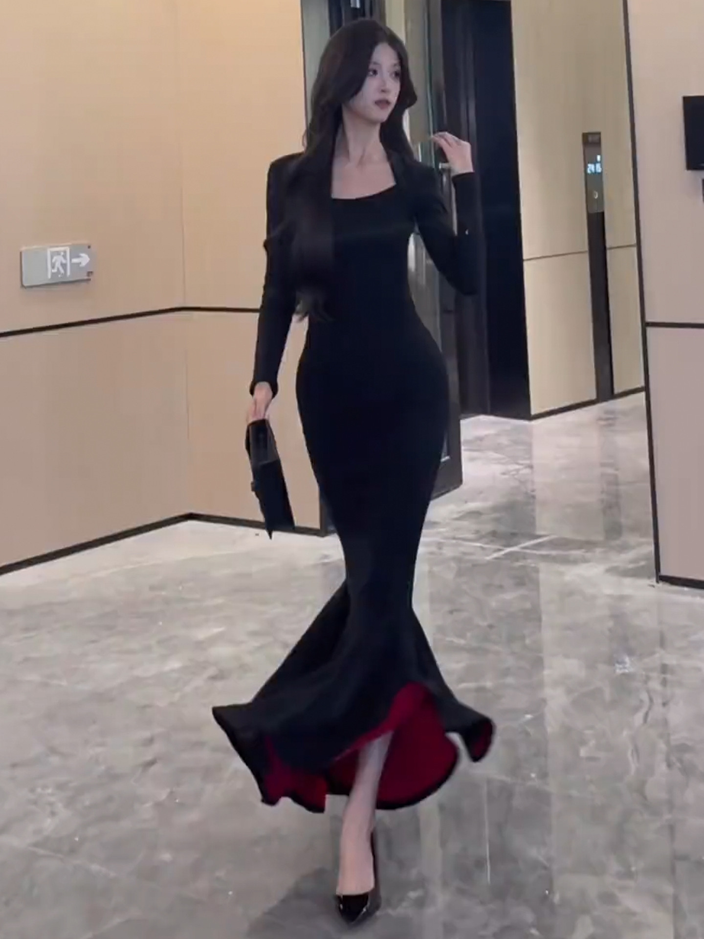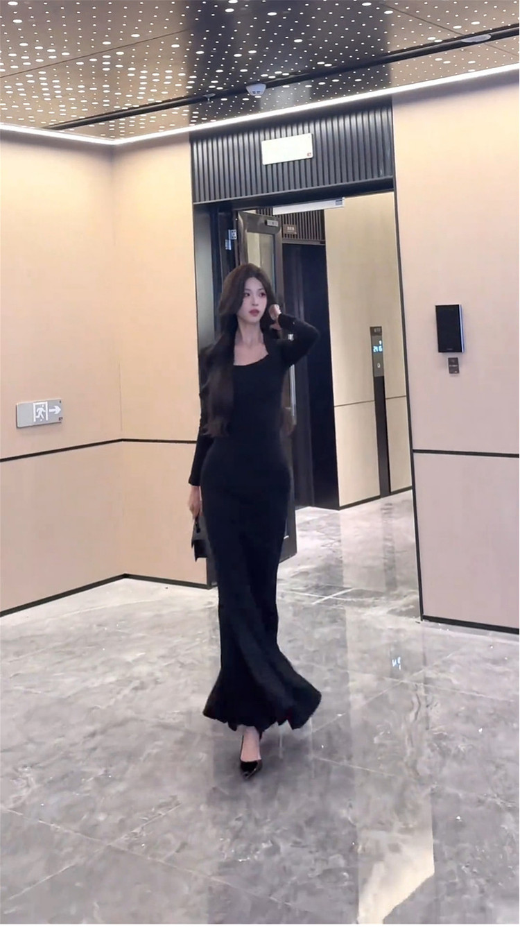 French royal sister black hip-hugging dress women's autumn and winter 2026 new step-by-step lotus red background mermaid long skirt