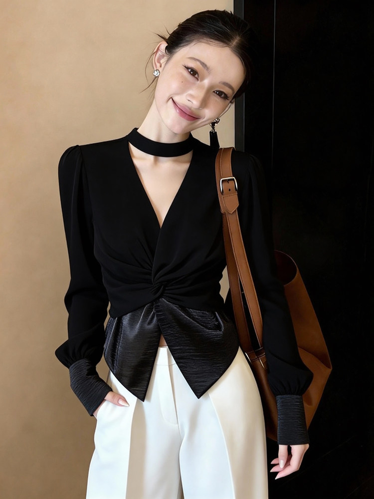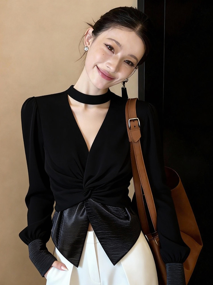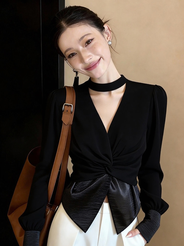 Korean version of the new trendy fashion and versatile foreign fashionable black shirt women's 2026 pre-spring V-neck waist cardigan