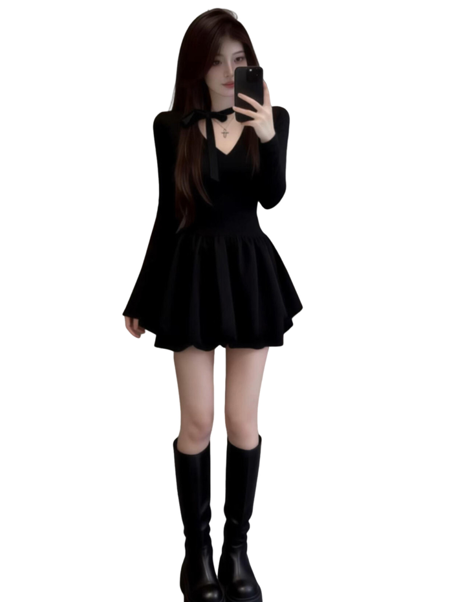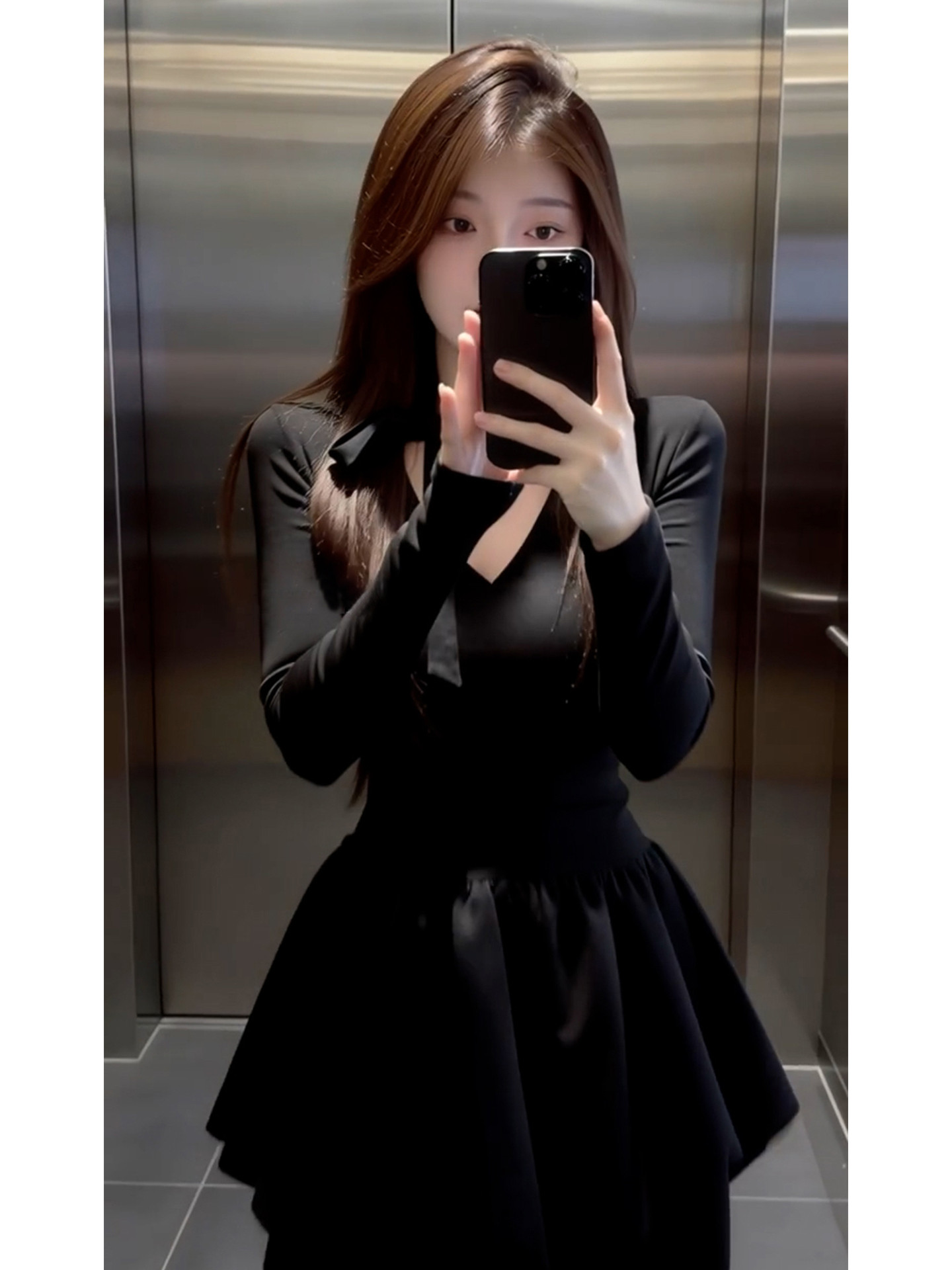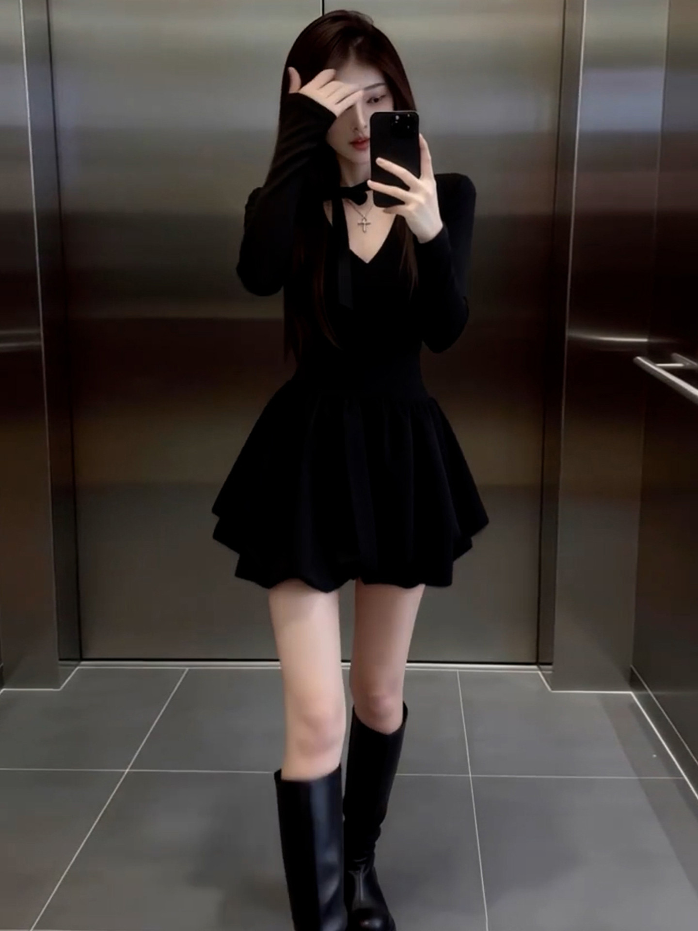 French Hepburn style V-neck dress for women, 2026 new black waist slimming temperament bud fluffy skirt