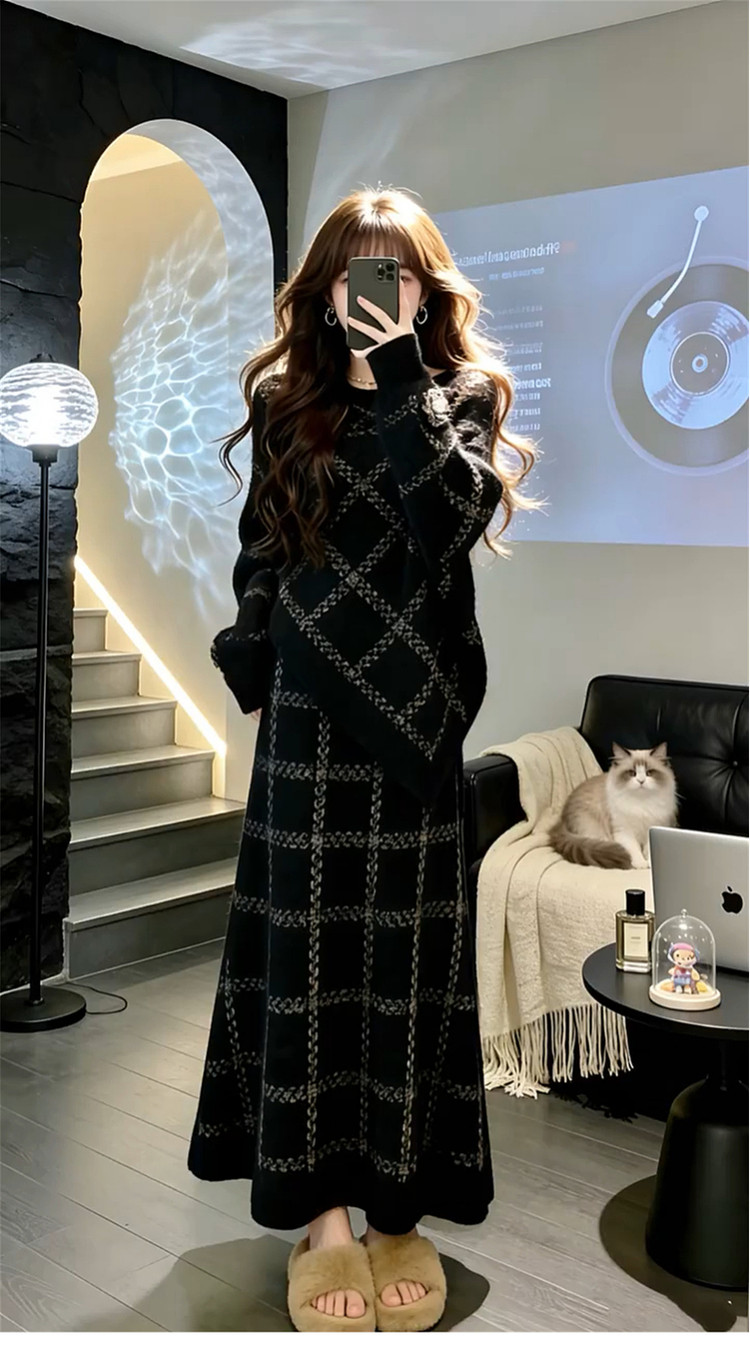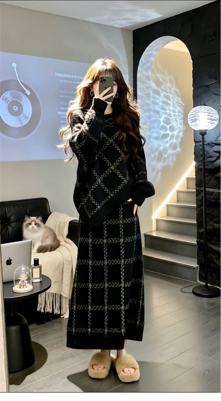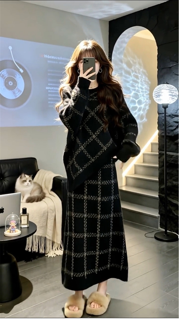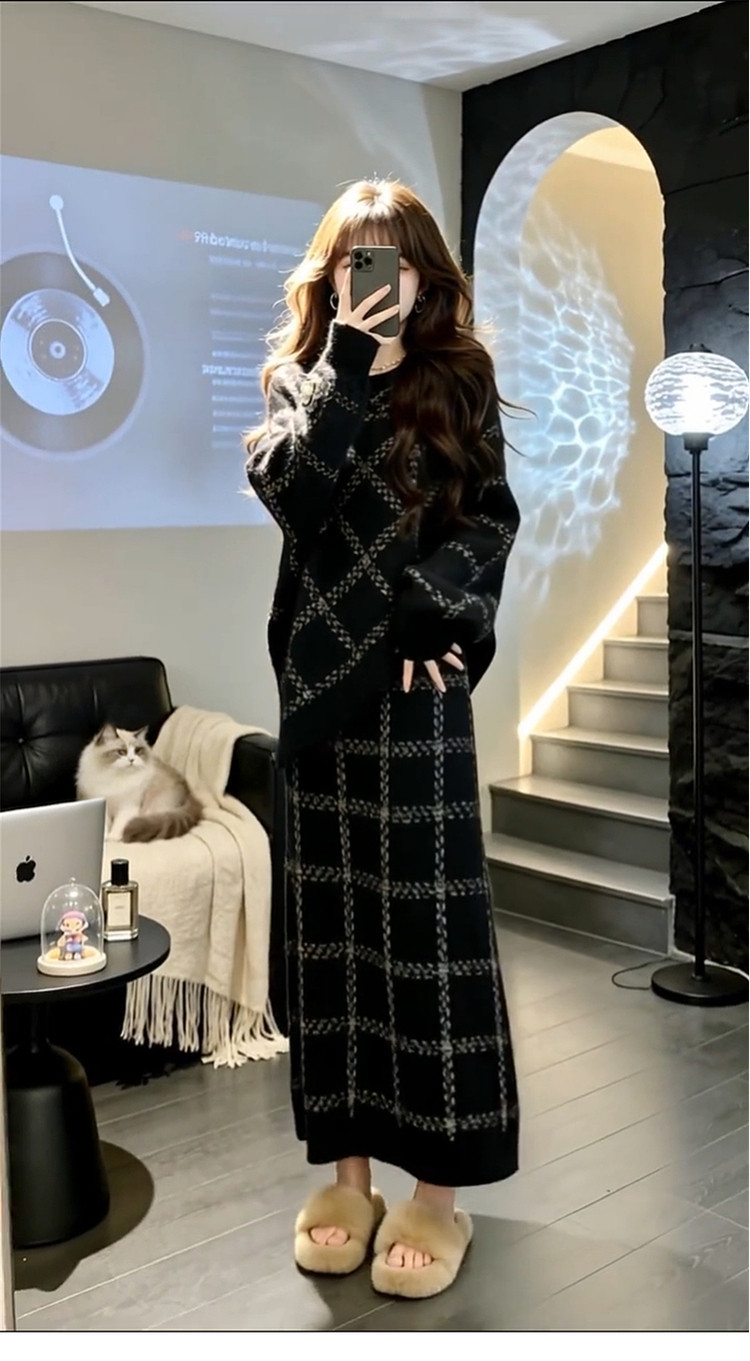2026 New Korean Lazy Style Black Knitted Sweater Dress Women's Autumn and Winter Outfit High-end Long Skirt Set