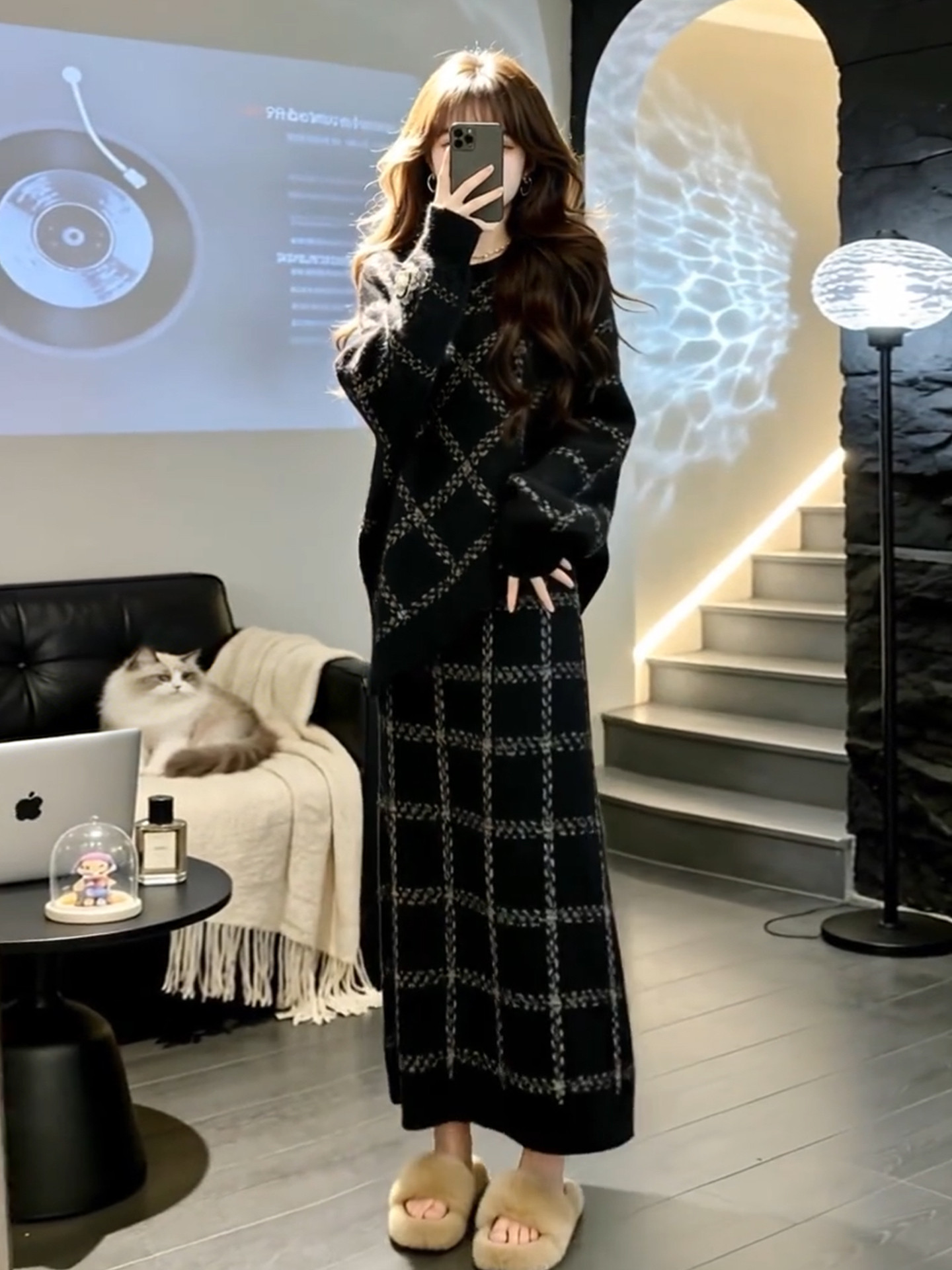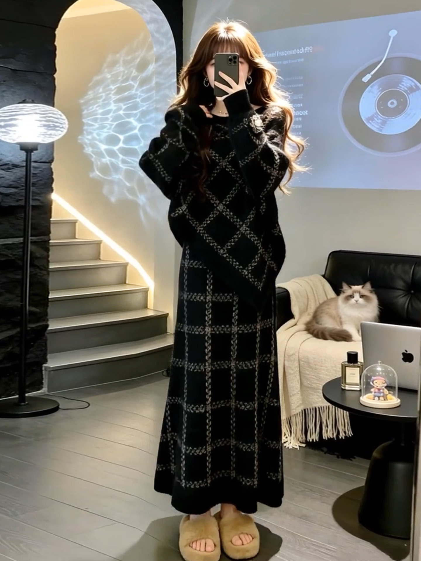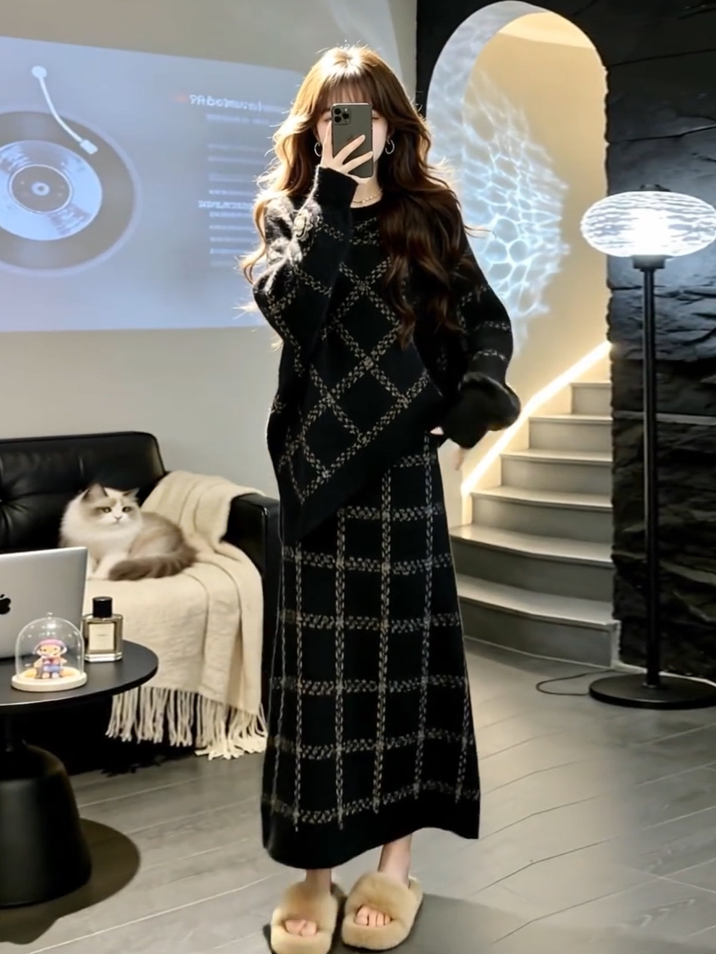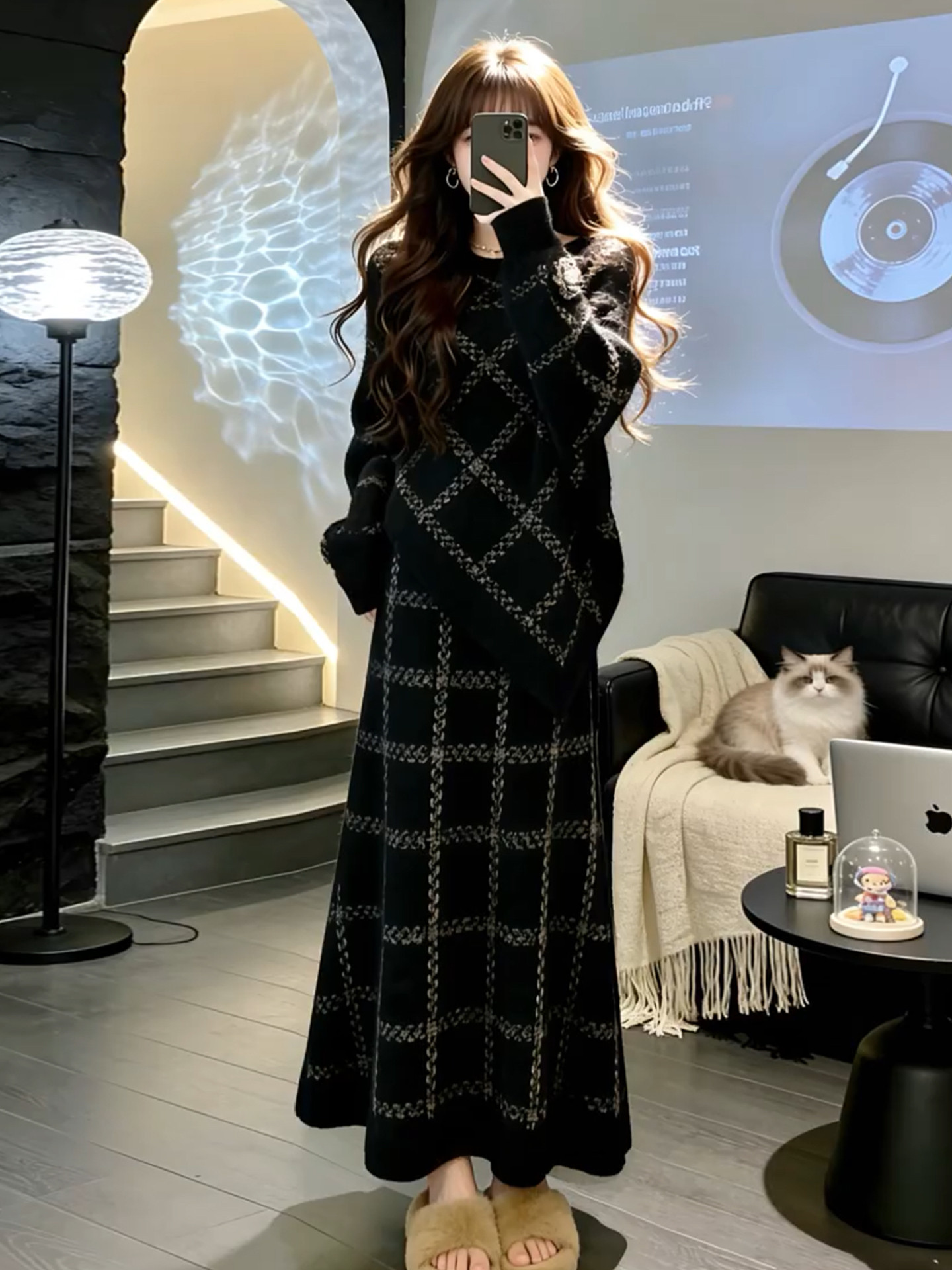 2026 New Korean Lazy Style Black Knitted Sweater Dress Women's Autumn and Winter Outfit High-end Long Skirt Set