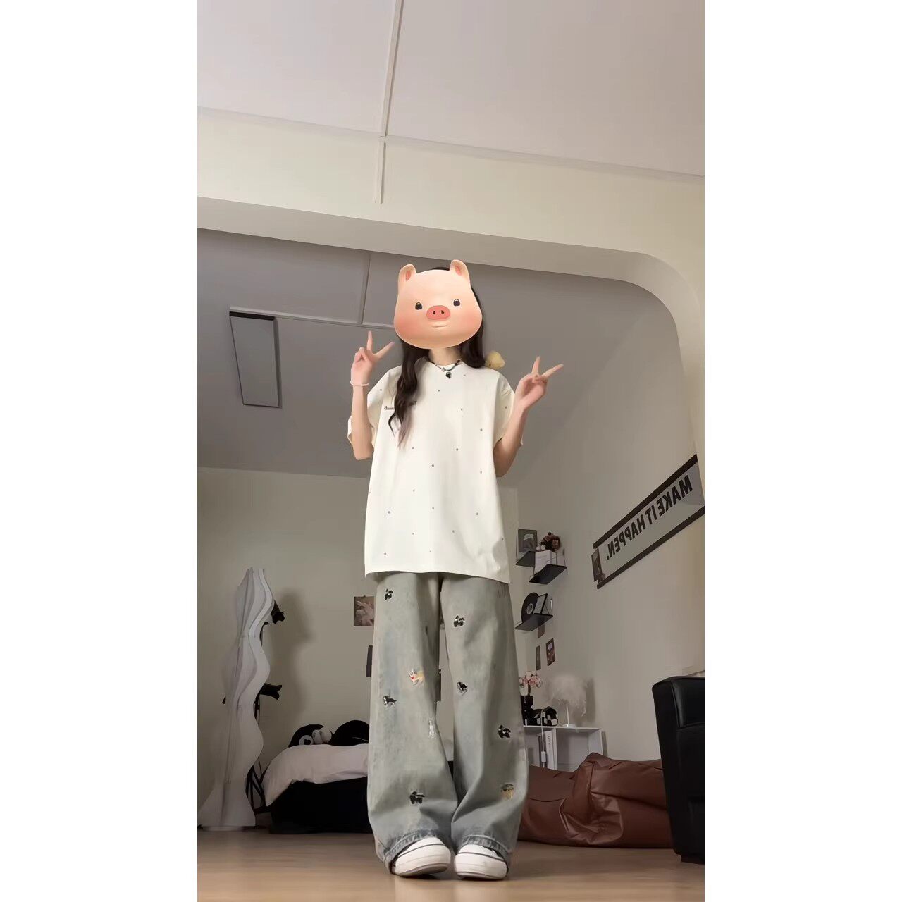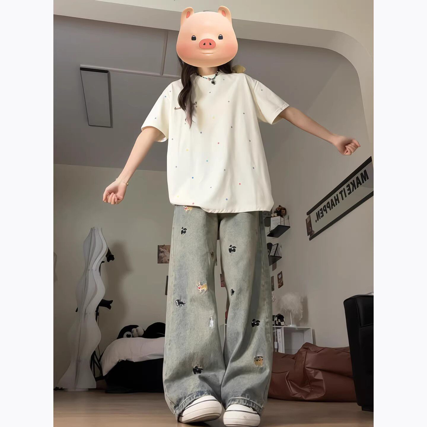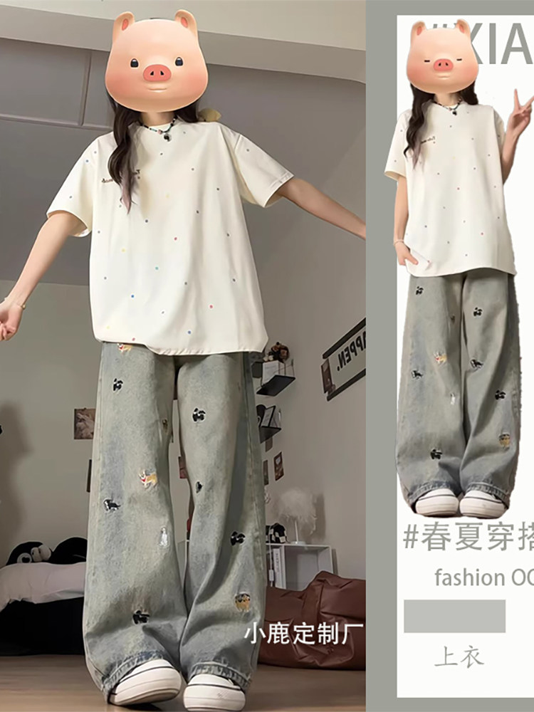 2026 is super popular, wearing a complete set of Korean apricot embroidered short-sleeved girls, junior high school student jeans, and a huge good-looking suit