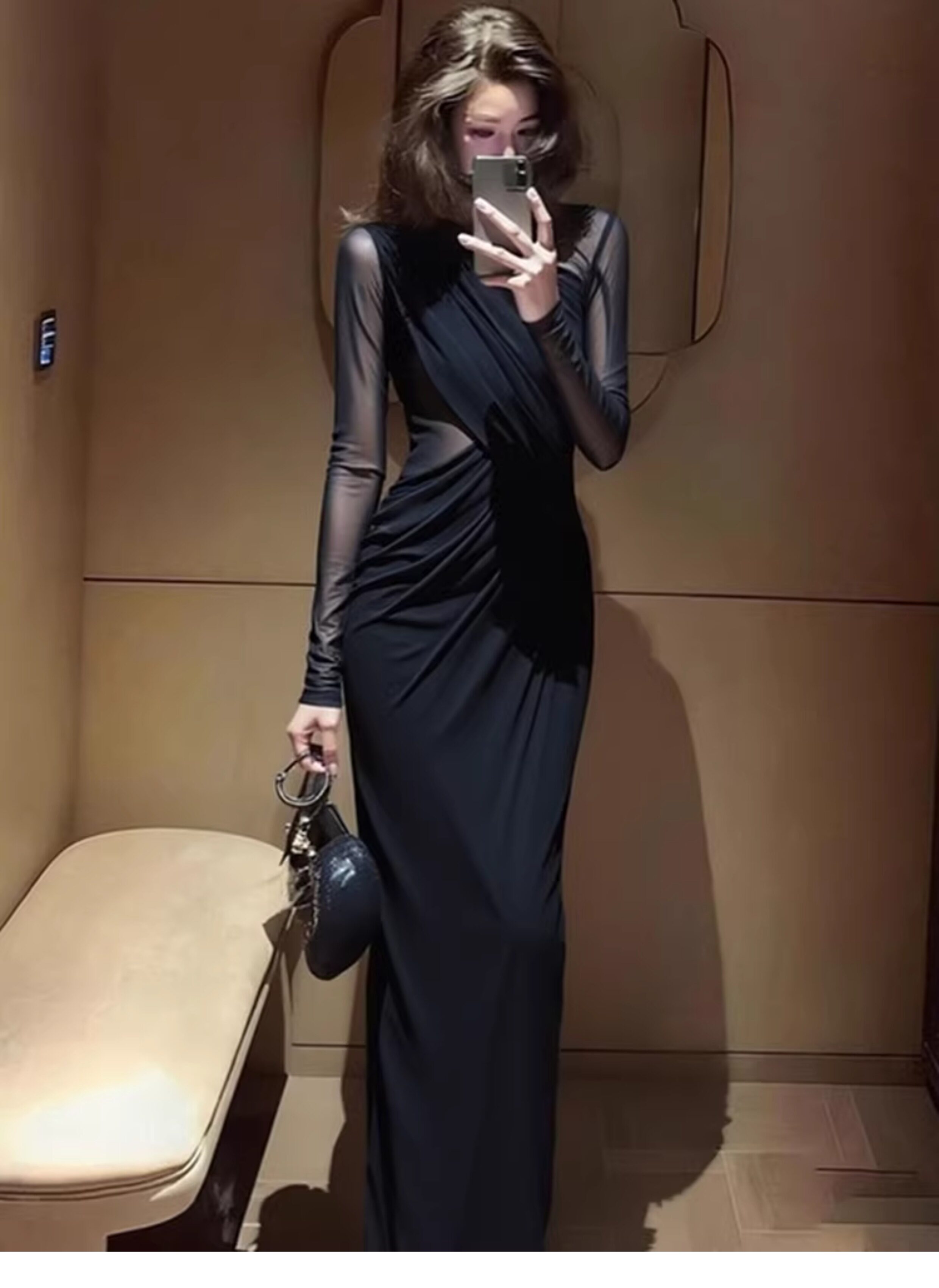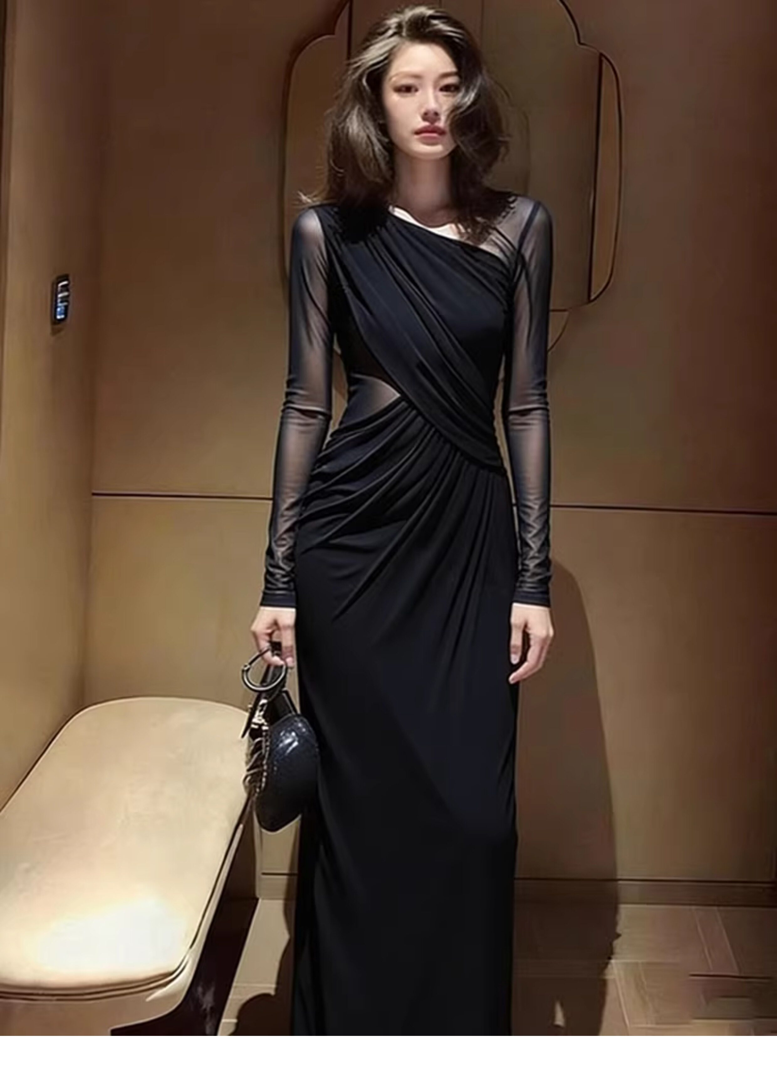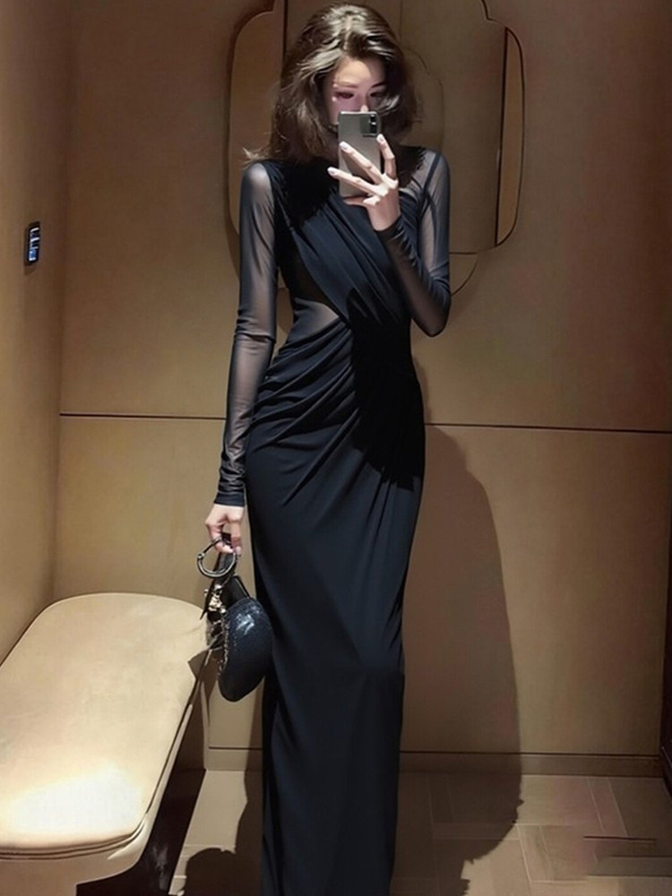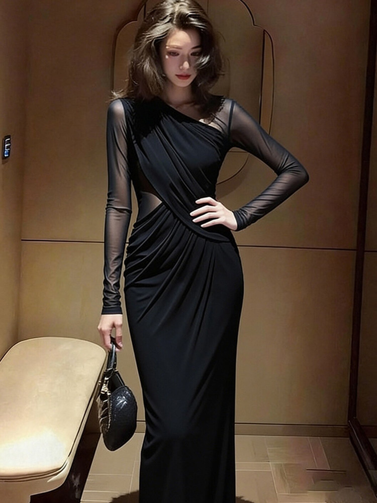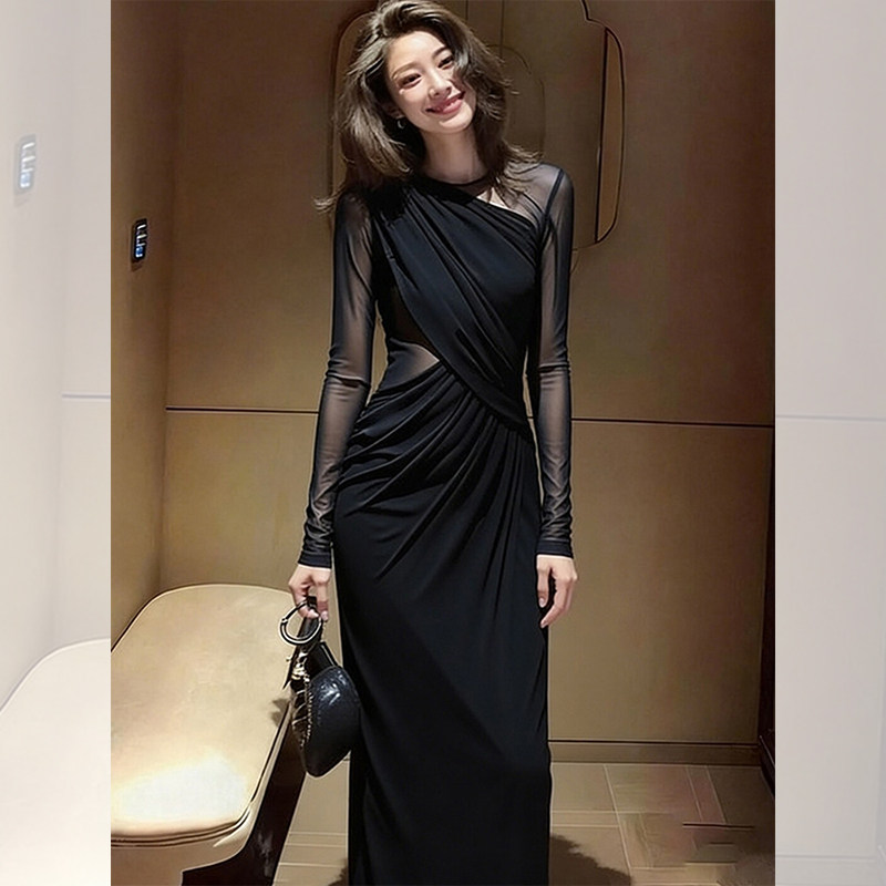 Early spring aura, strong royal sister temperament, long skirt, huge sense of luxury, beautiful Hepburn-style black dress on important occasions
