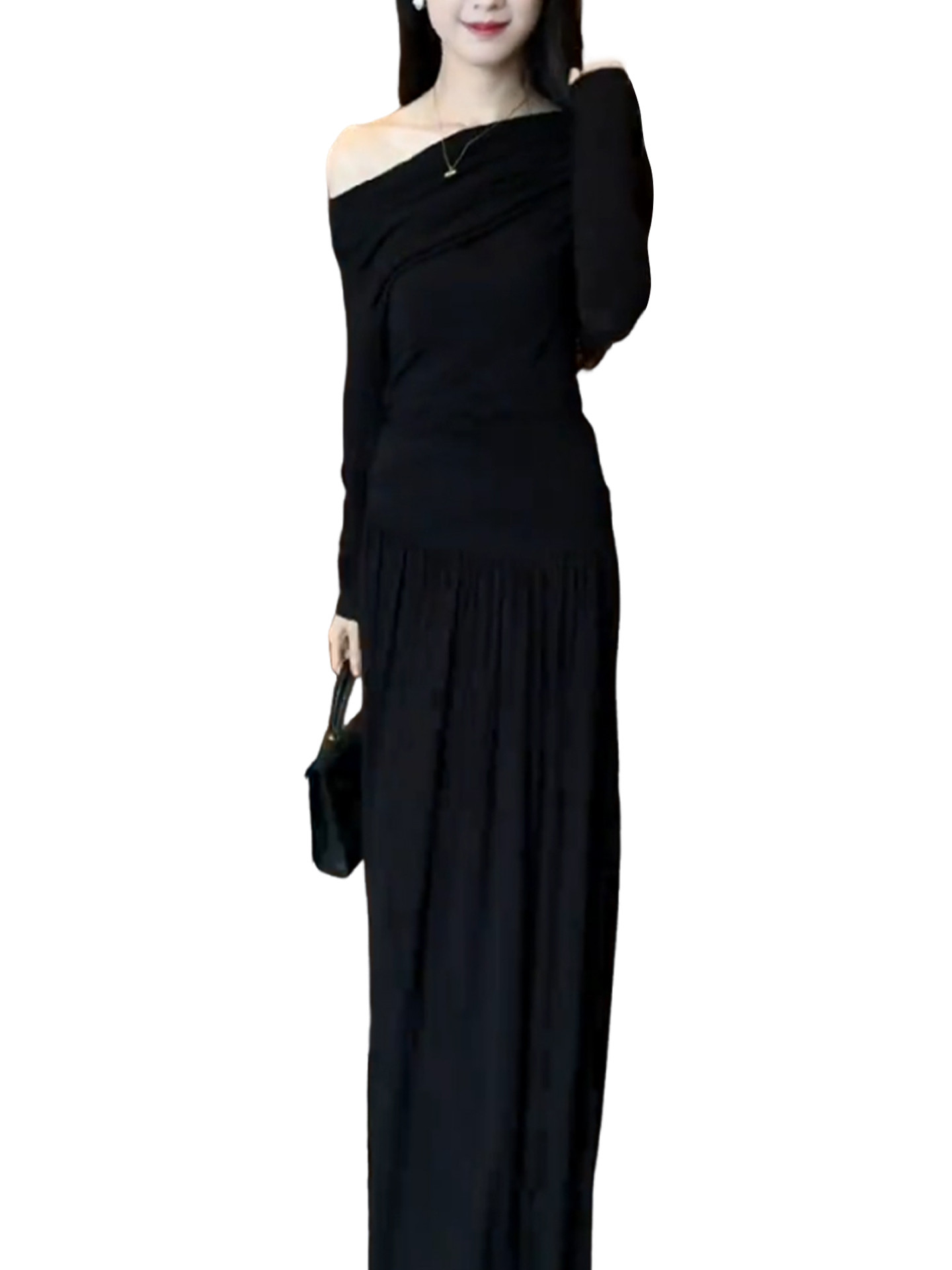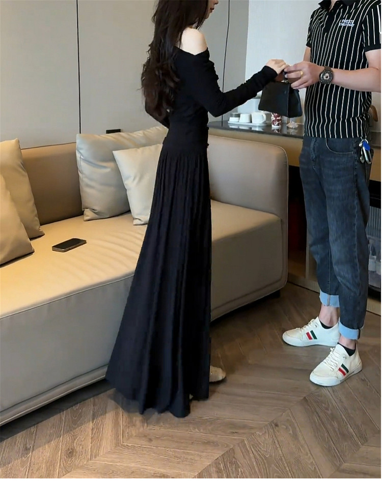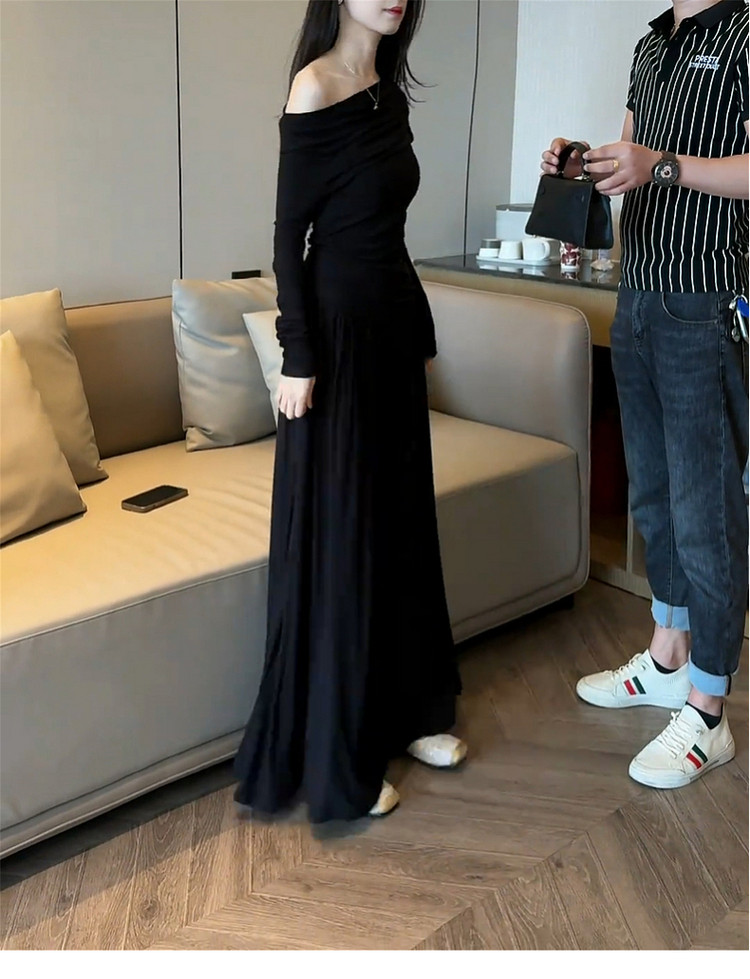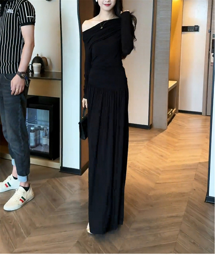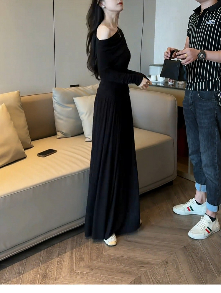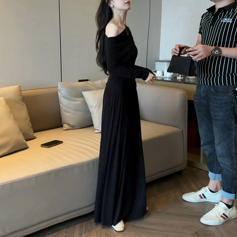 2026 new Korean black slanted shoulder knitted dress early spring lazy style outfit suit long skirt