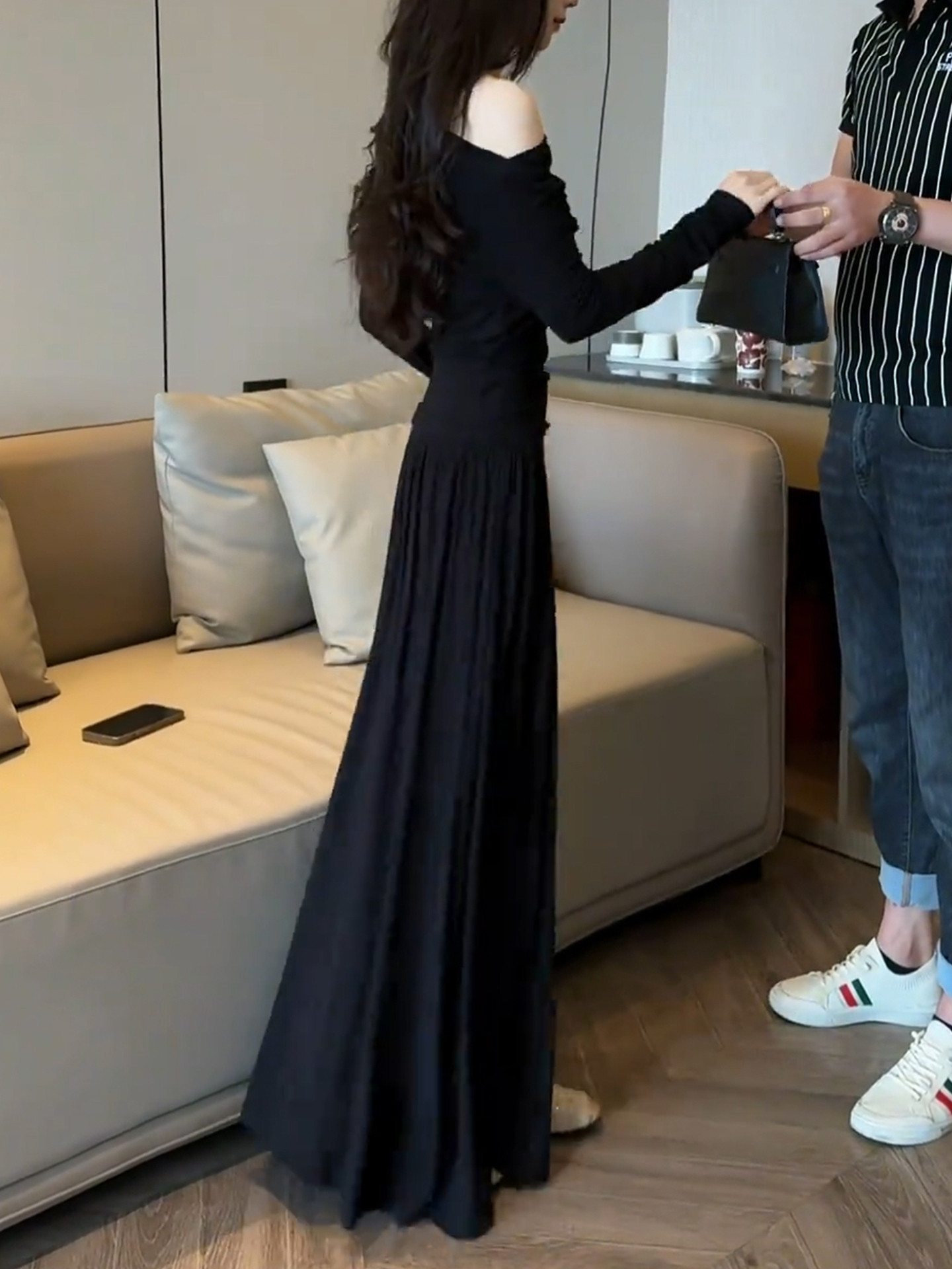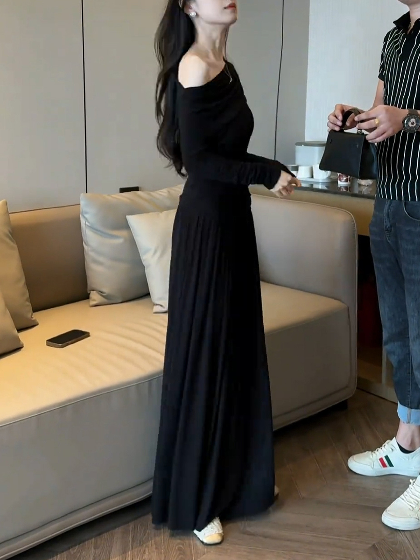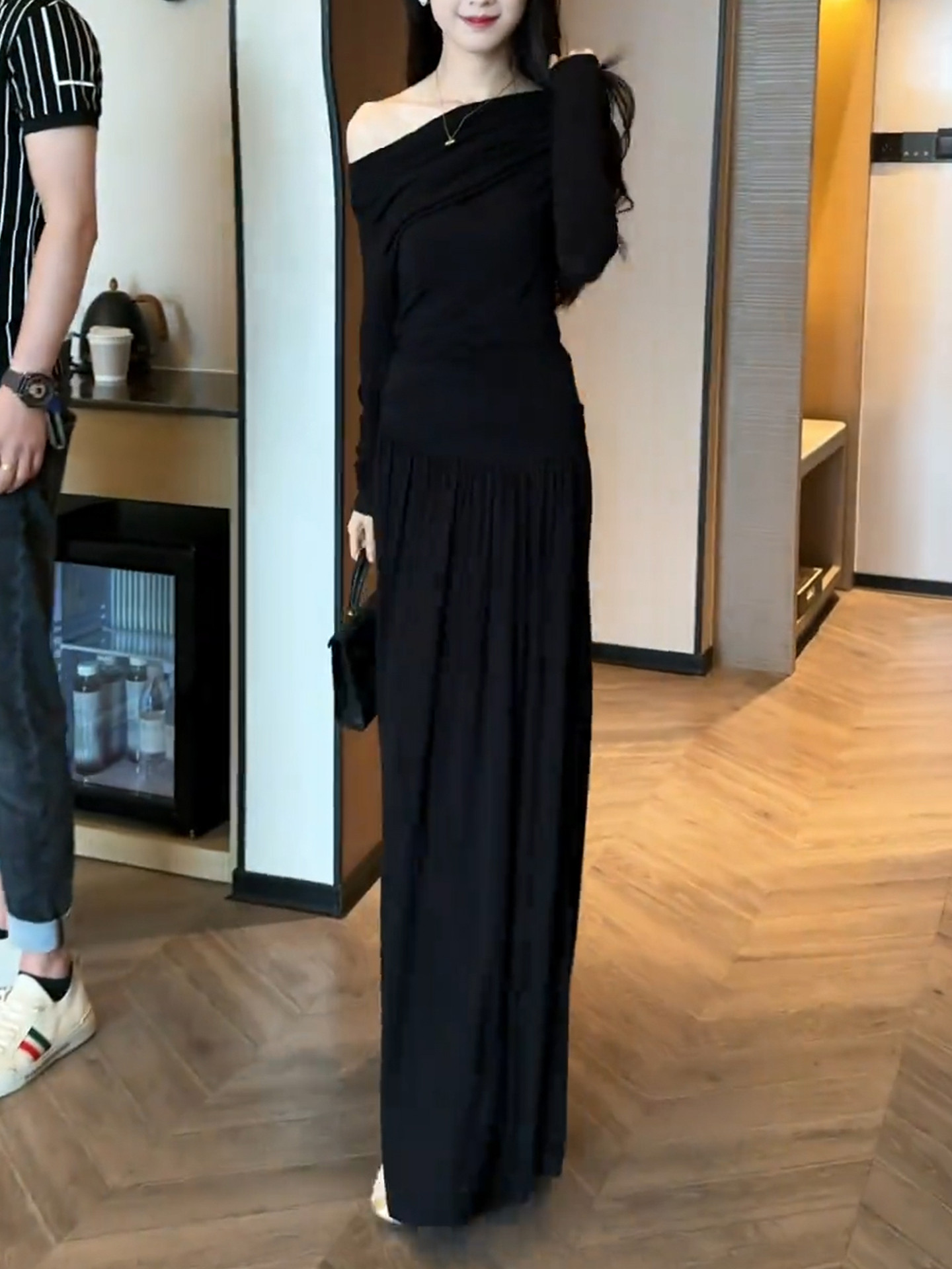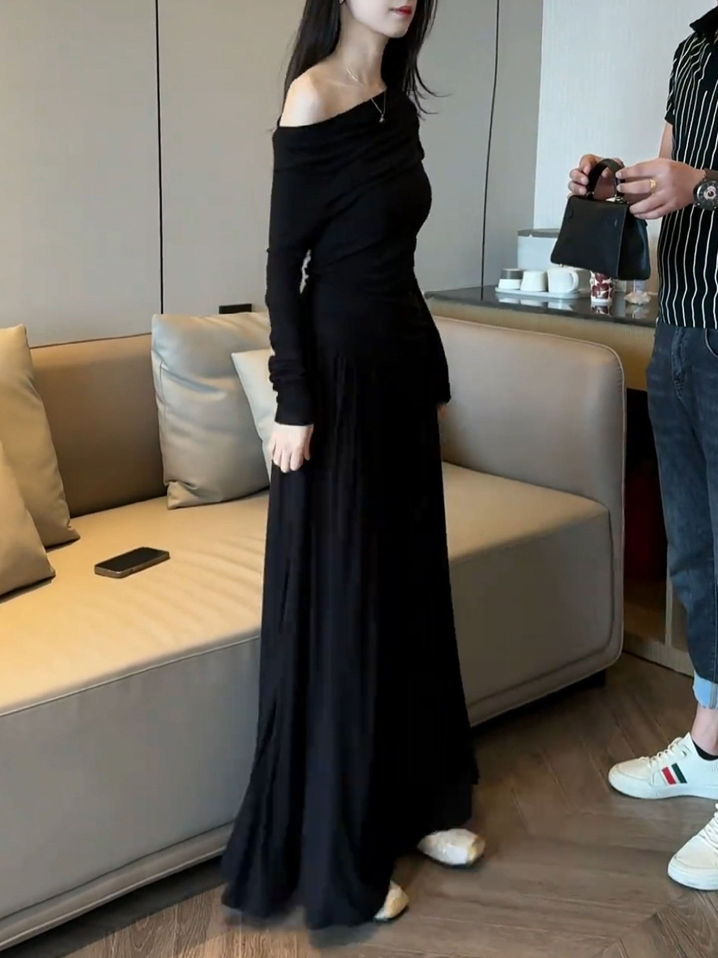 2026 new Korean black slanted shoulder knitted dress early spring lazy style outfit suit long skirt