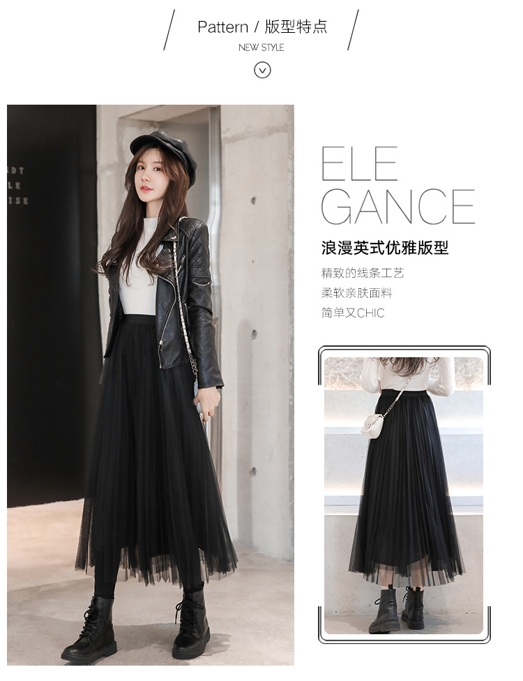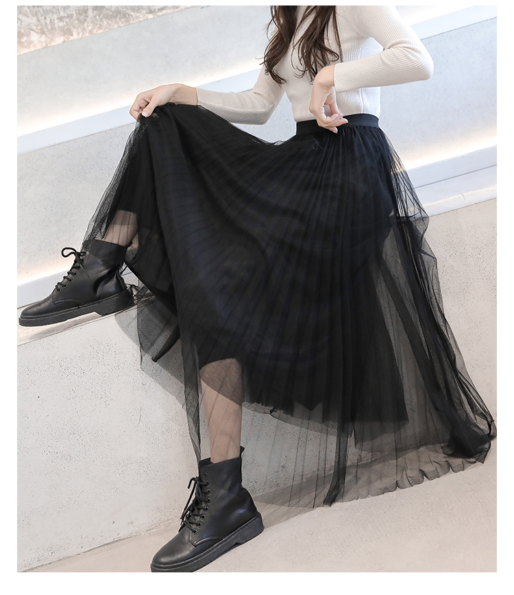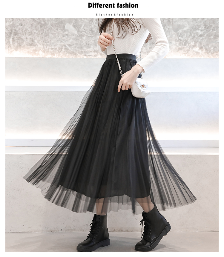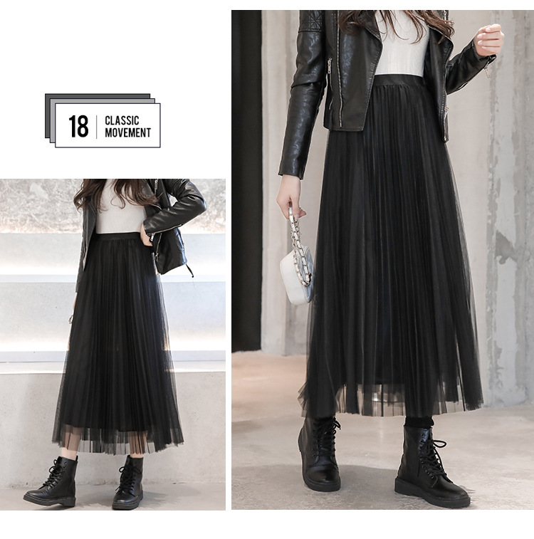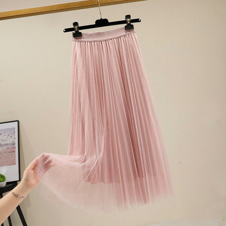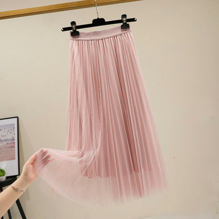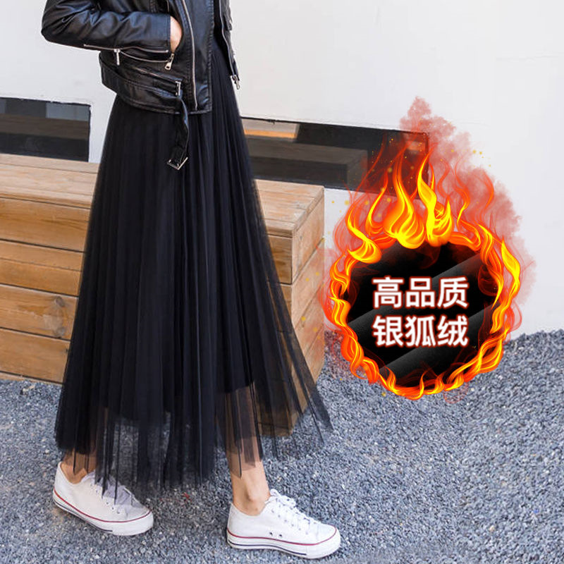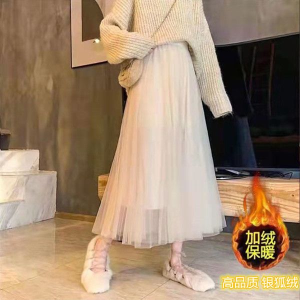 Fleece mesh skirt 2025 winter new high-waisted slimming mid-length fairy A-line pleated skirt