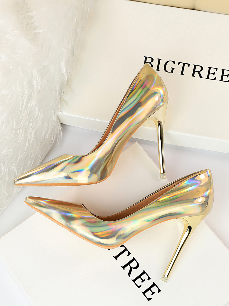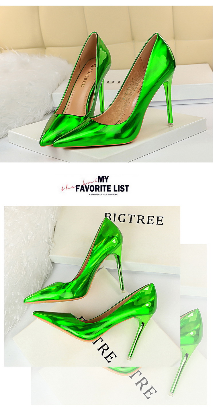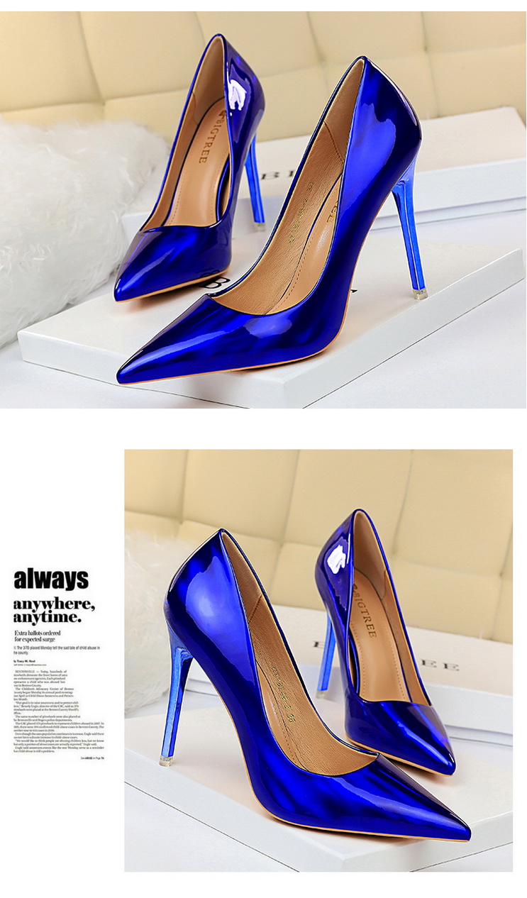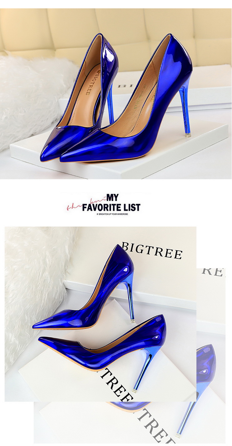 European and American shiny leather metal heel super high heels women stiletto shiny patent leather pointed toe sexy banquet nightclub large size single shoes