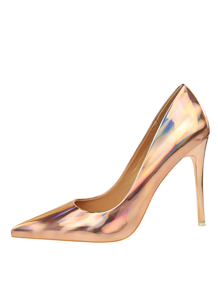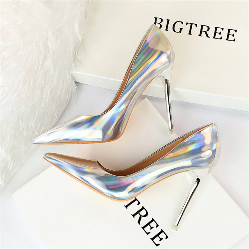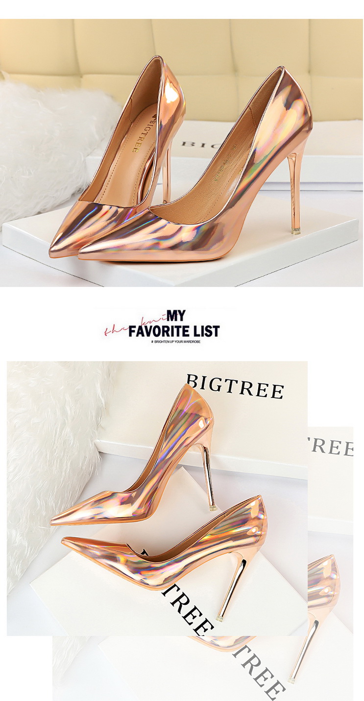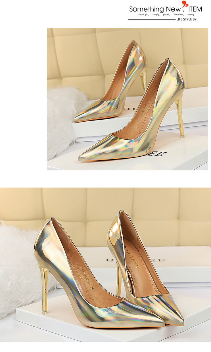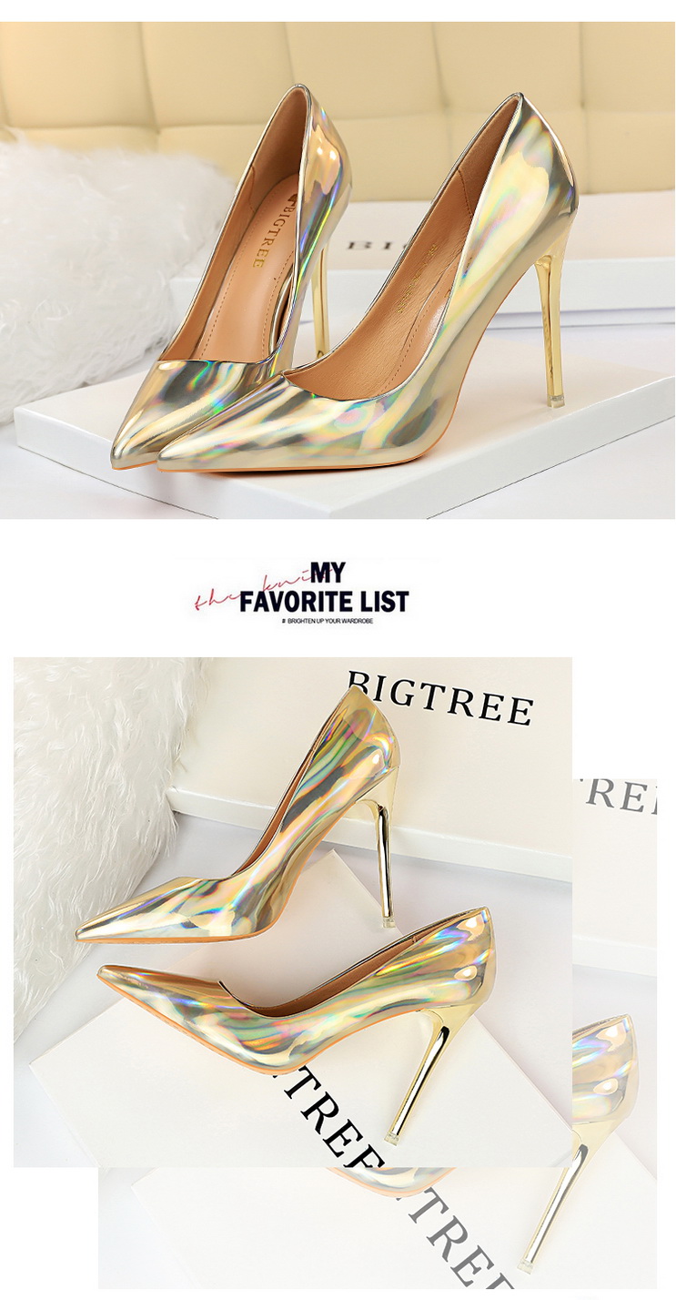 European and American shiny leather metal heel super high heels women stiletto shiny patent leather pointed toe sexy banquet nightclub large size single shoes