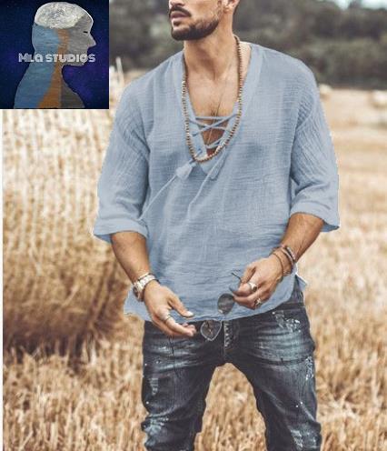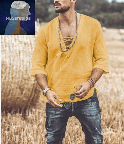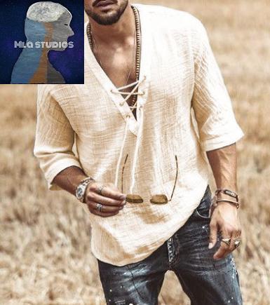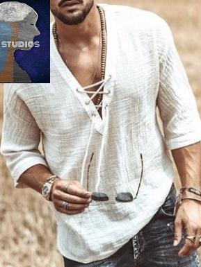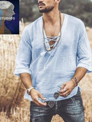 MeN SHirtS Men's Loose V-Neck Drawstring Shirt Quarter Sleeve 2025 New European and American Casual Men's Top