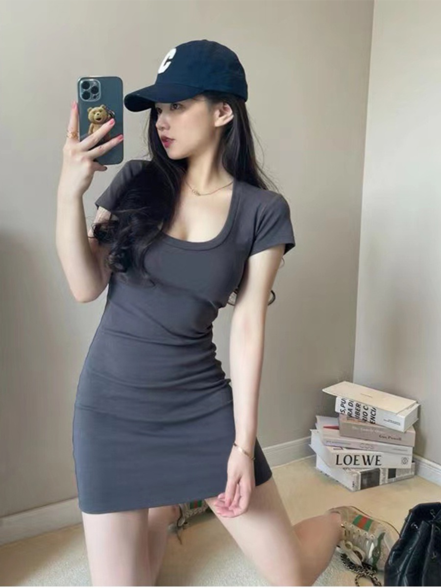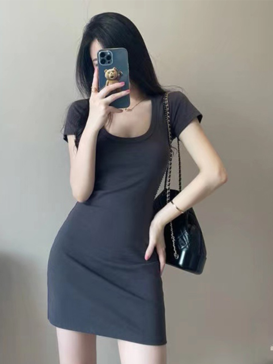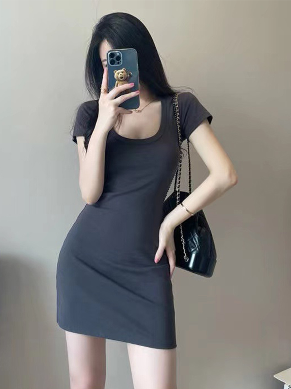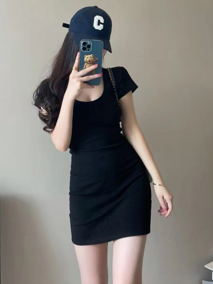 Pure lust U neck low cut t-shirt hip skirt black dress women's tight sexy short skirt slim thin bottom skirt