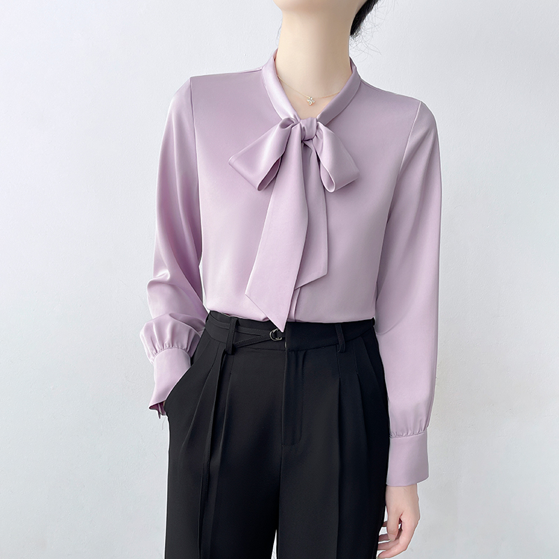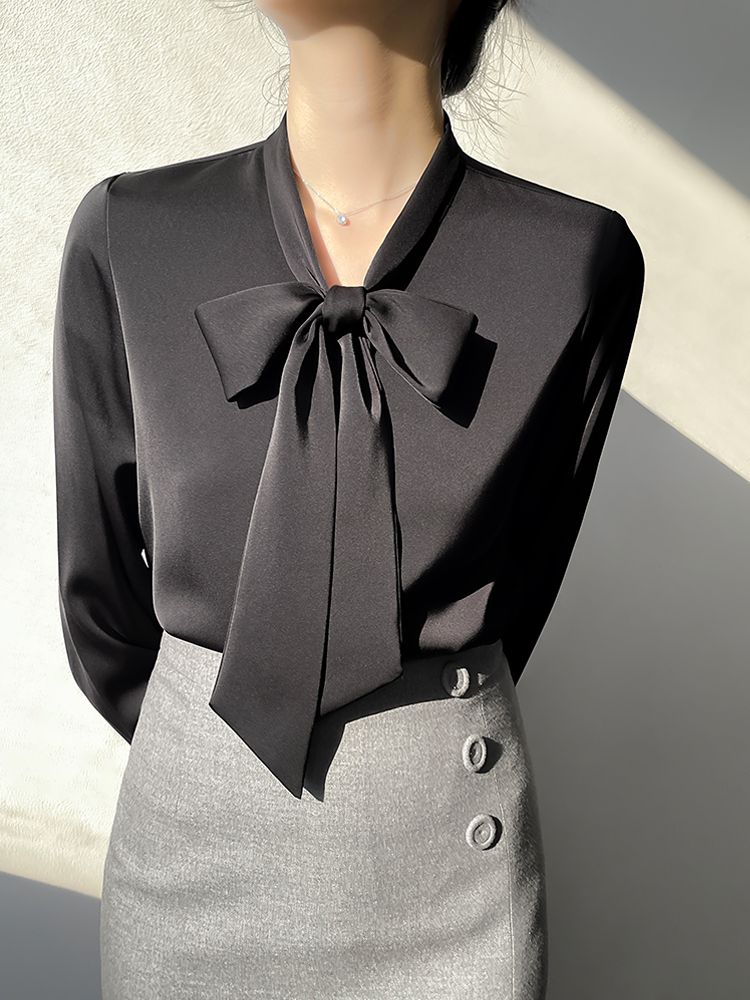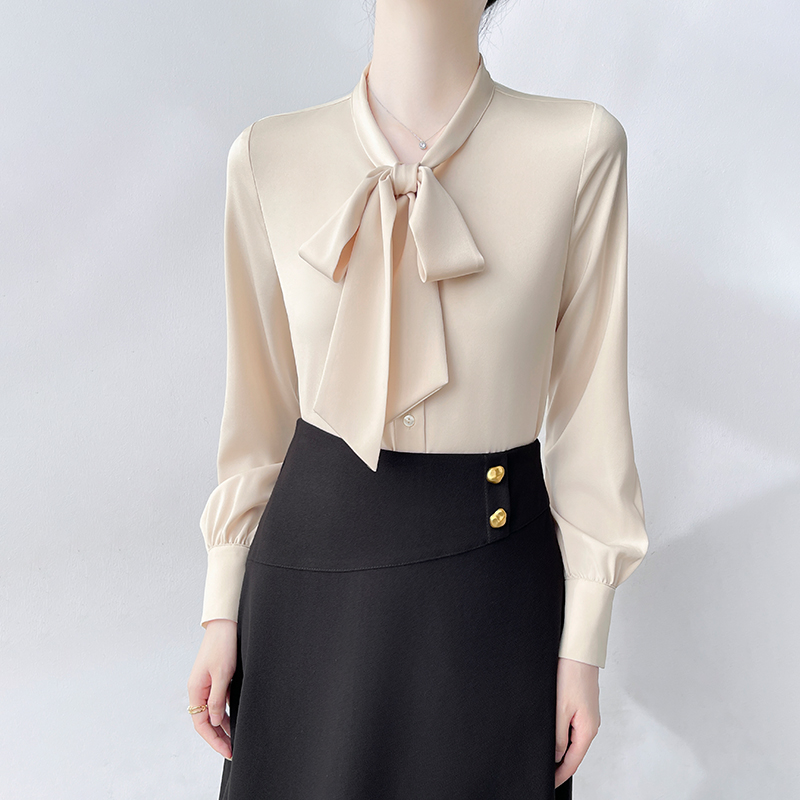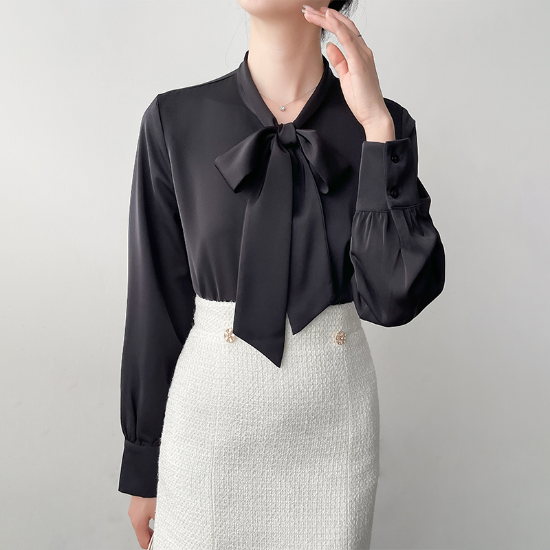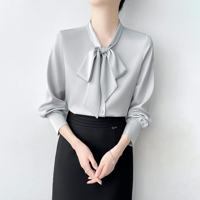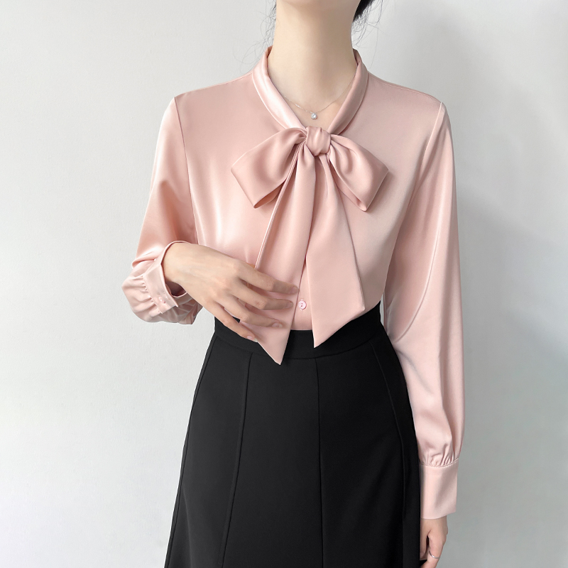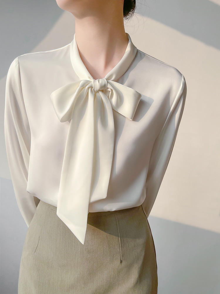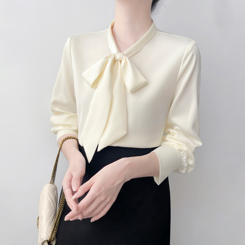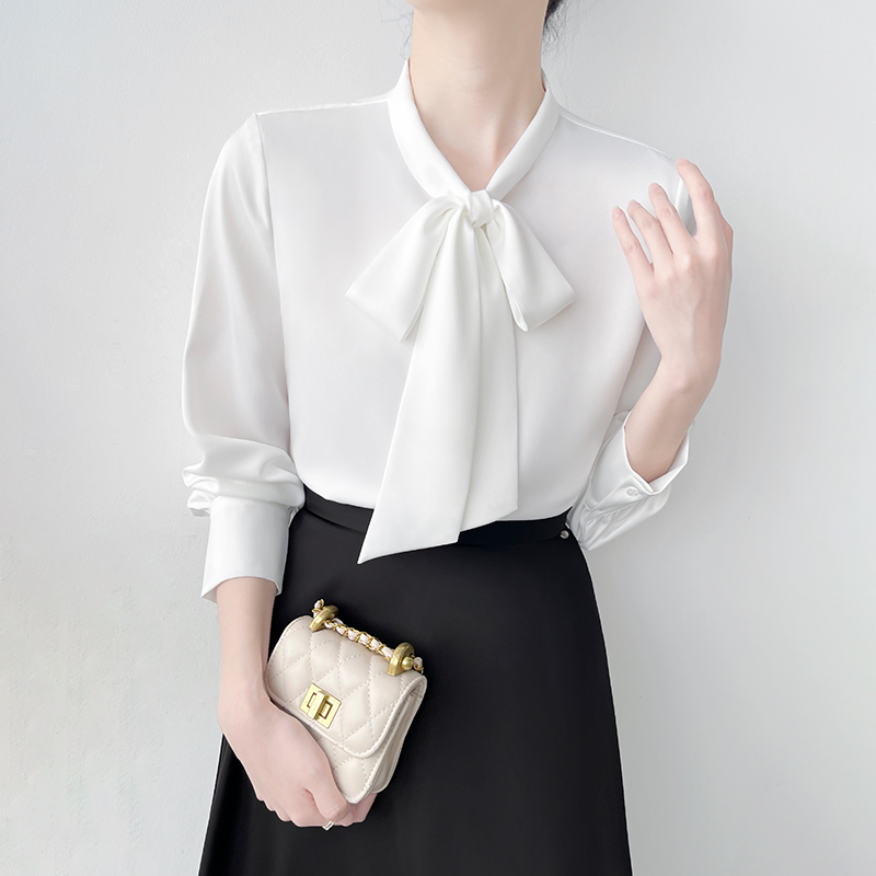 Han Bo Ya Satin White Shirt Women's Pre-Autumn Long Sleeve Commuter Professional Shirt Temperament Bow Streamer Top