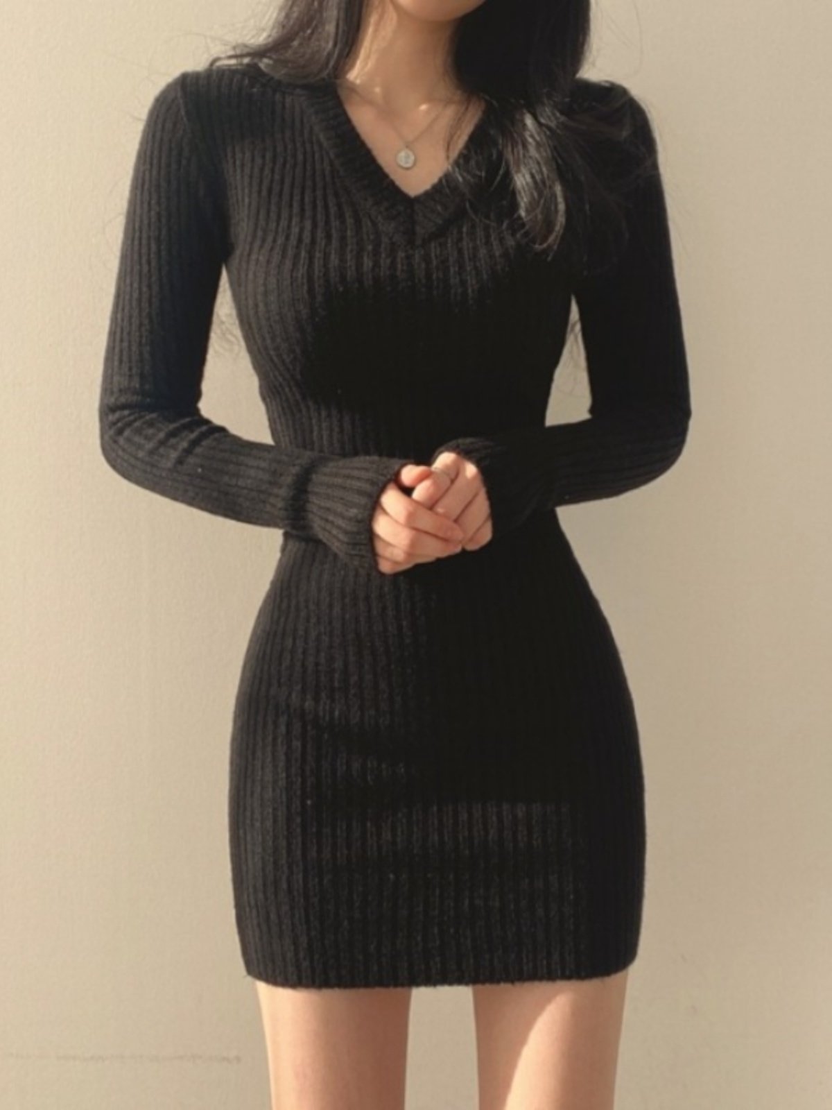 2025 Fall/Winter New Knitted Dress Women's Long Sleeve V-Neck Inner Wearing Sexy Hip Bottom Sweater Skirt Thickened
