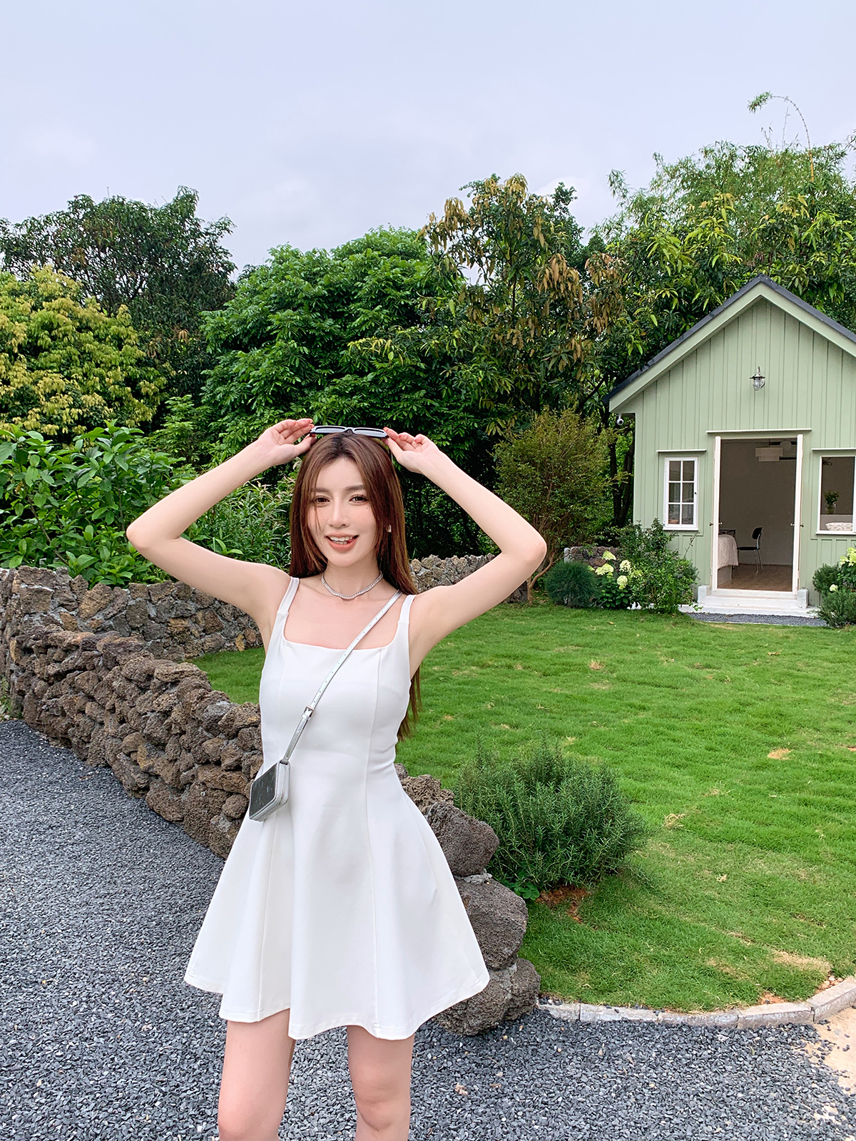 Light cloth tone: tall A-line skirt, spring and summer, square neck, high waist, thin temperament, elastic waist, little black skirt, sundress