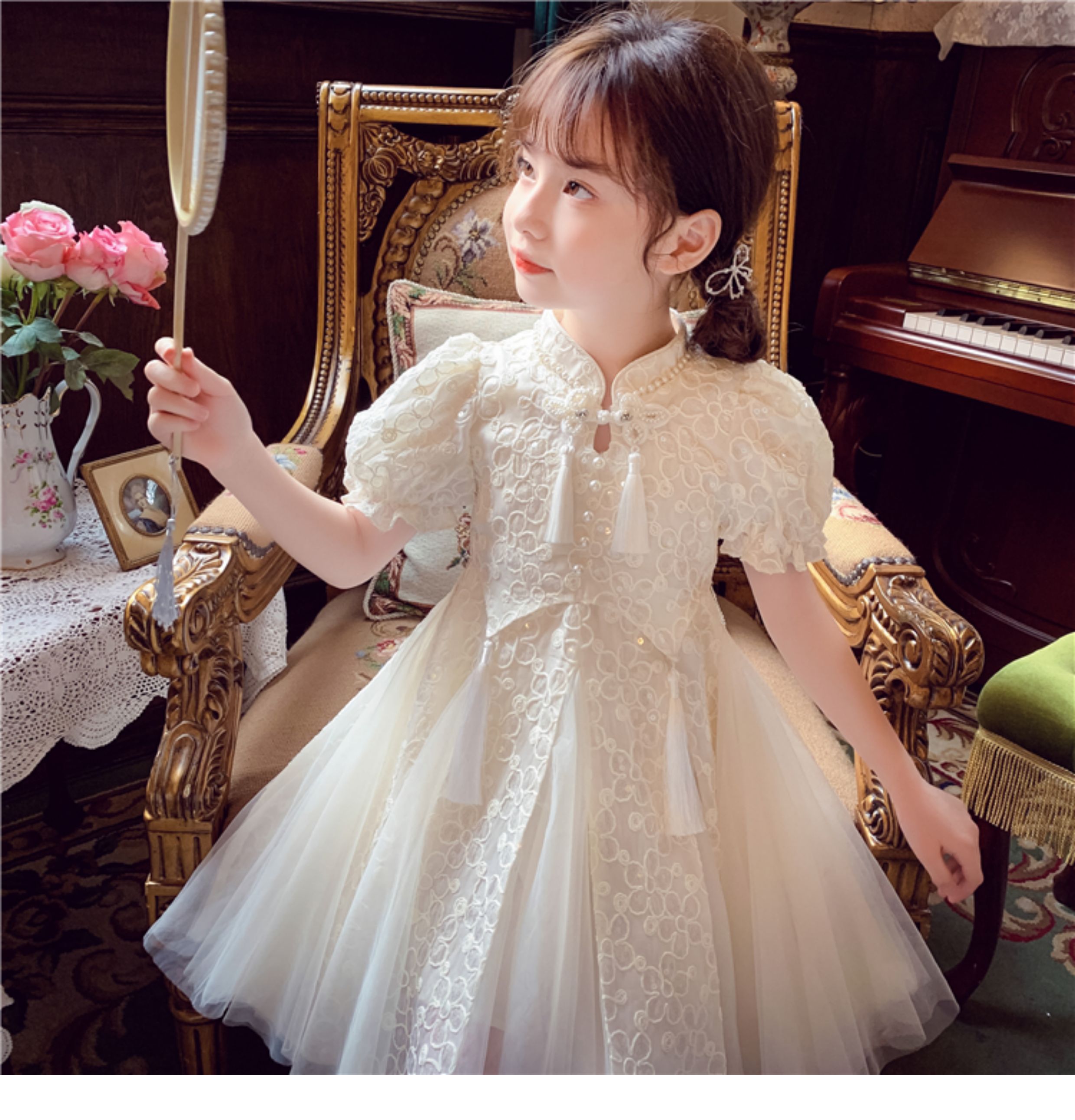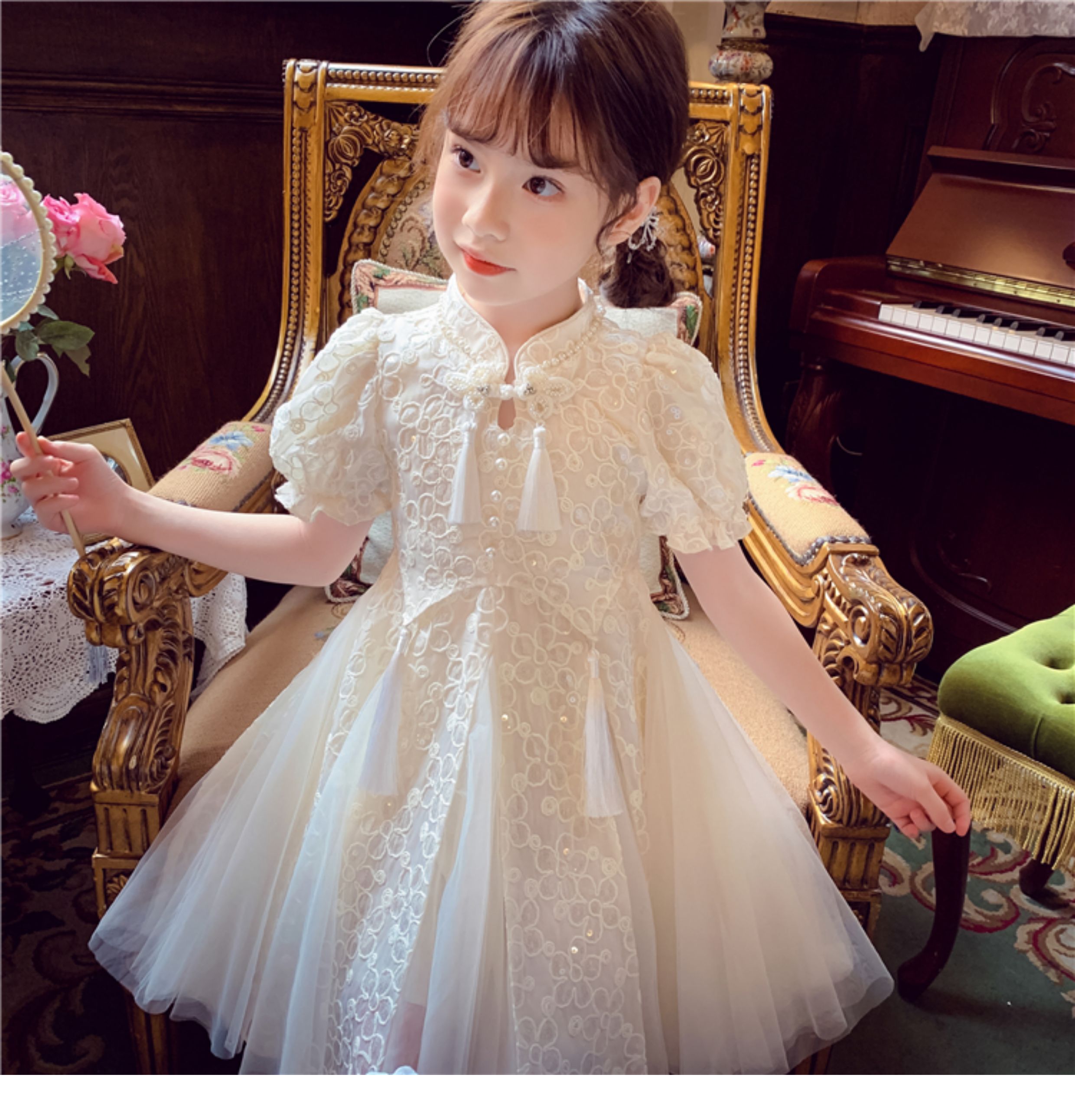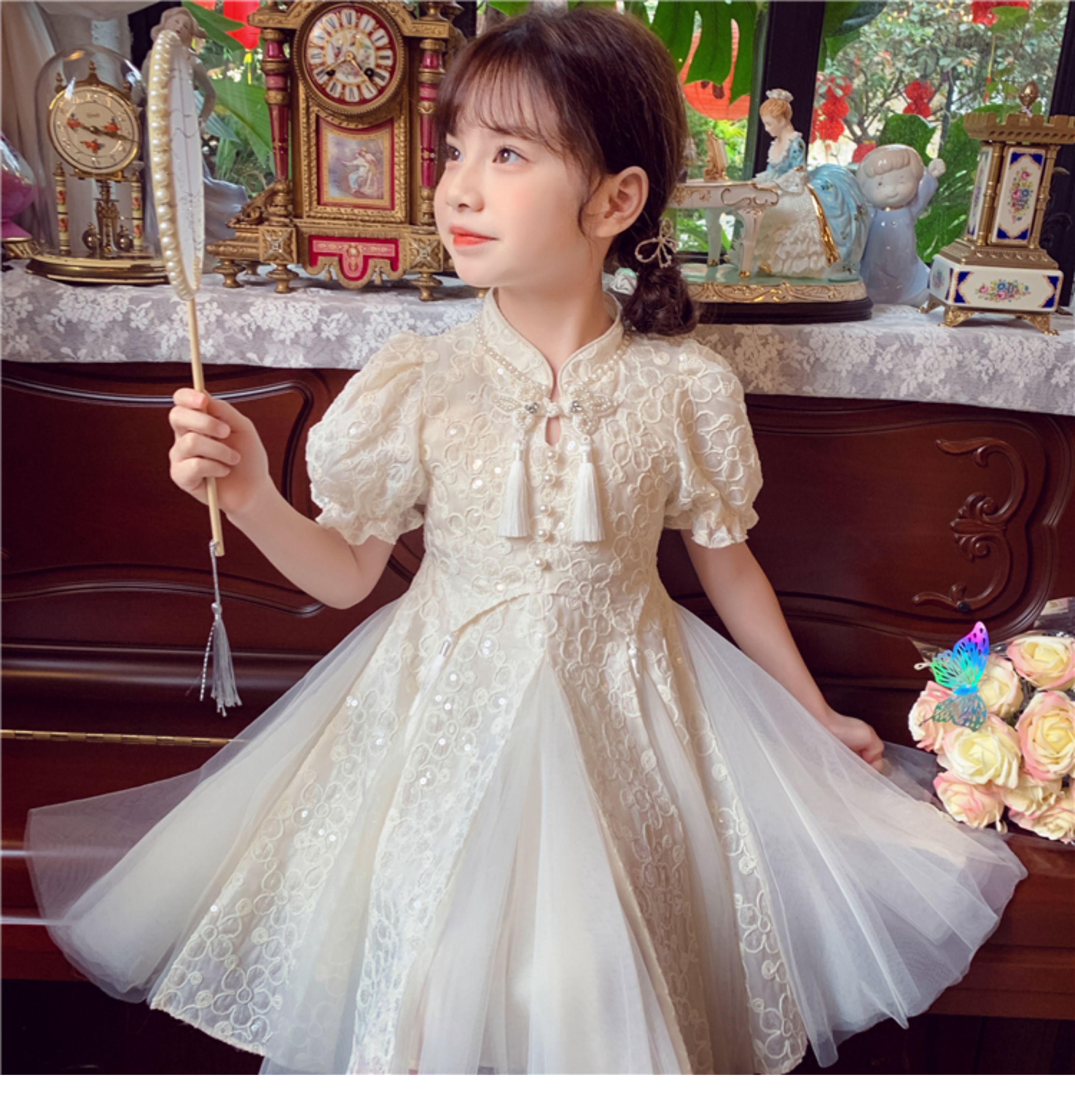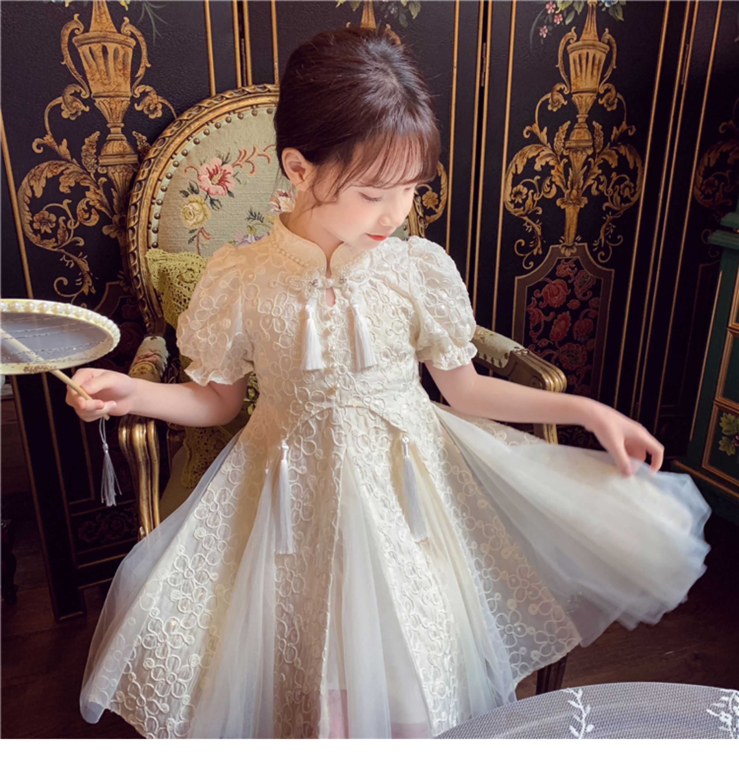Girls Dress New Chinese Style Children's Hanfu Summer Dress 2025 New Girl Cheongsam Puff Sleeve Mesh Princess Dress