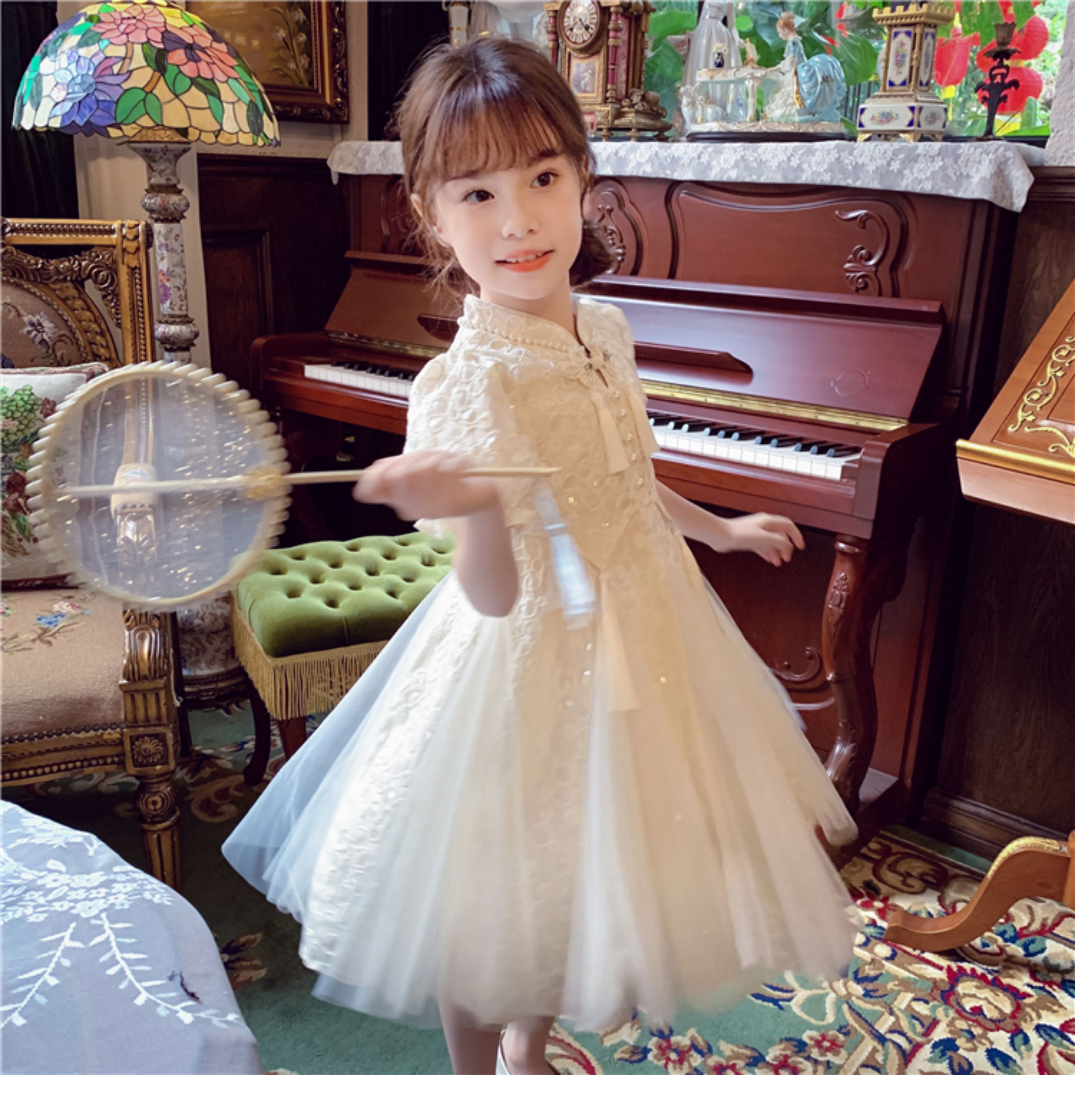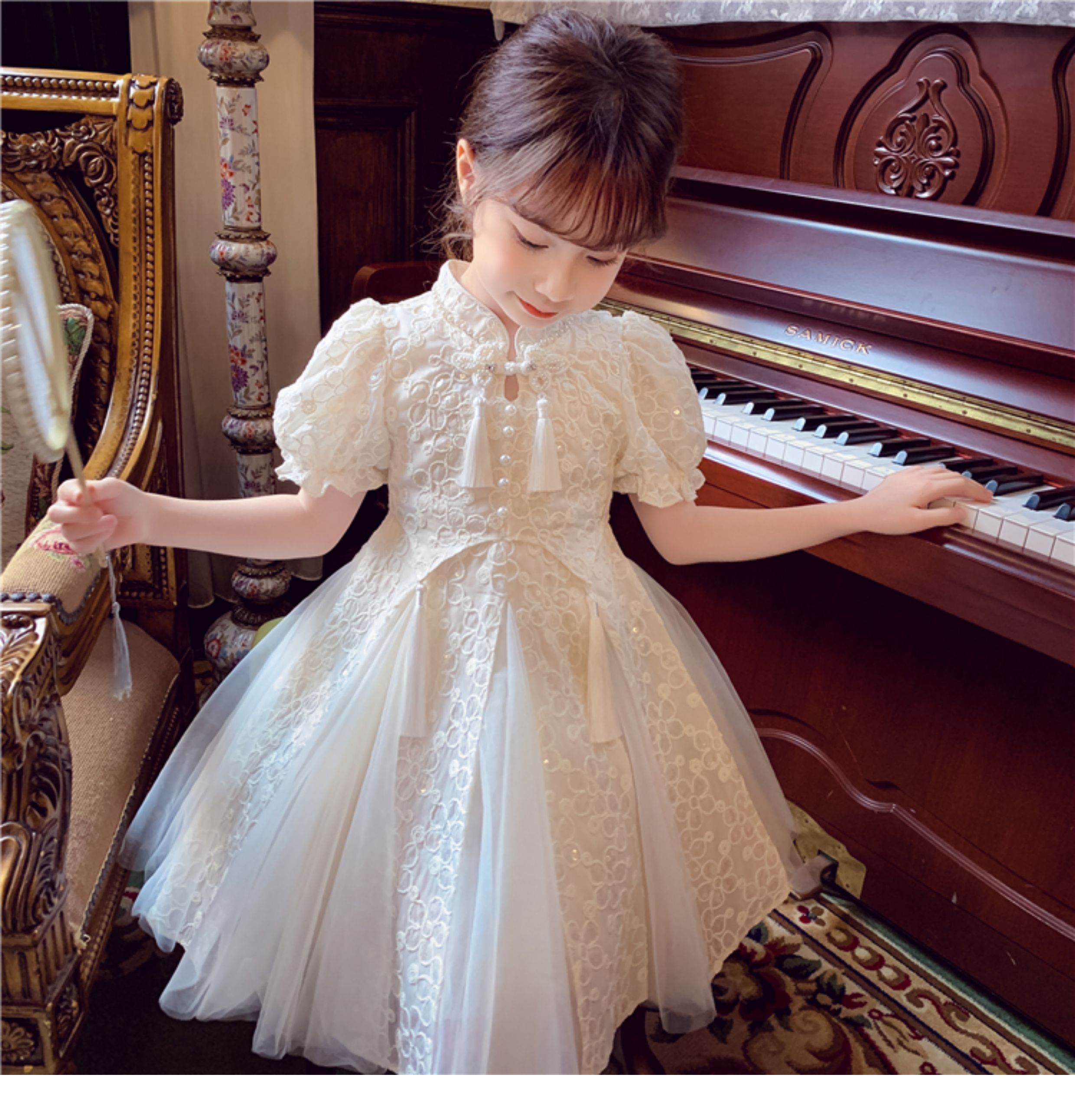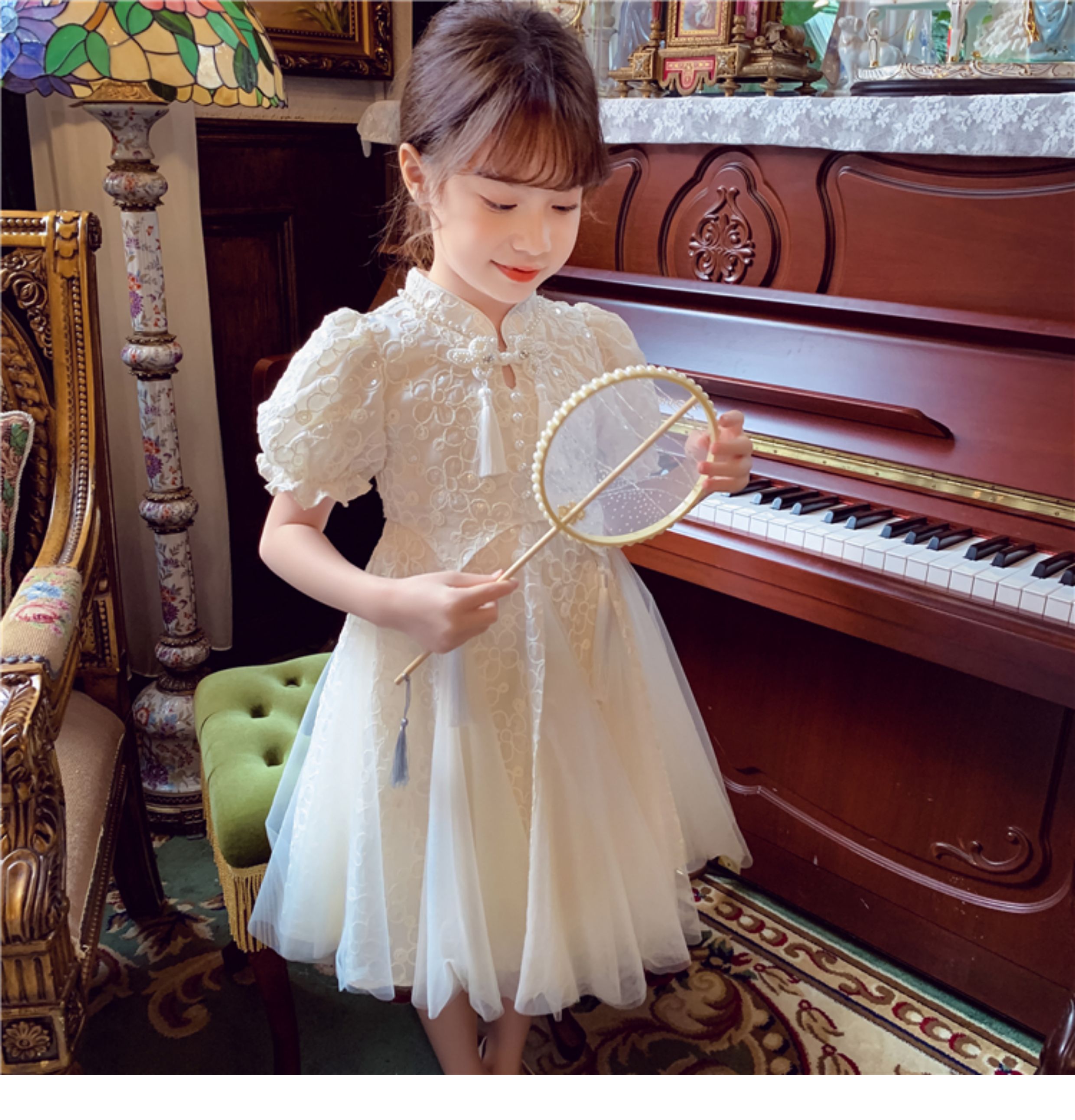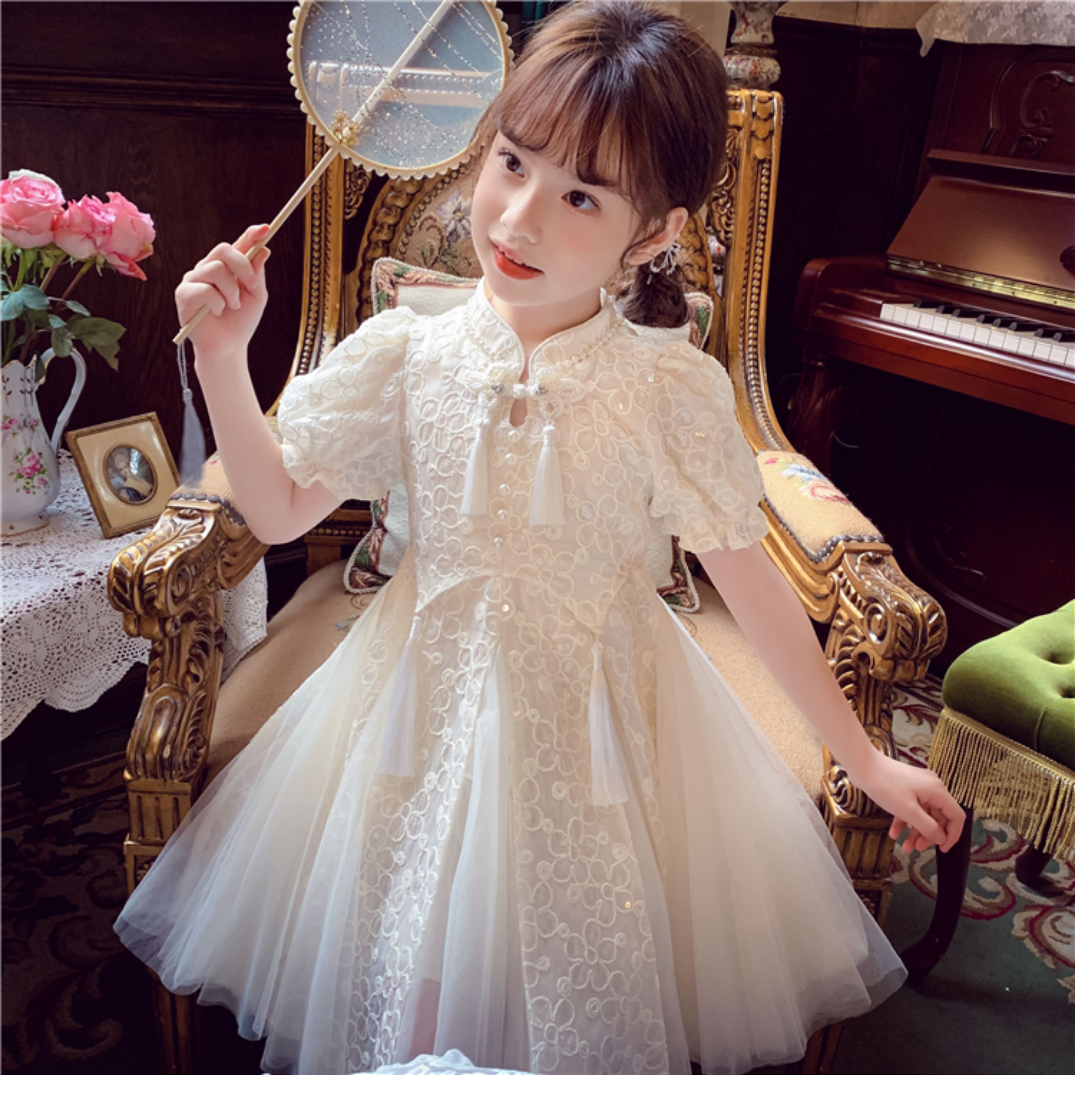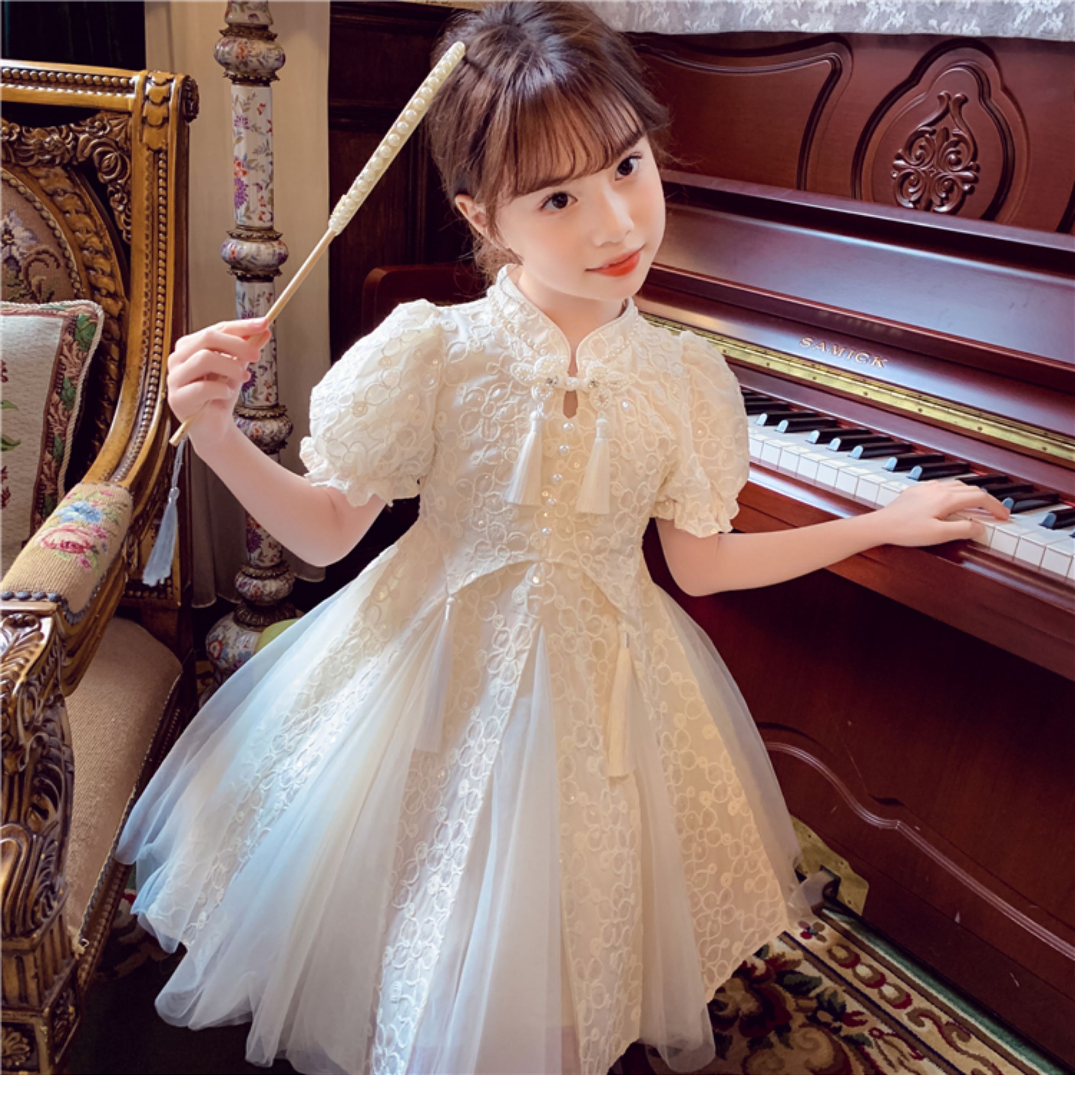 Girls Dress New Chinese Style Children's Hanfu Summer Dress 2025 New Girl Cheongsam Puff Sleeve Mesh Princess Dress