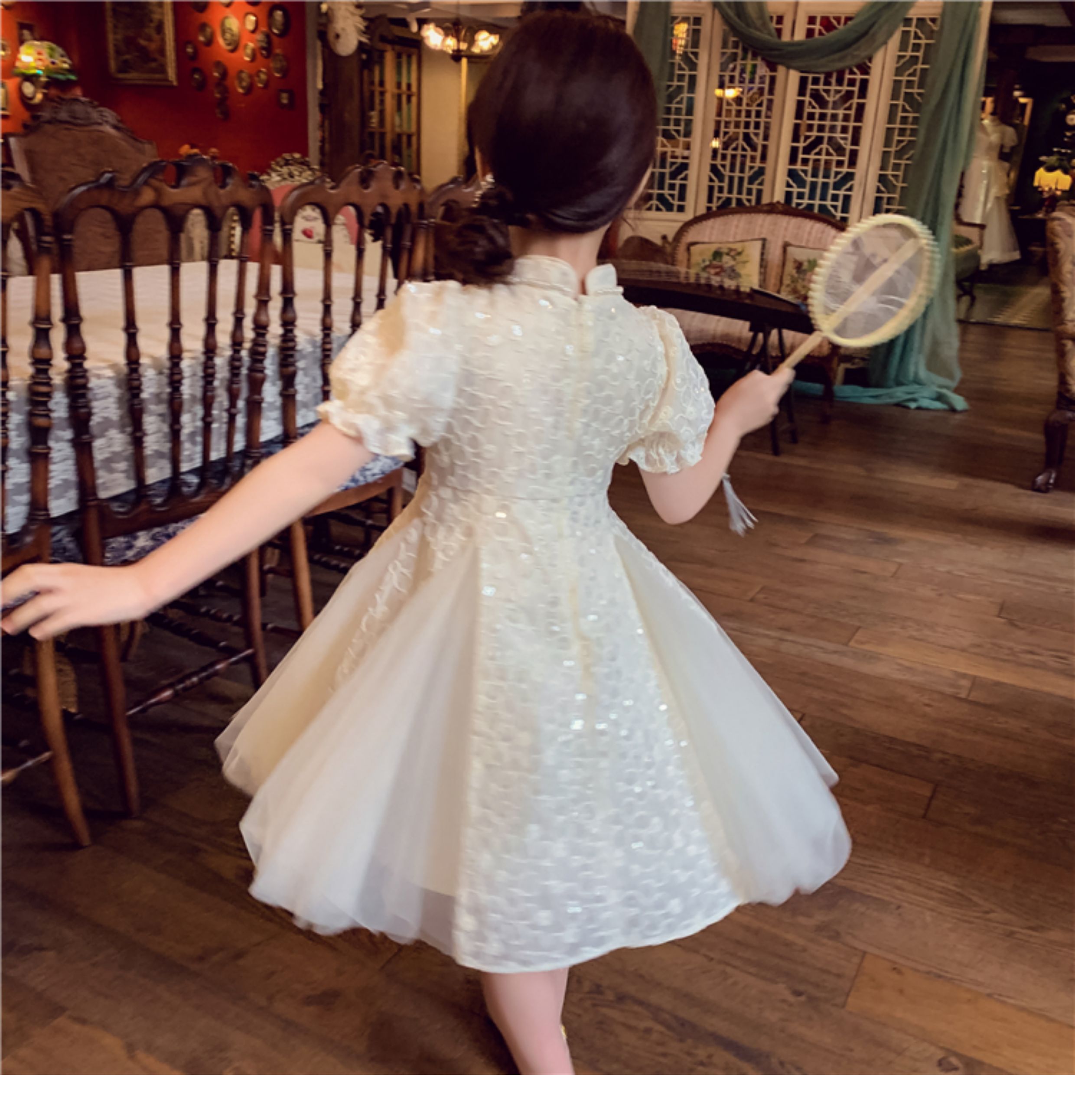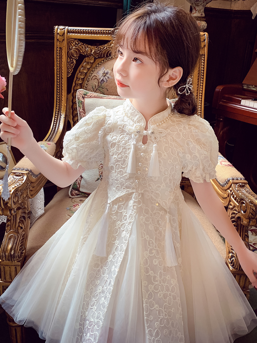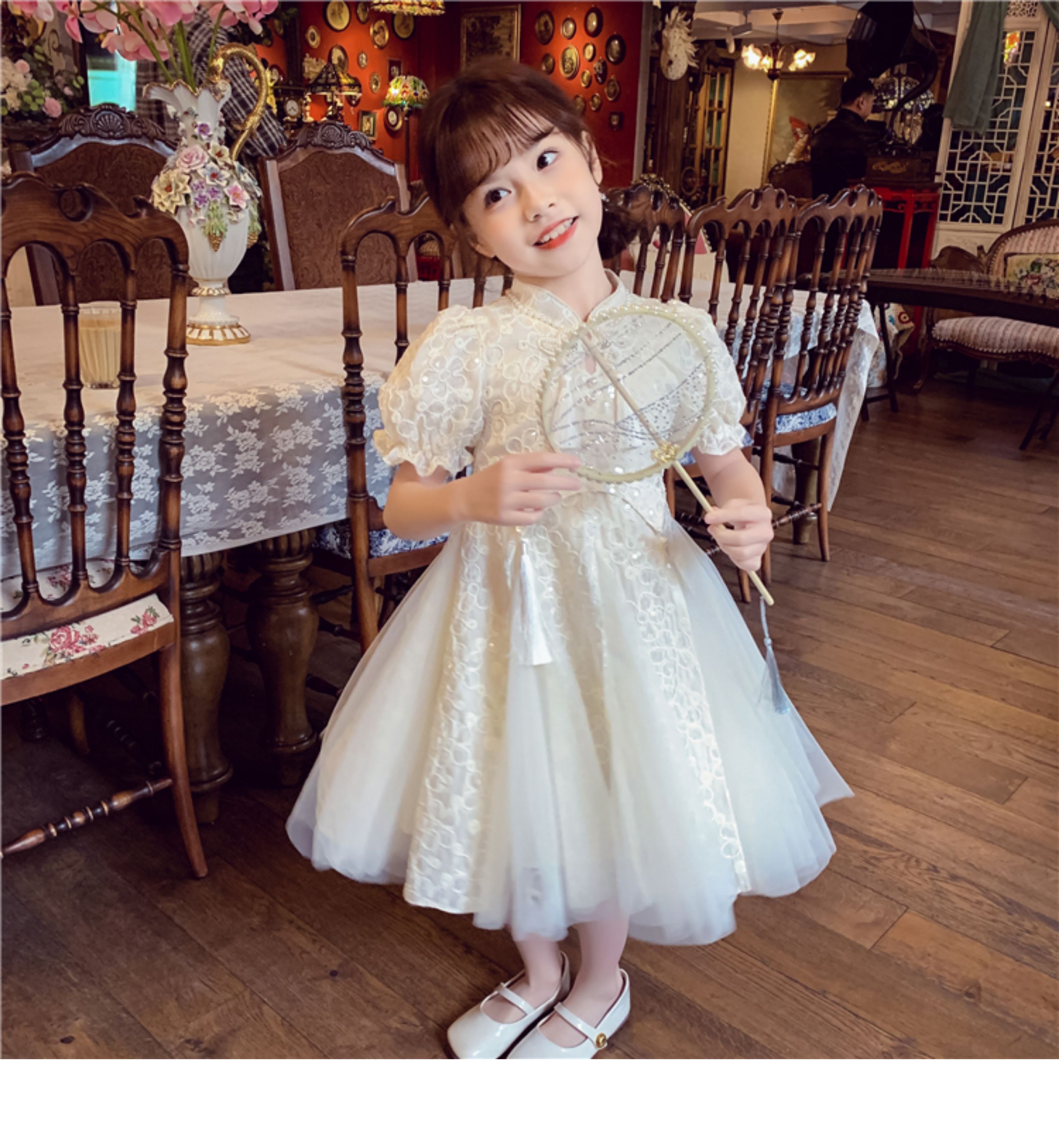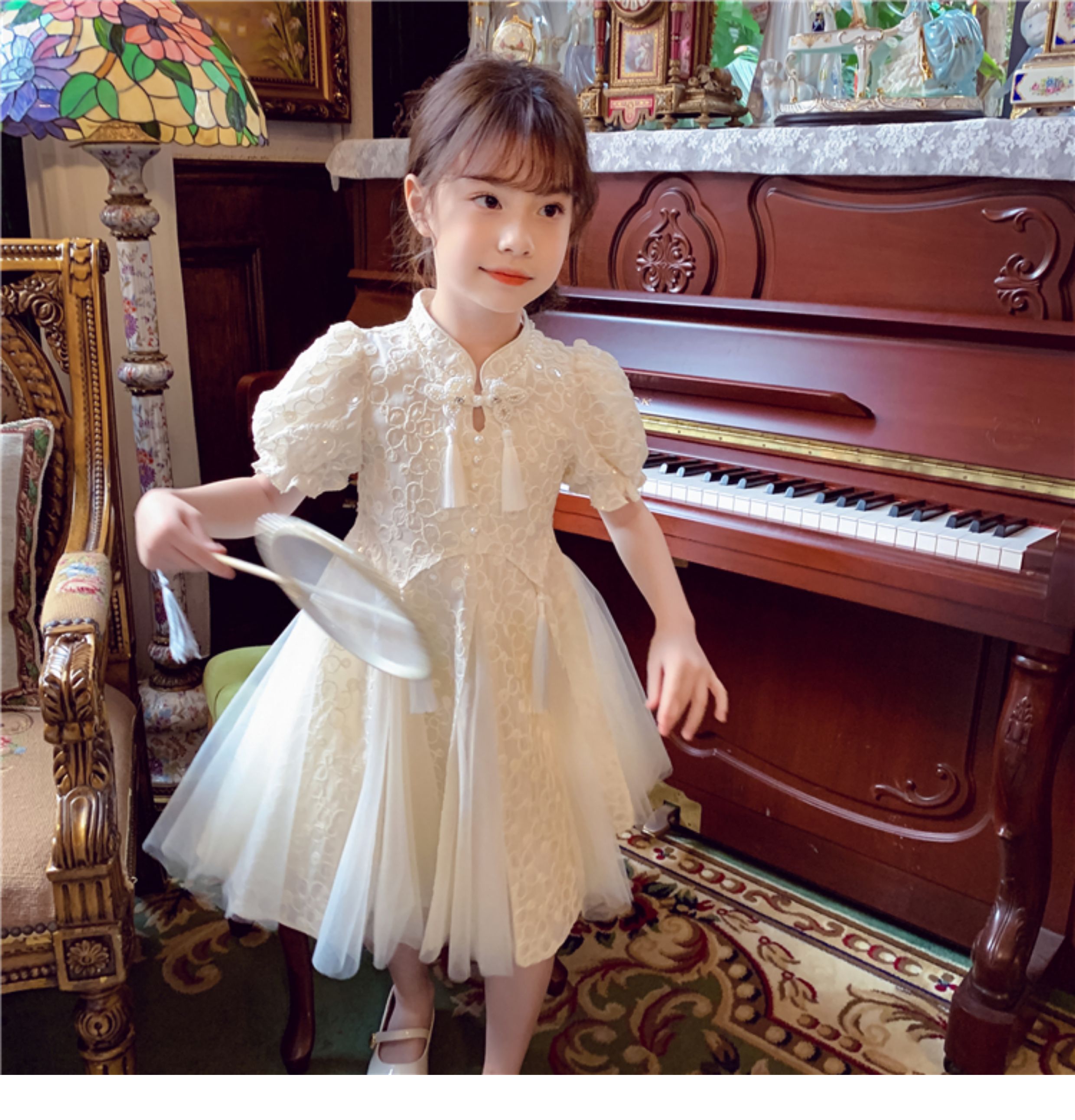 Girls Dress New Chinese Style Children's Hanfu Summer Dress 2025 New Girl Cheongsam Puff Sleeve Mesh Princess Dress