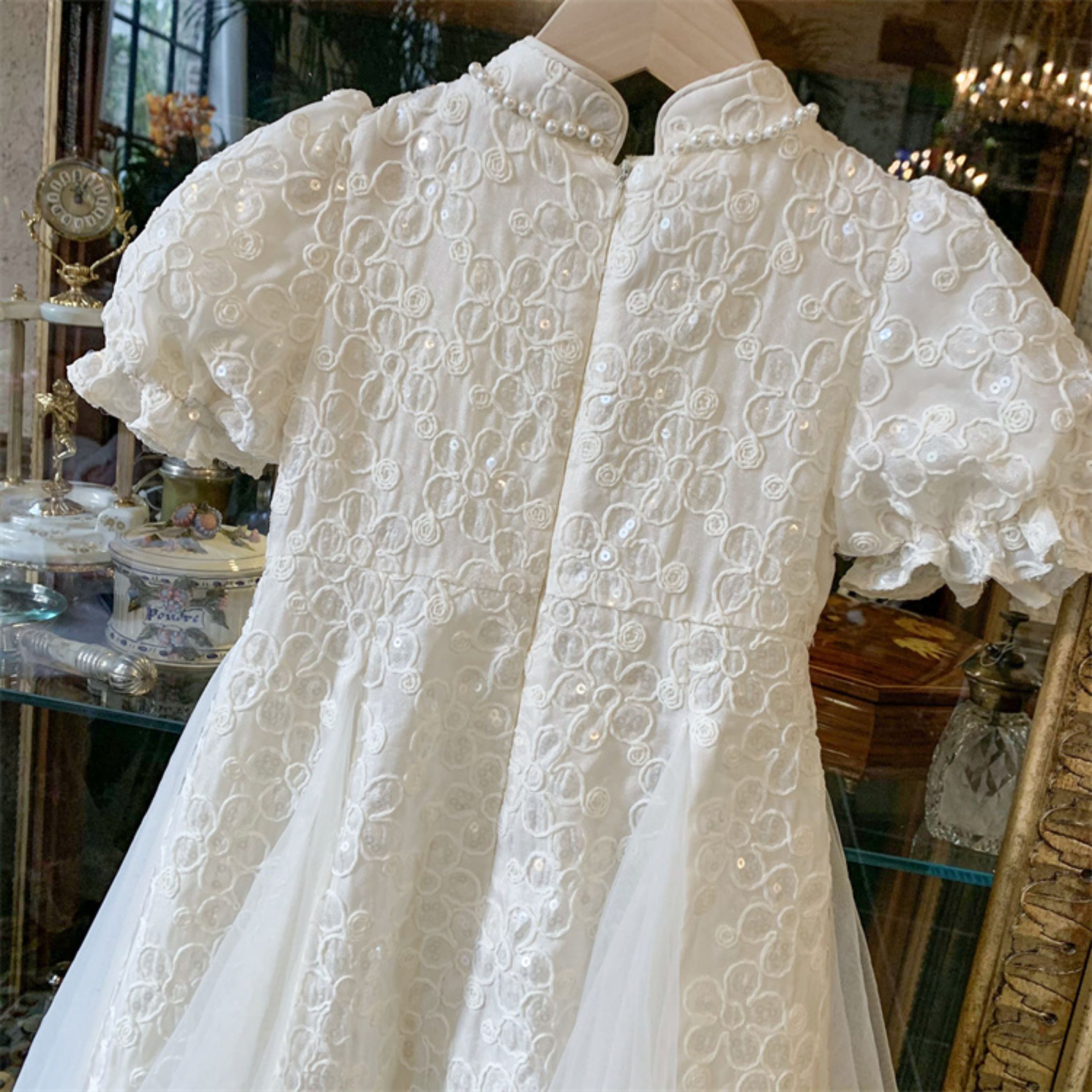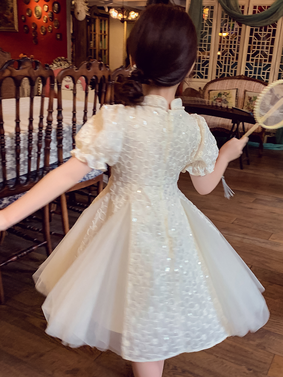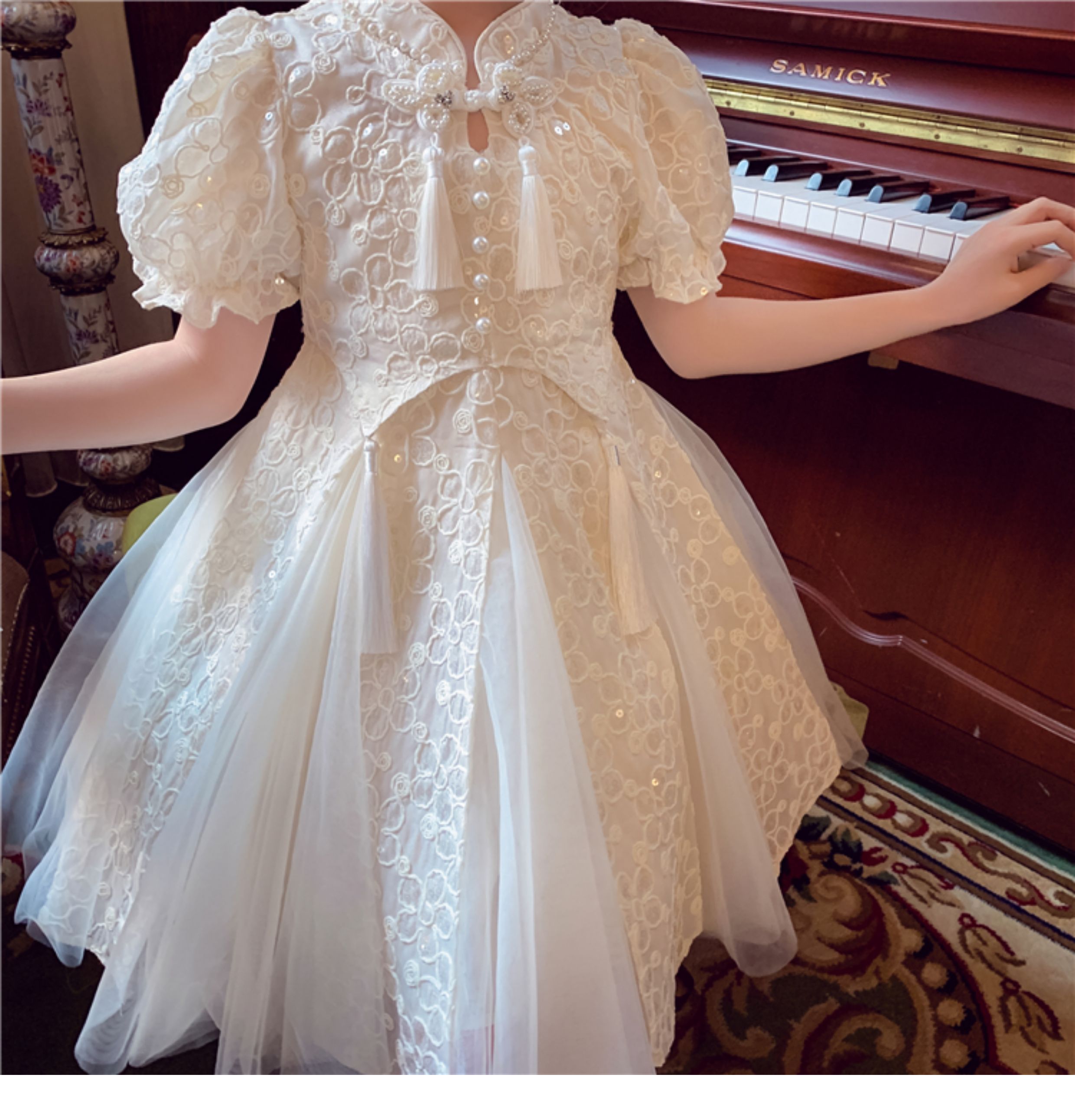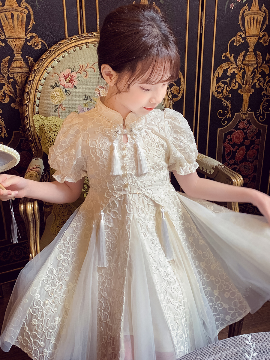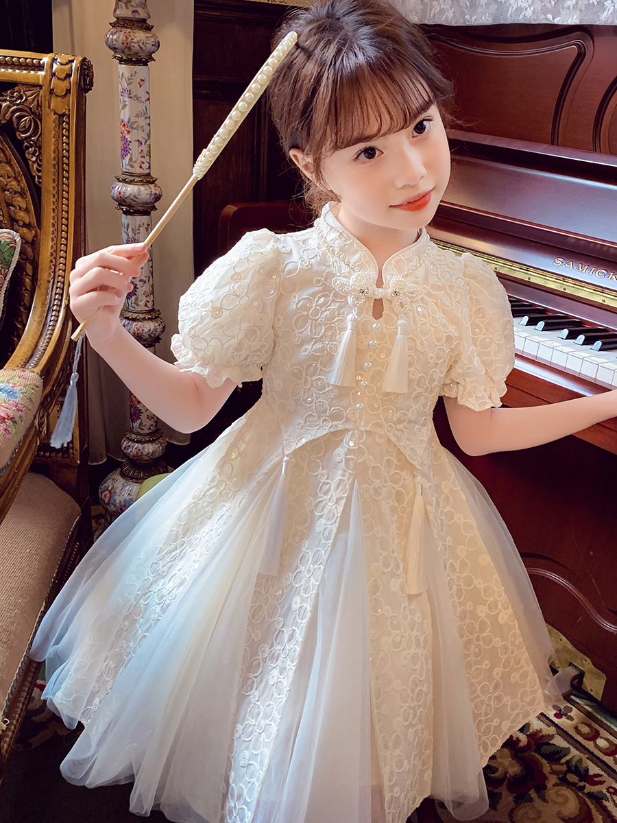 Girls Dress New Chinese Style Children's Hanfu Summer Dress 2025 New Girl Cheongsam Puff Sleeve Mesh Princess Dress