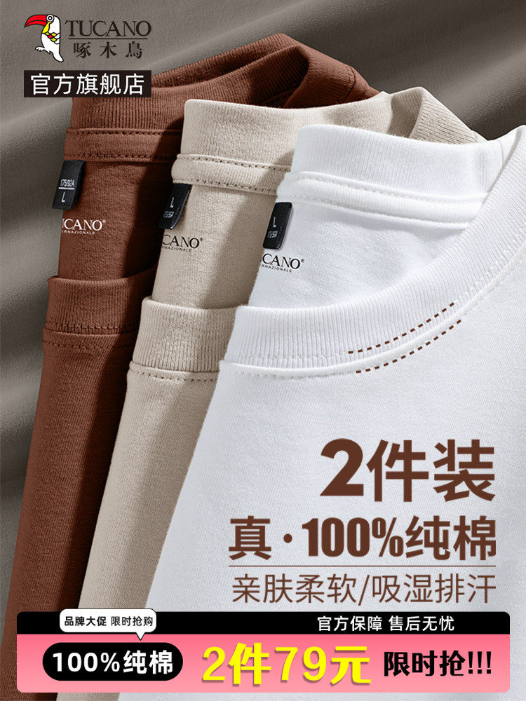 Woodpecker Cotton Long Sleeve T-Shirt Men's Spring and Summer 2026 New Loose Plus Size Inner Base Shirt Boys Short Sleeve Y