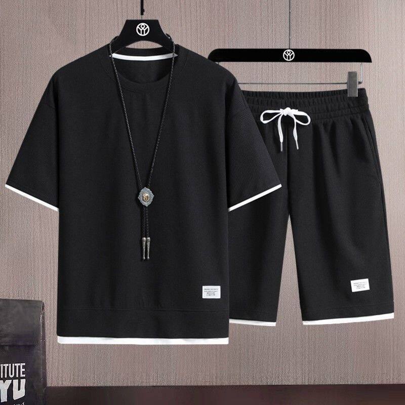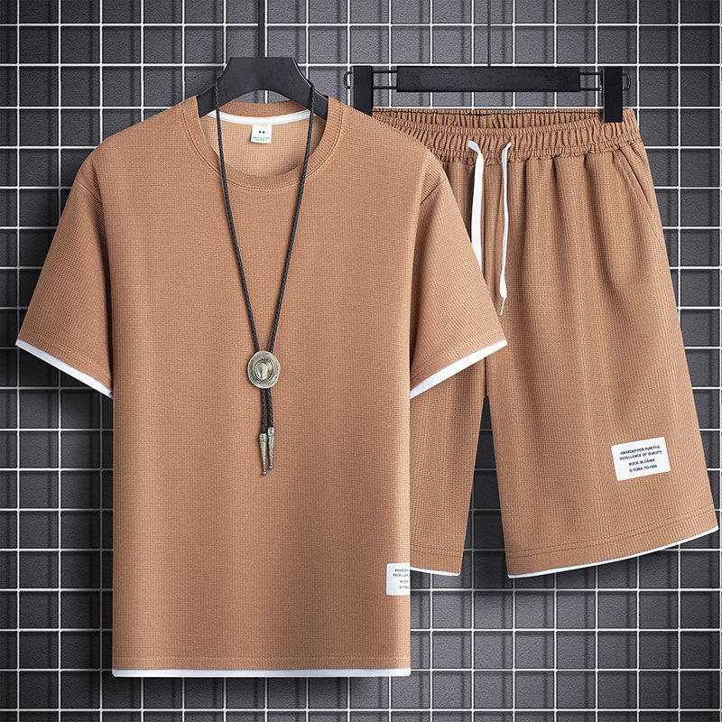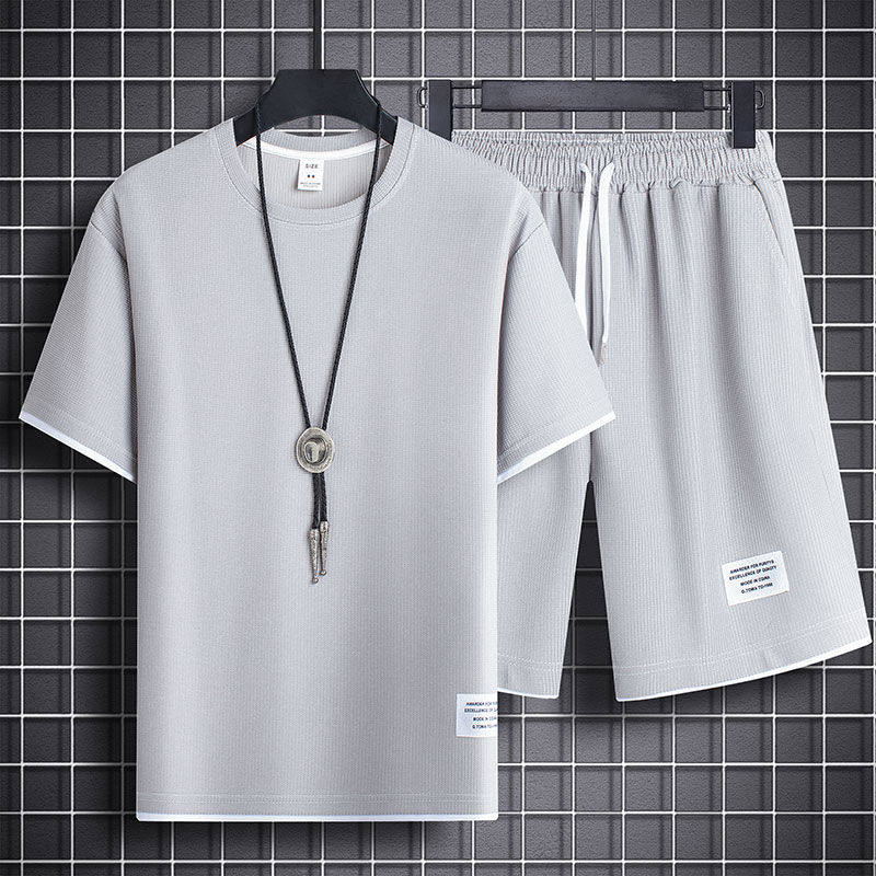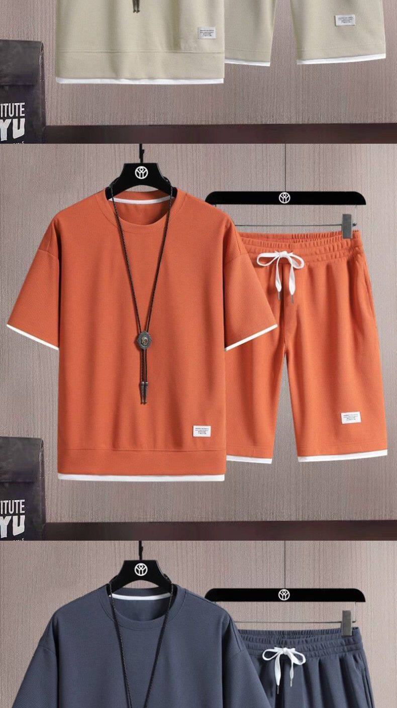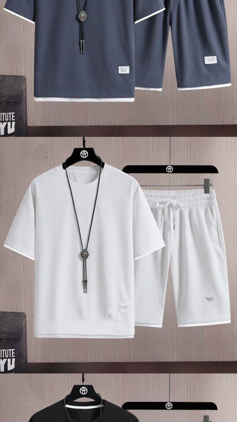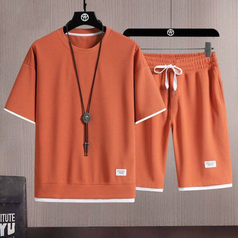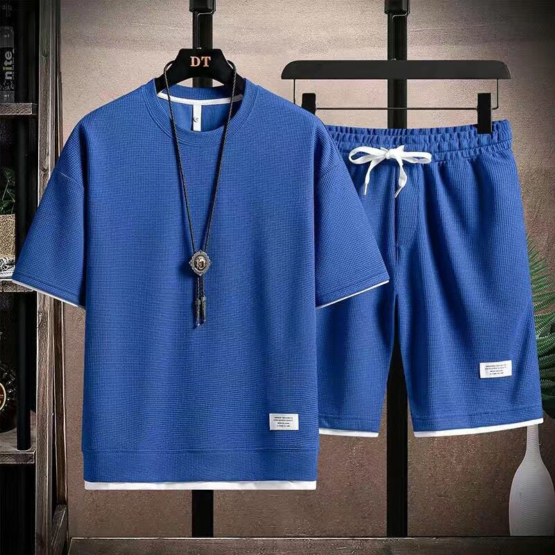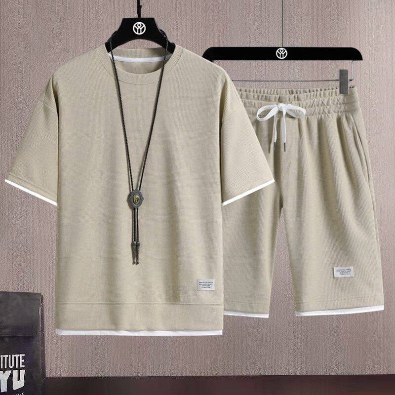 Heavyweight waffle suits, men's and women's summer athleisure, loose fakes, two-piece half-sleeved T-shirts, and a set of five-quarter shorts