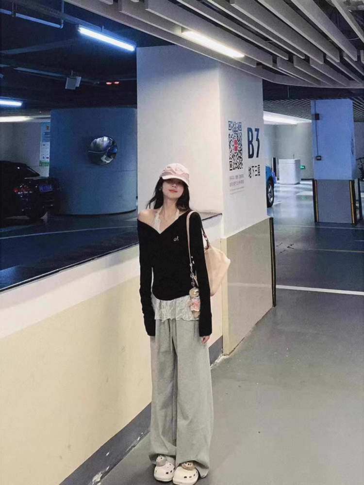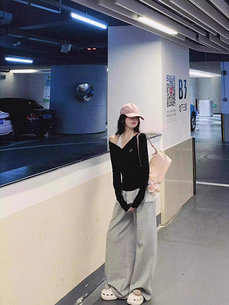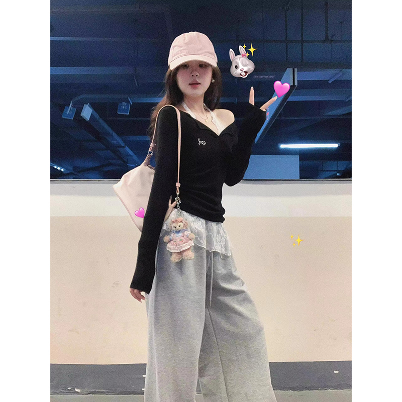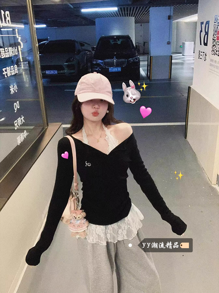 Lace halterneck V-neck long sleeve T-shirt women's winter 2024 new inner base layer sweet hot girl top two-piece set