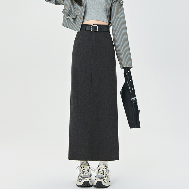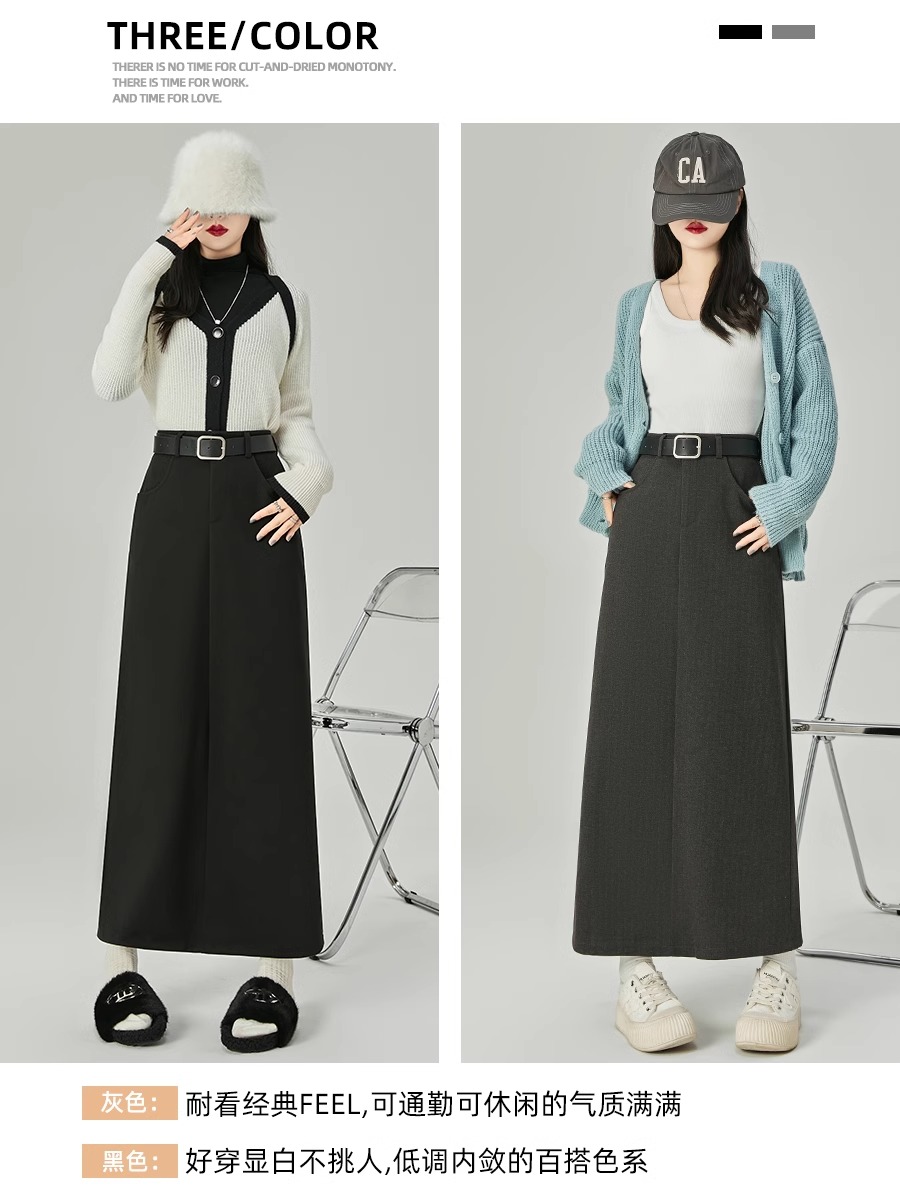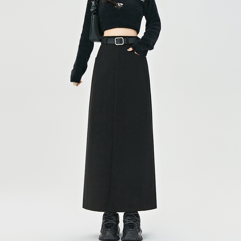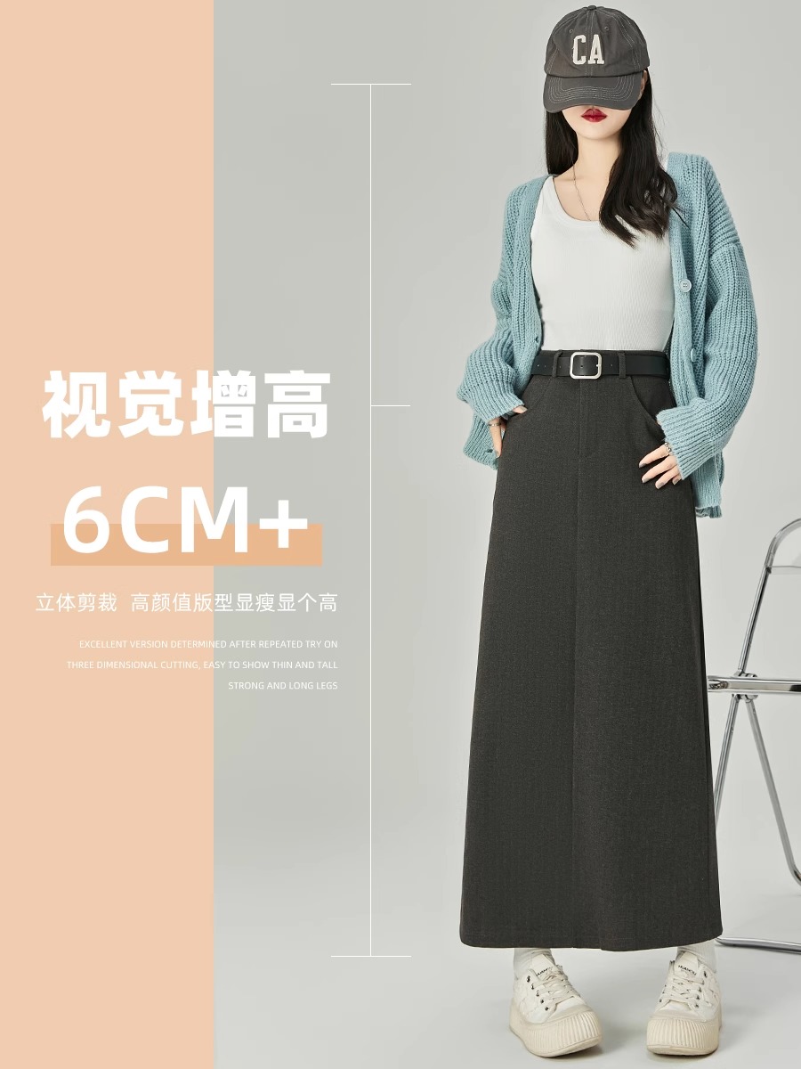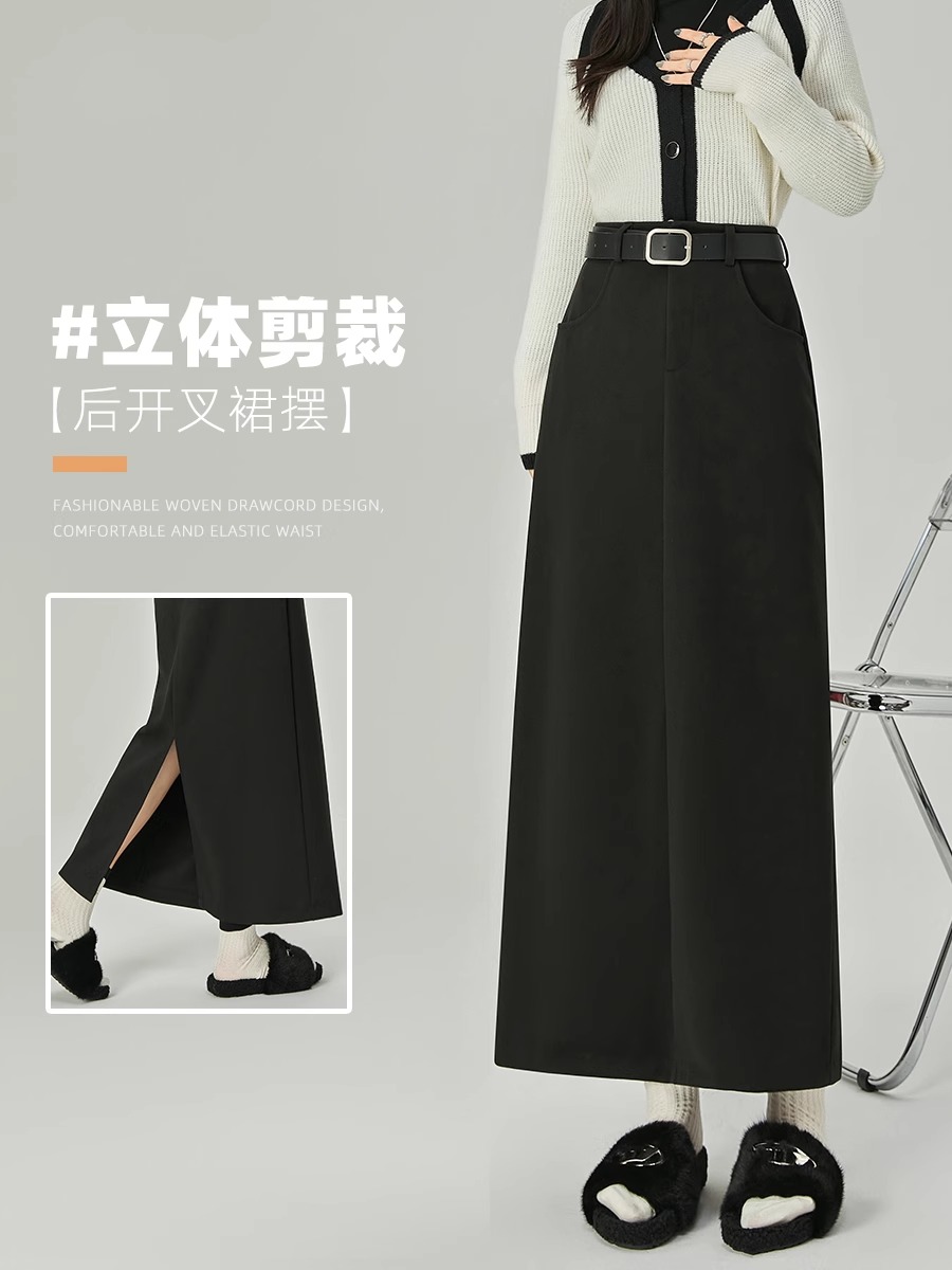 2025 black woolen skirt, women's autumn style, thickened mid-length straight skirt, high-waisted slit A-line skirt