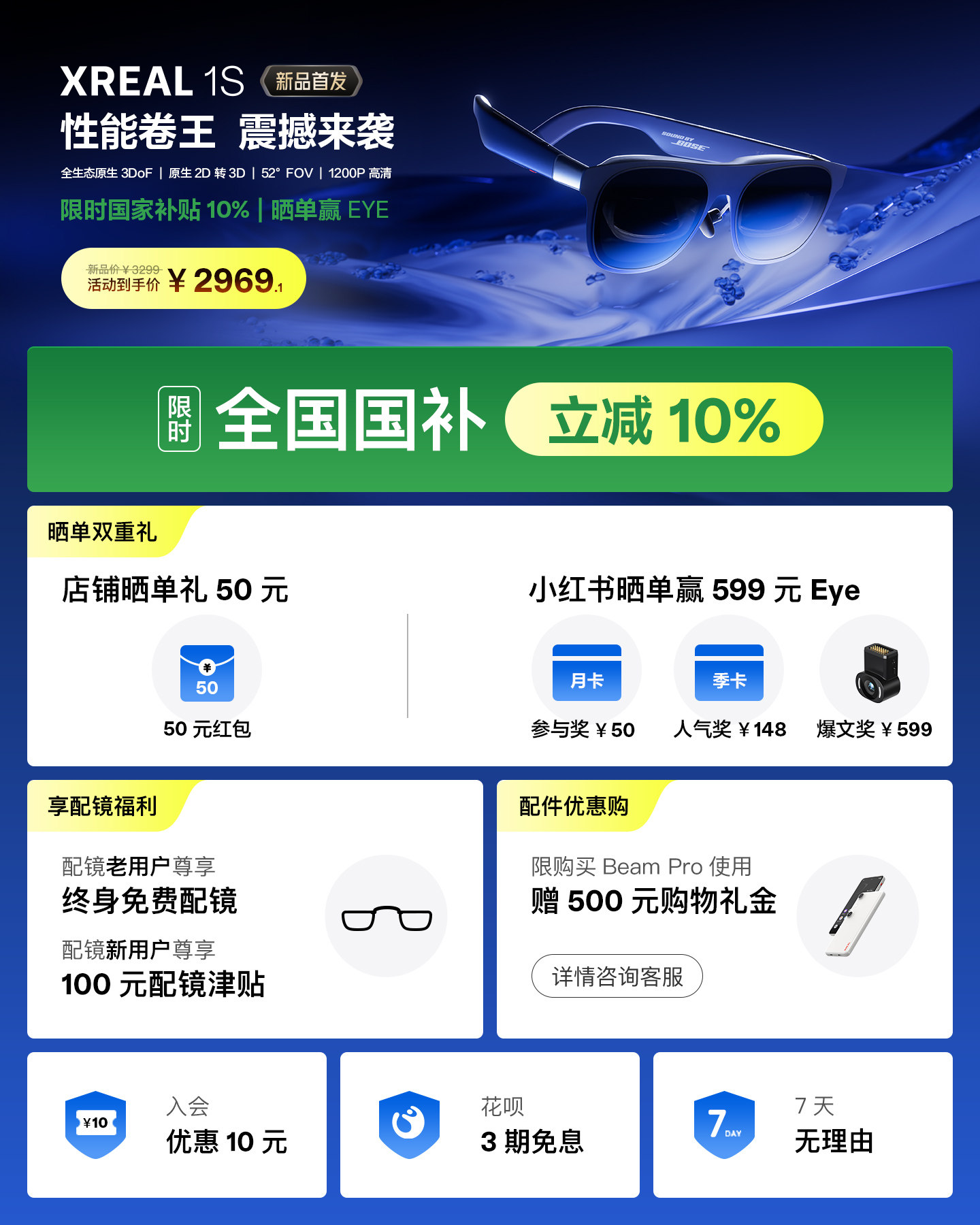[New Product Launch] XREAL 1S AR smart glasses native 2D to 3D self-developed X1 chip giant screen in the air 500-inch 52-degree FOV non-VRAI glasses