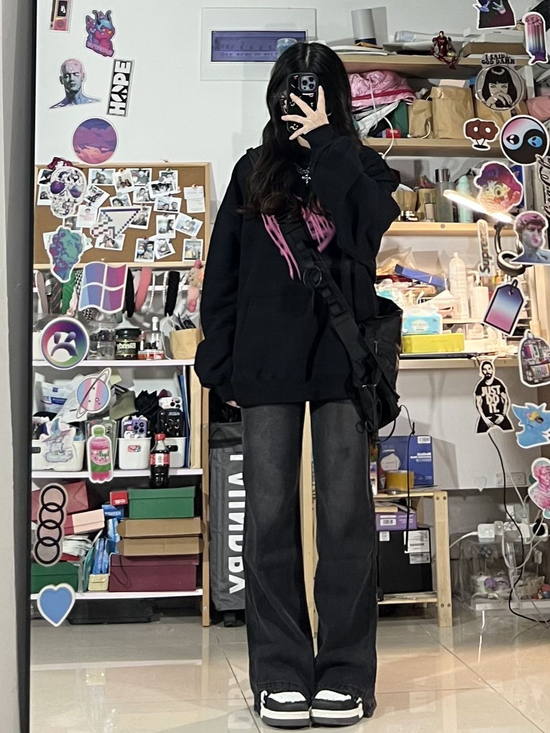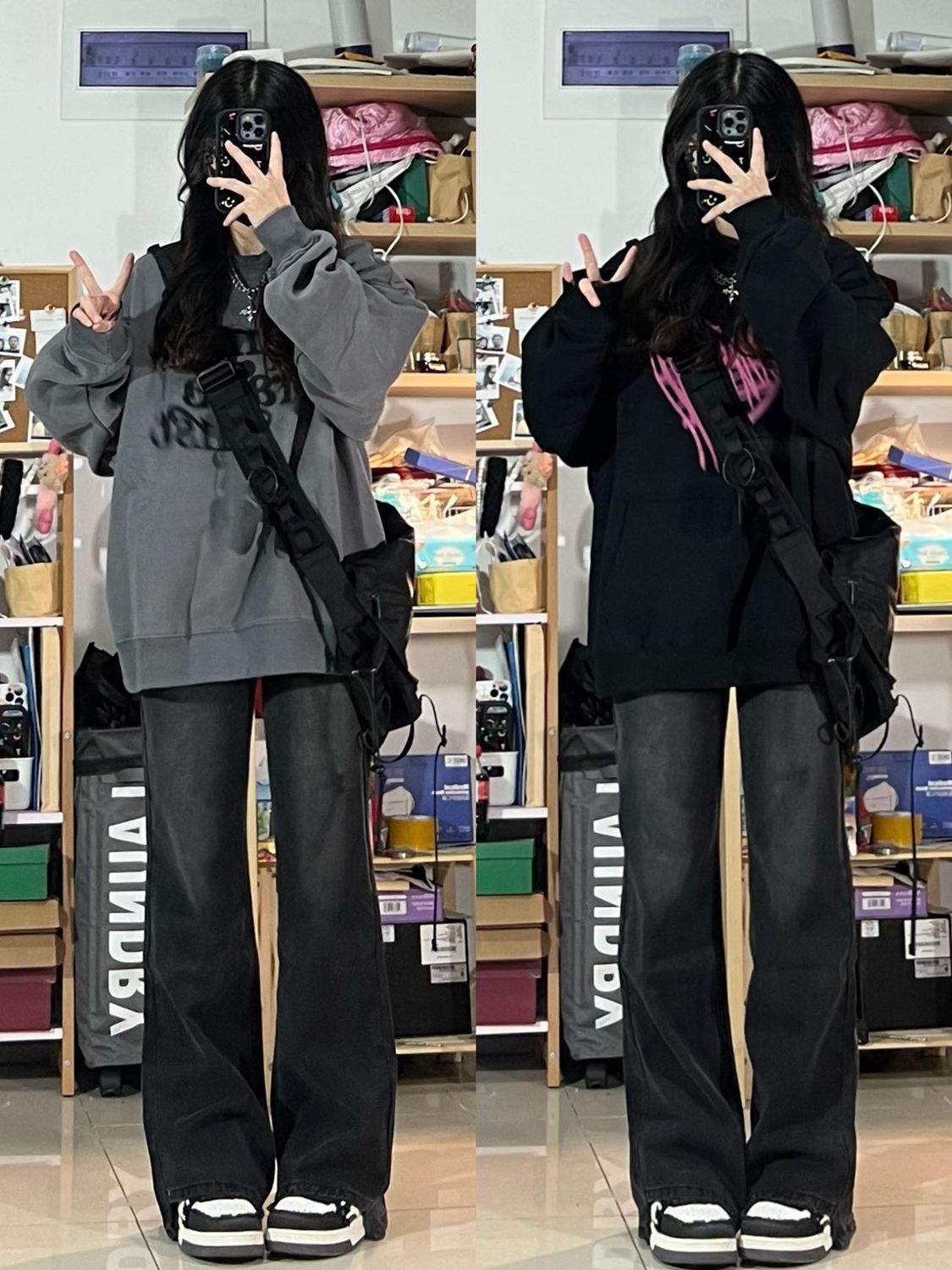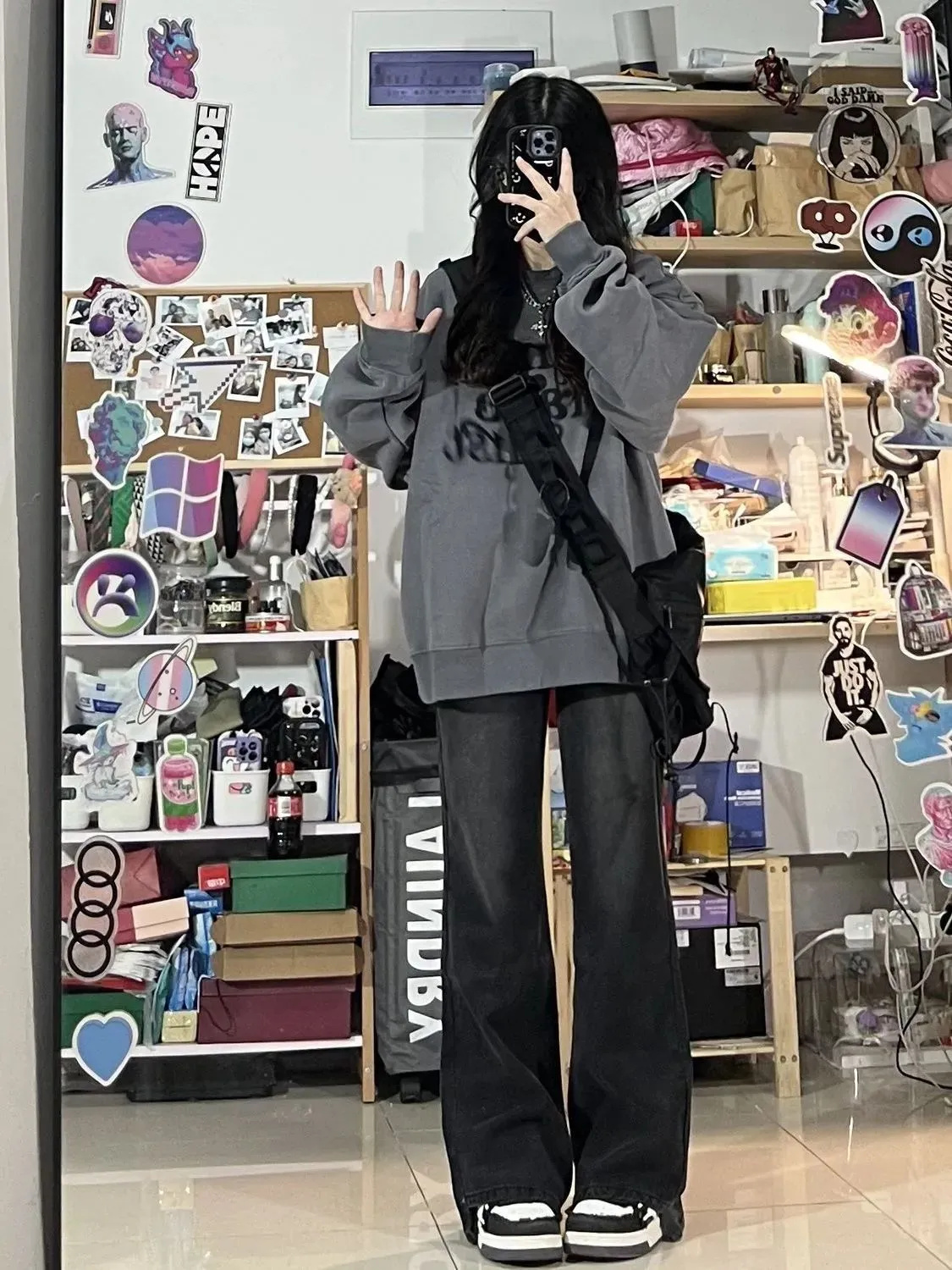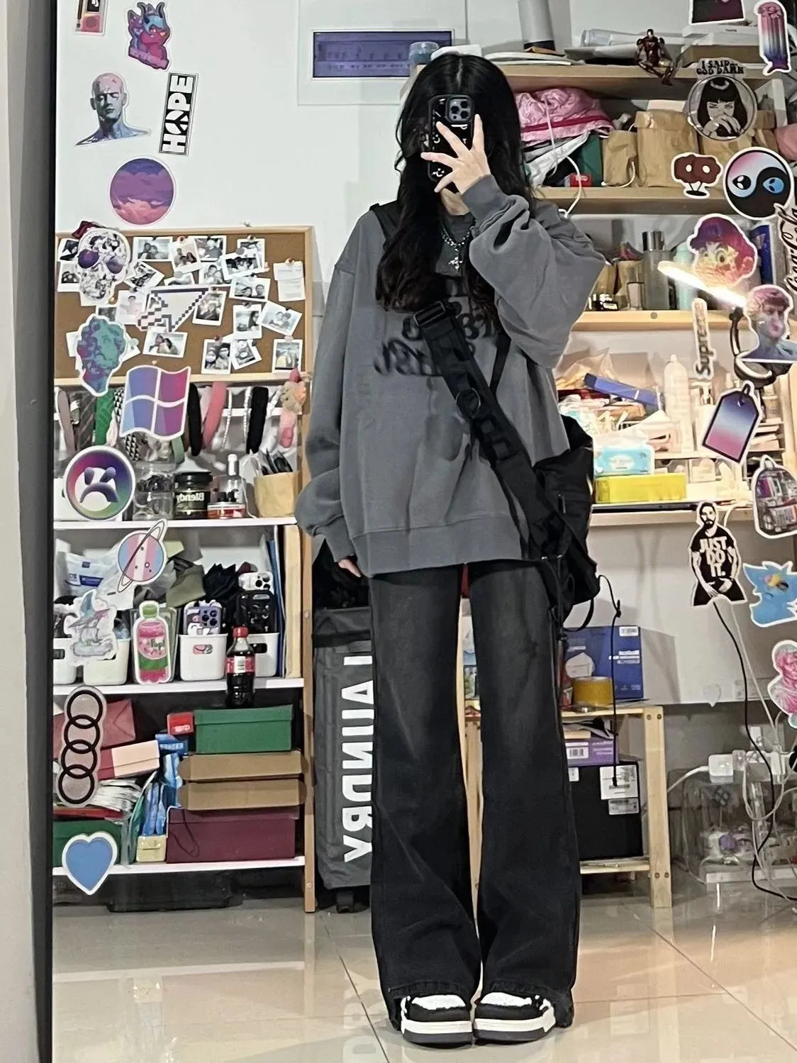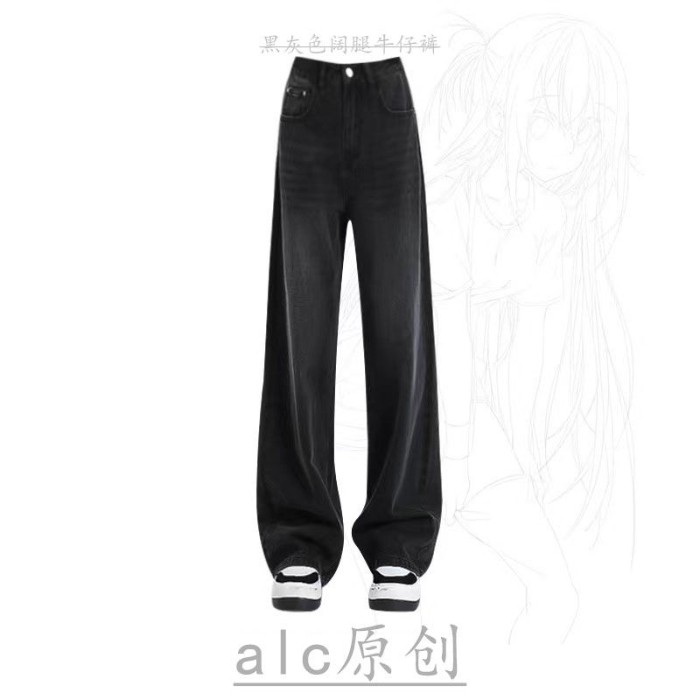 American retro small man, black gray high-waisted straight jeans, female thin, loose and versatile, a complete set of women