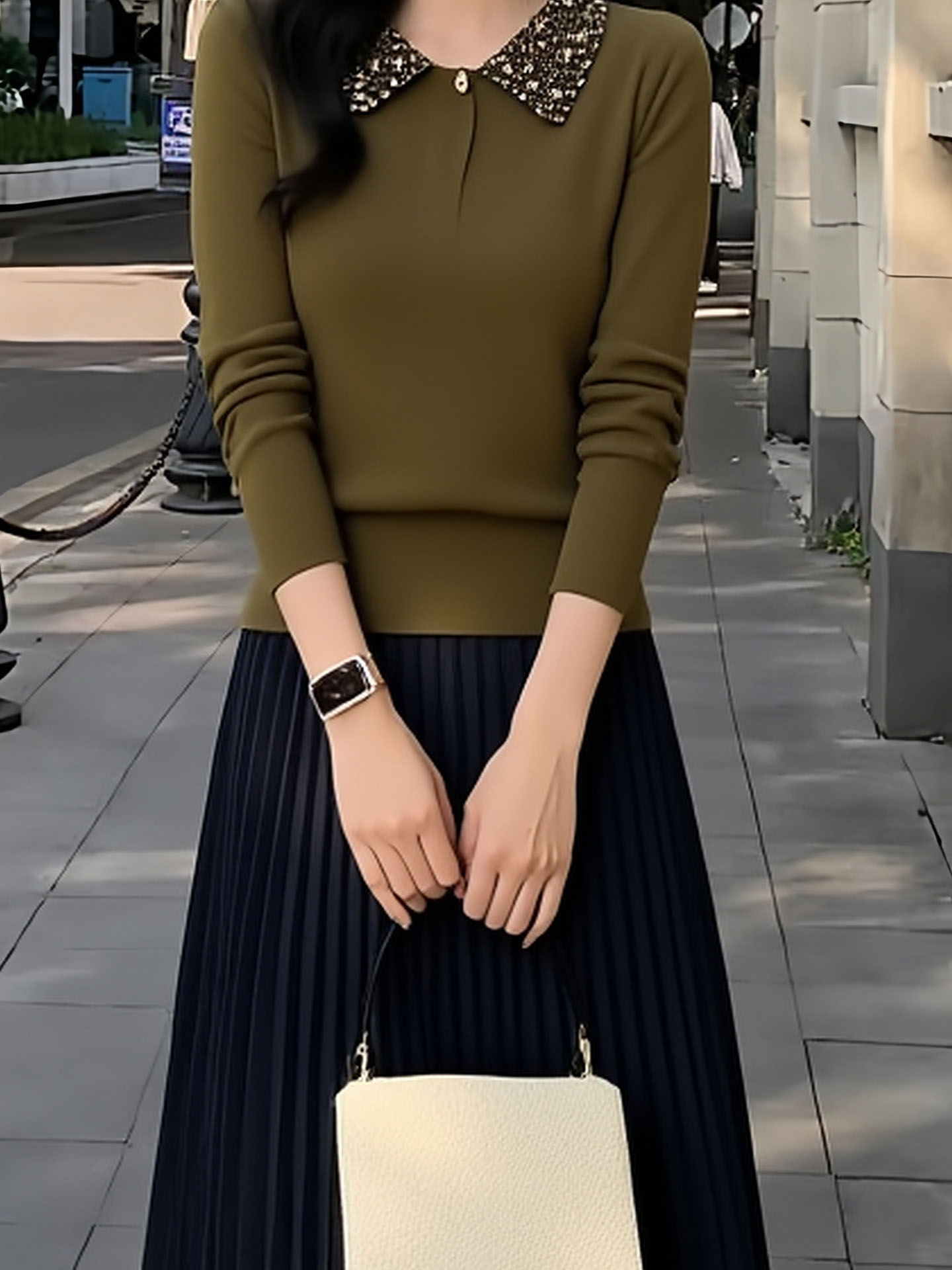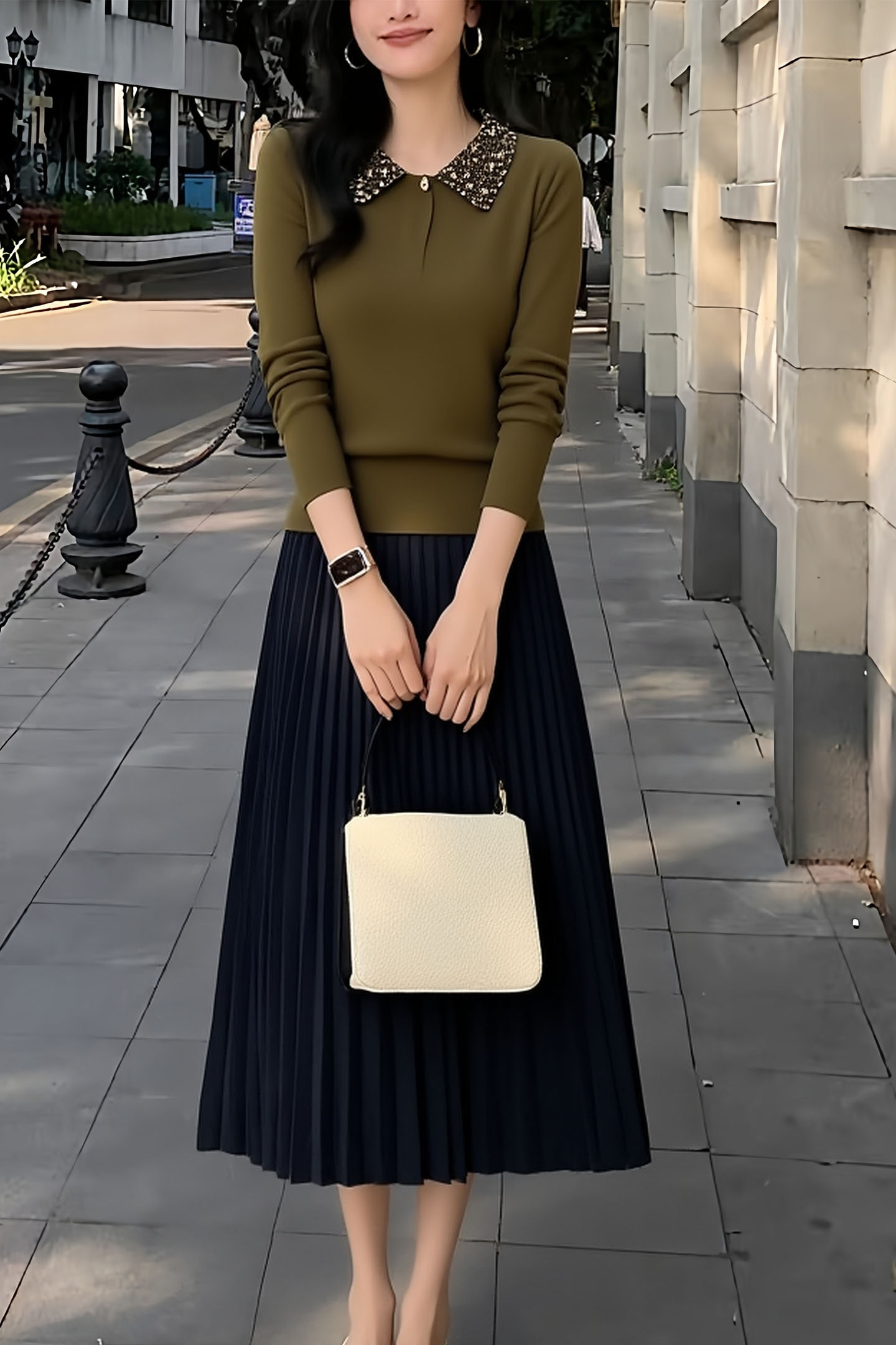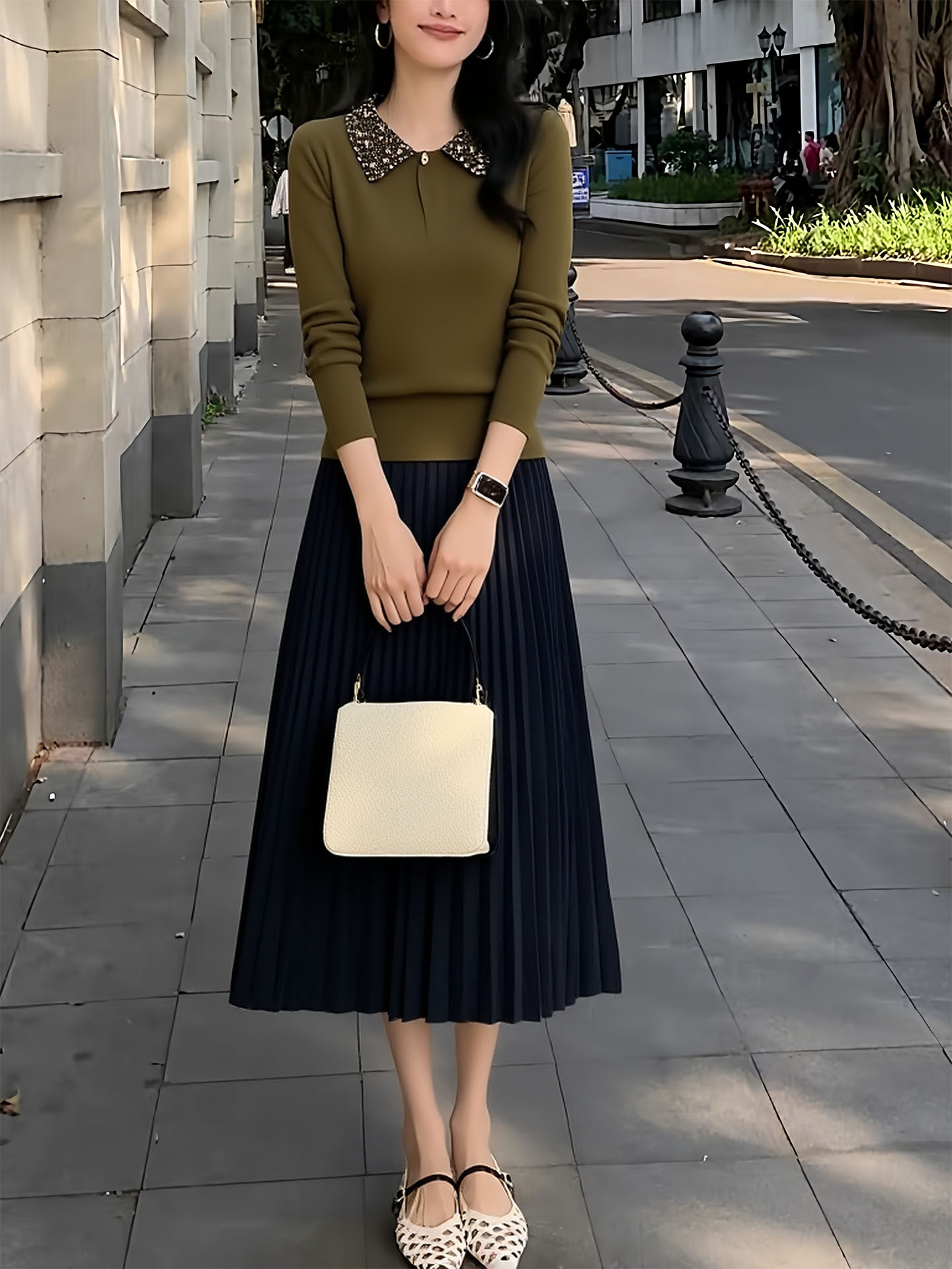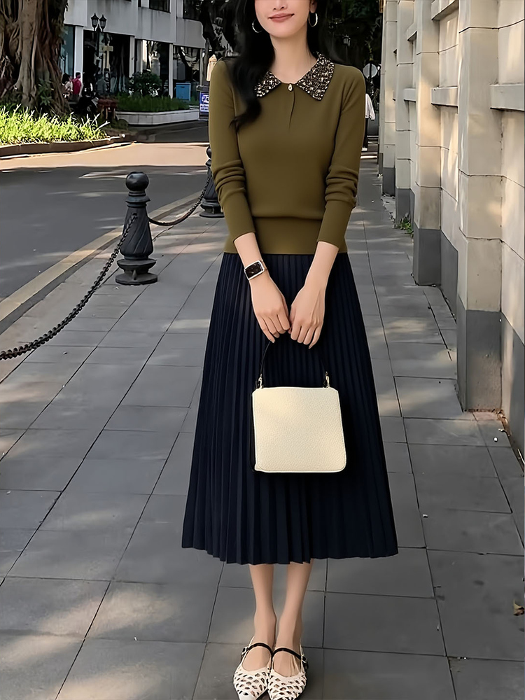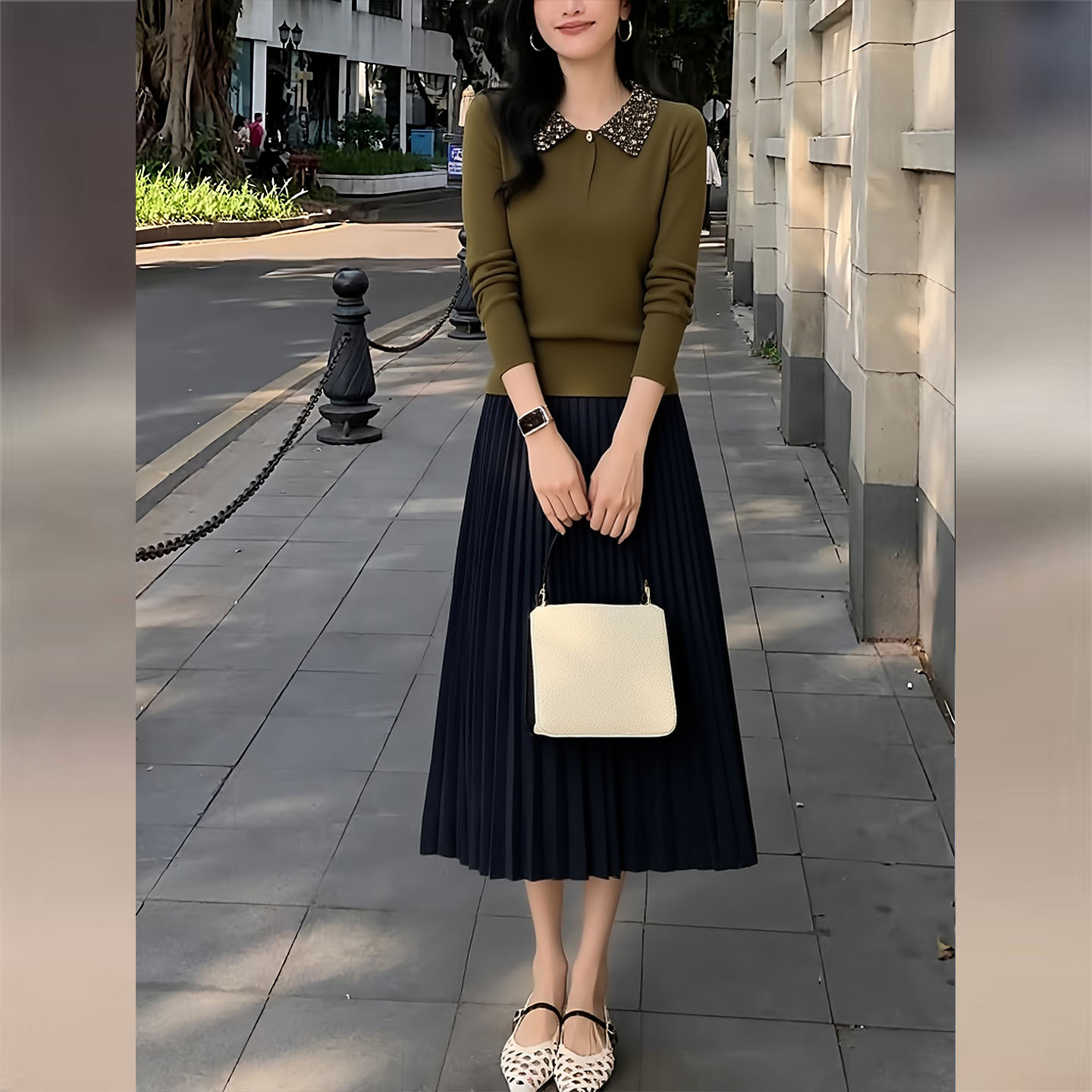 This year's popular knitted suit women's clothing new polo neck top pleated skirt two-piece set for fall 2025