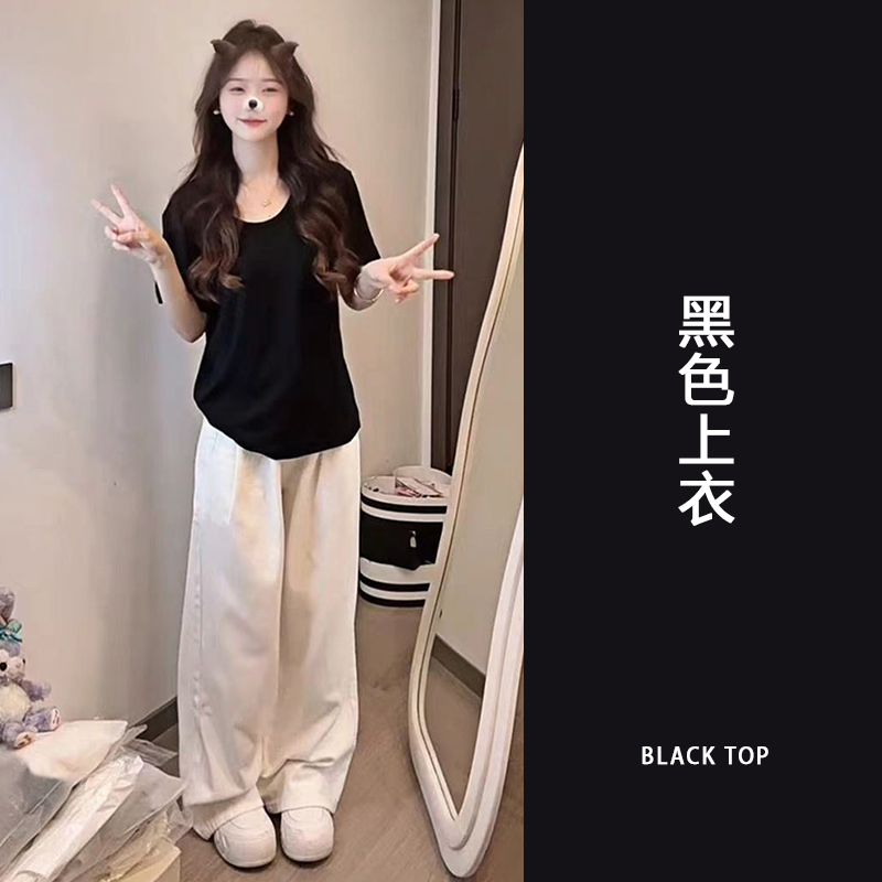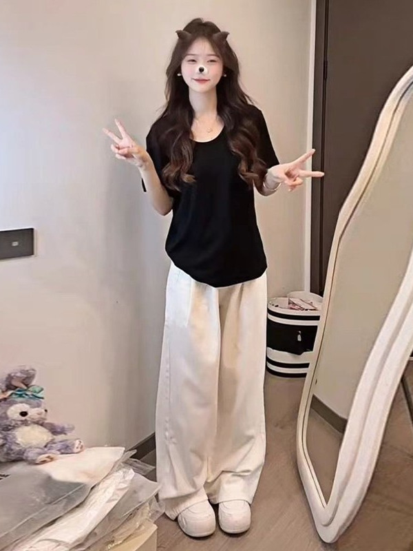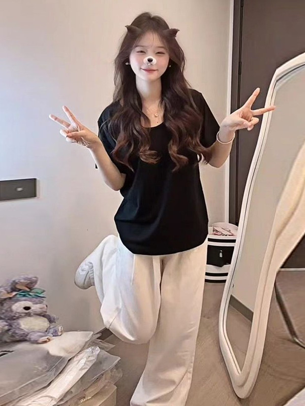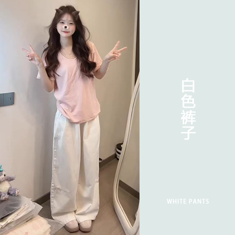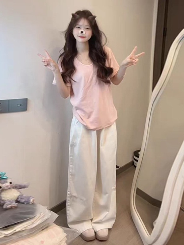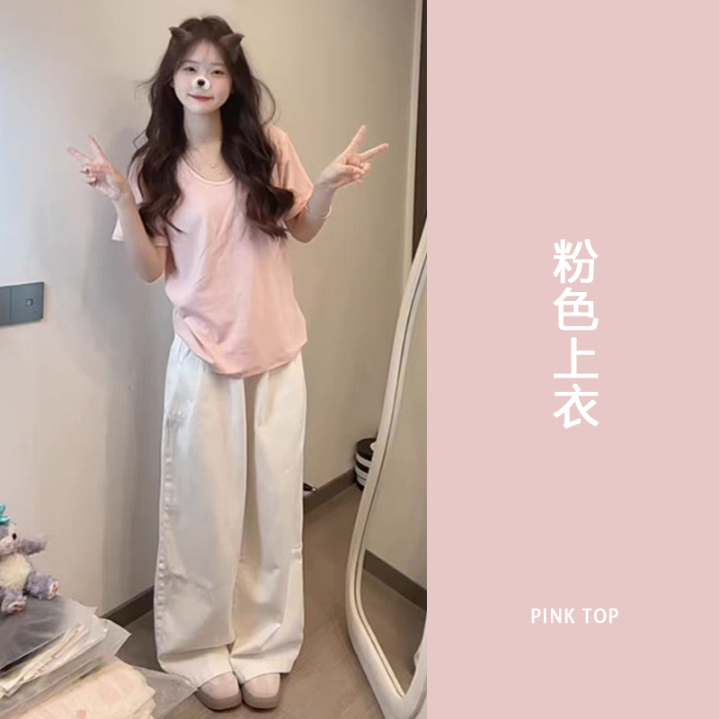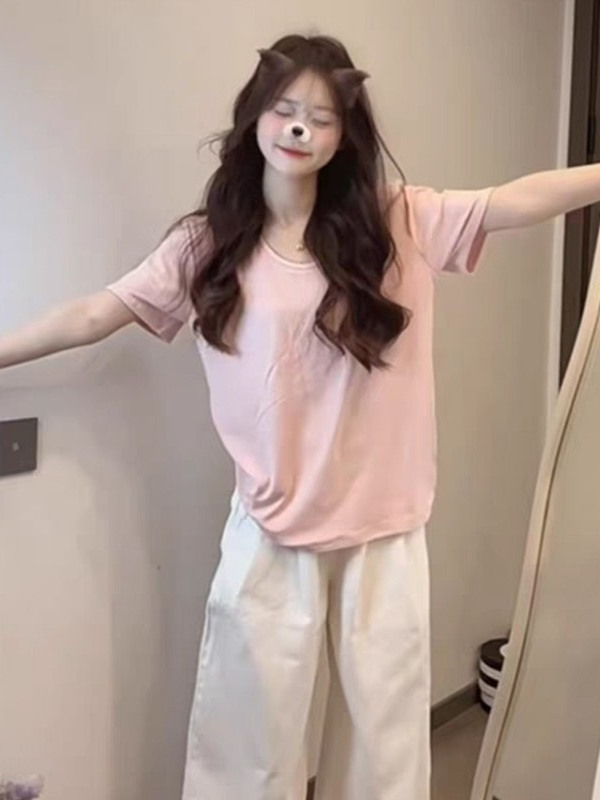 Pink U-neck short sleeve shoulder t-shirt women's 2025 new summer casual loose slim and versatile small man top