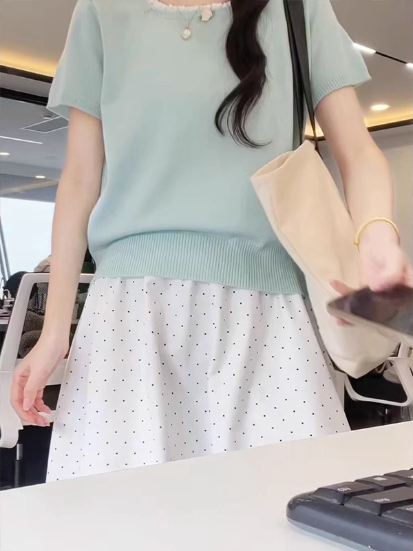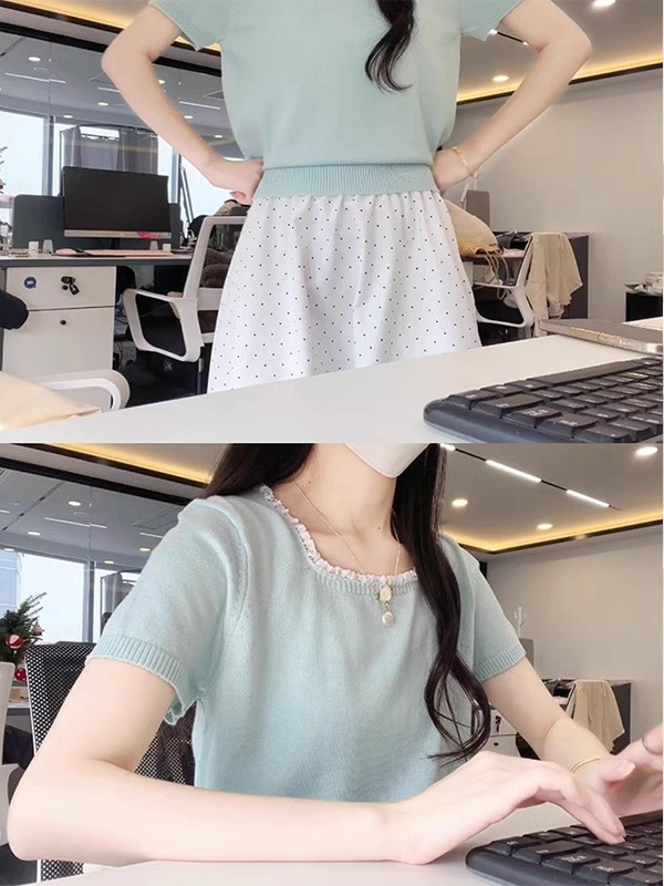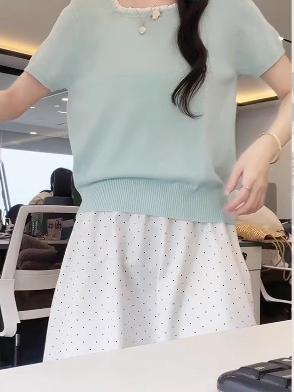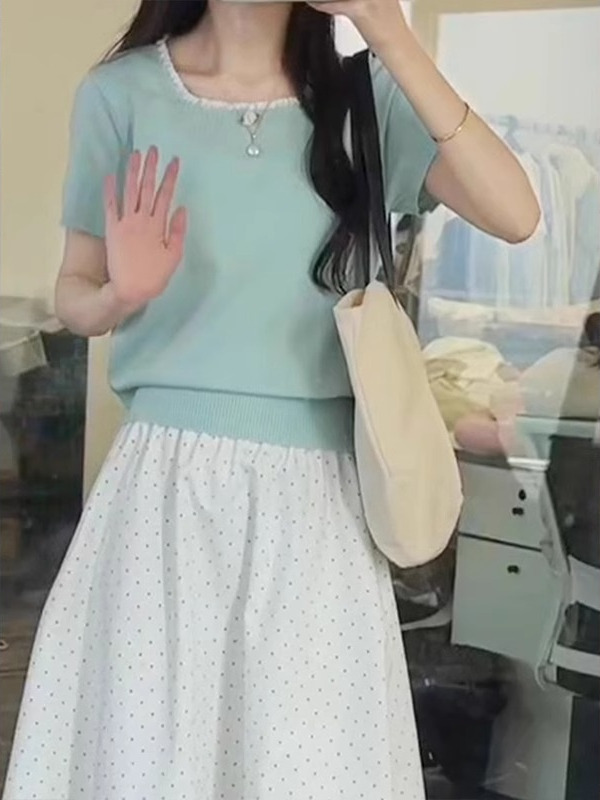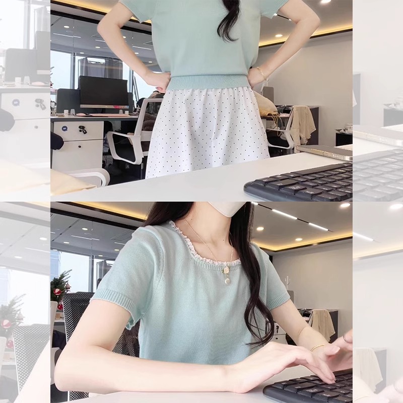 French blue lace square neck shoulder T-shirt women's summer 2025 new gentle style temperament is beautiful and slim top