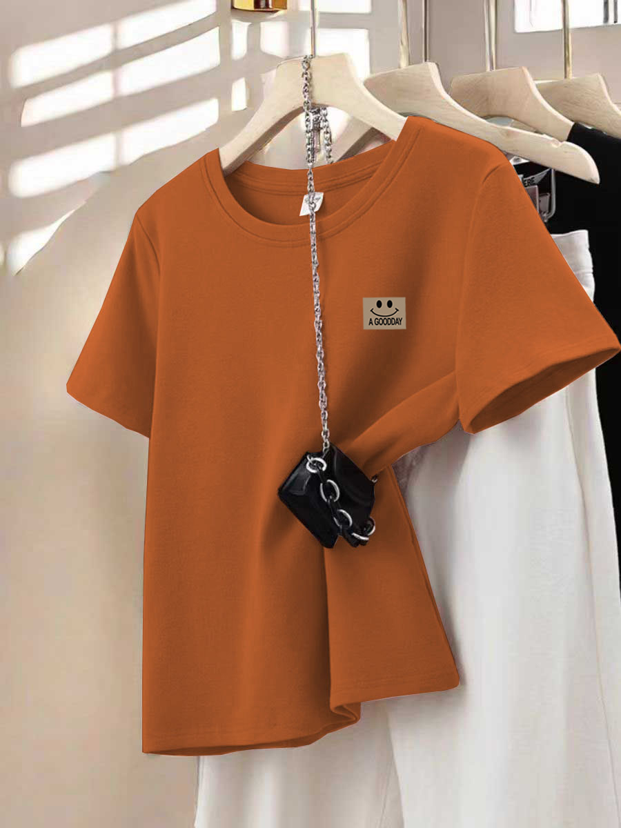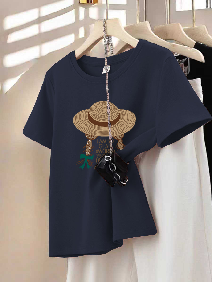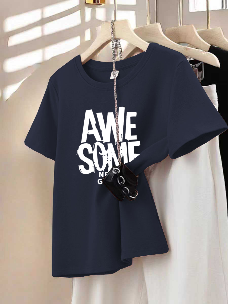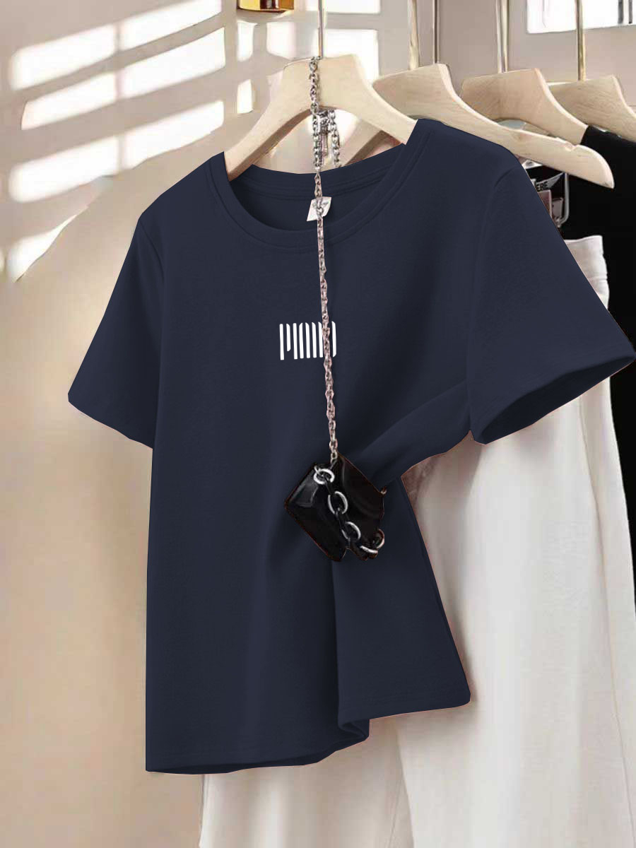 Navy blue straight shoulder pure cotton brushed short-sleeved T-shirt women's niche fashion versatile age-reducing top base shirt early autumn