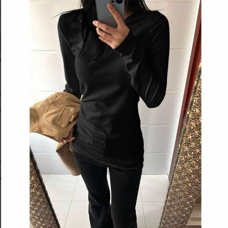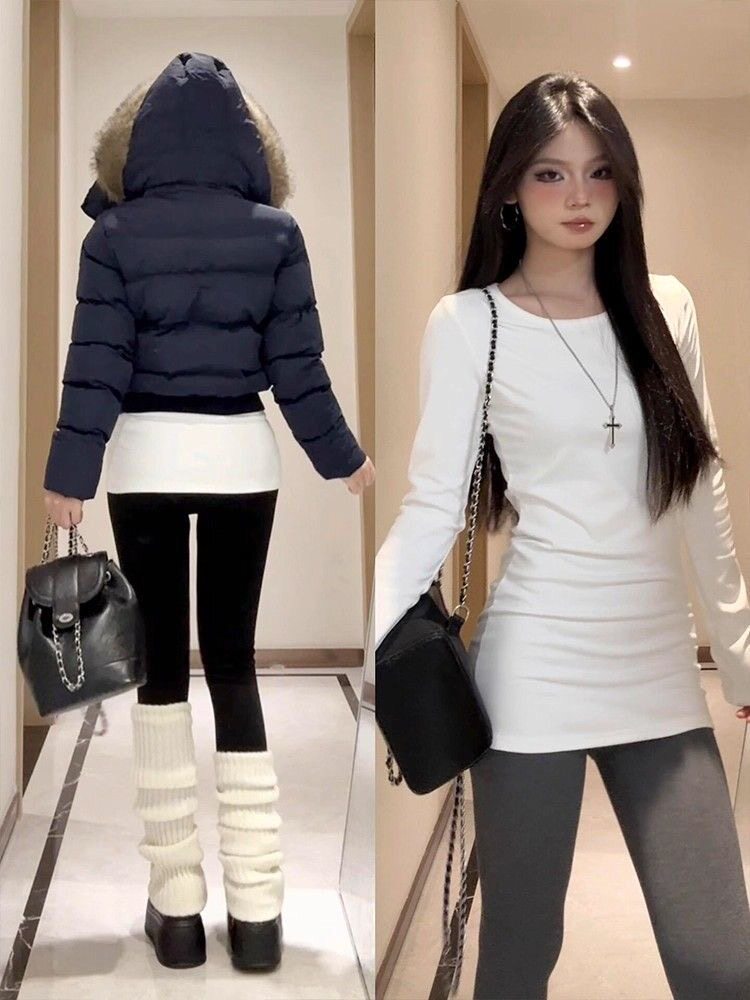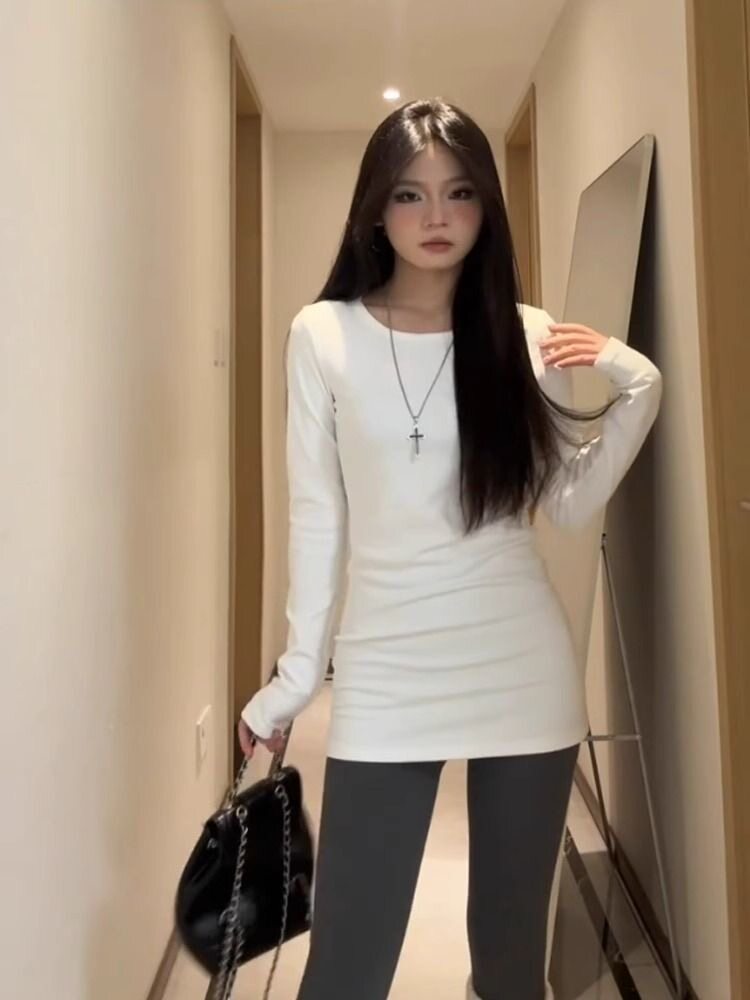 White mid-length round neck long-sleeved T-shirt for women, 2026 new spring, autumn and winter inner and outer wears slim hot girl tops for women