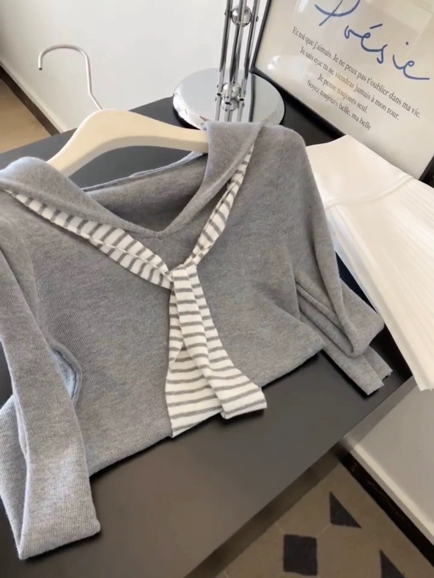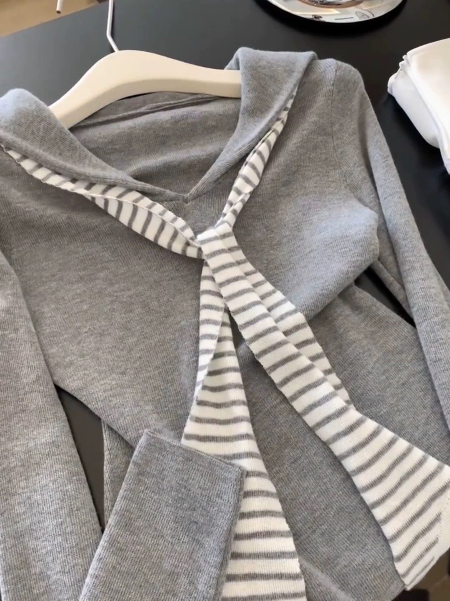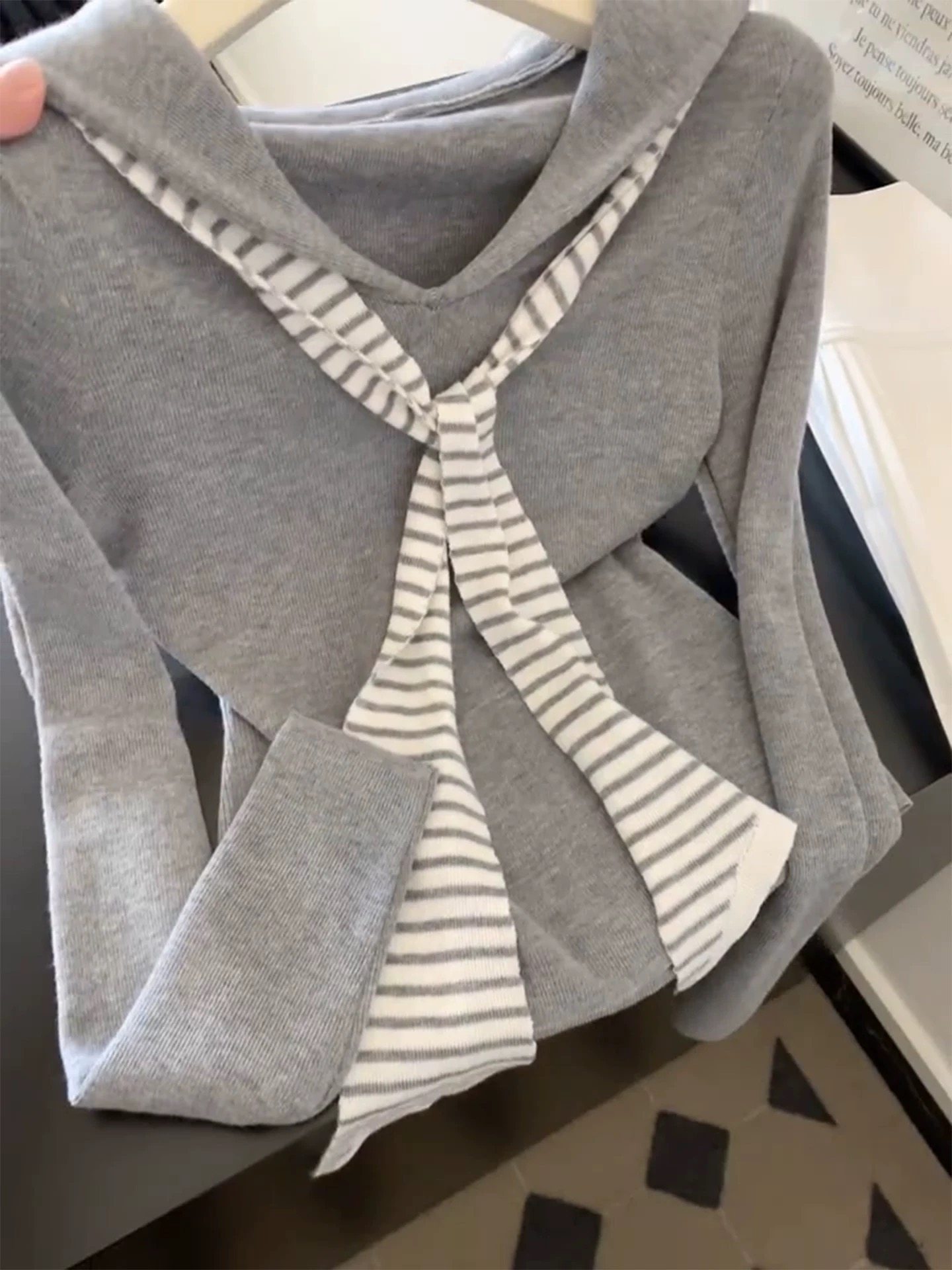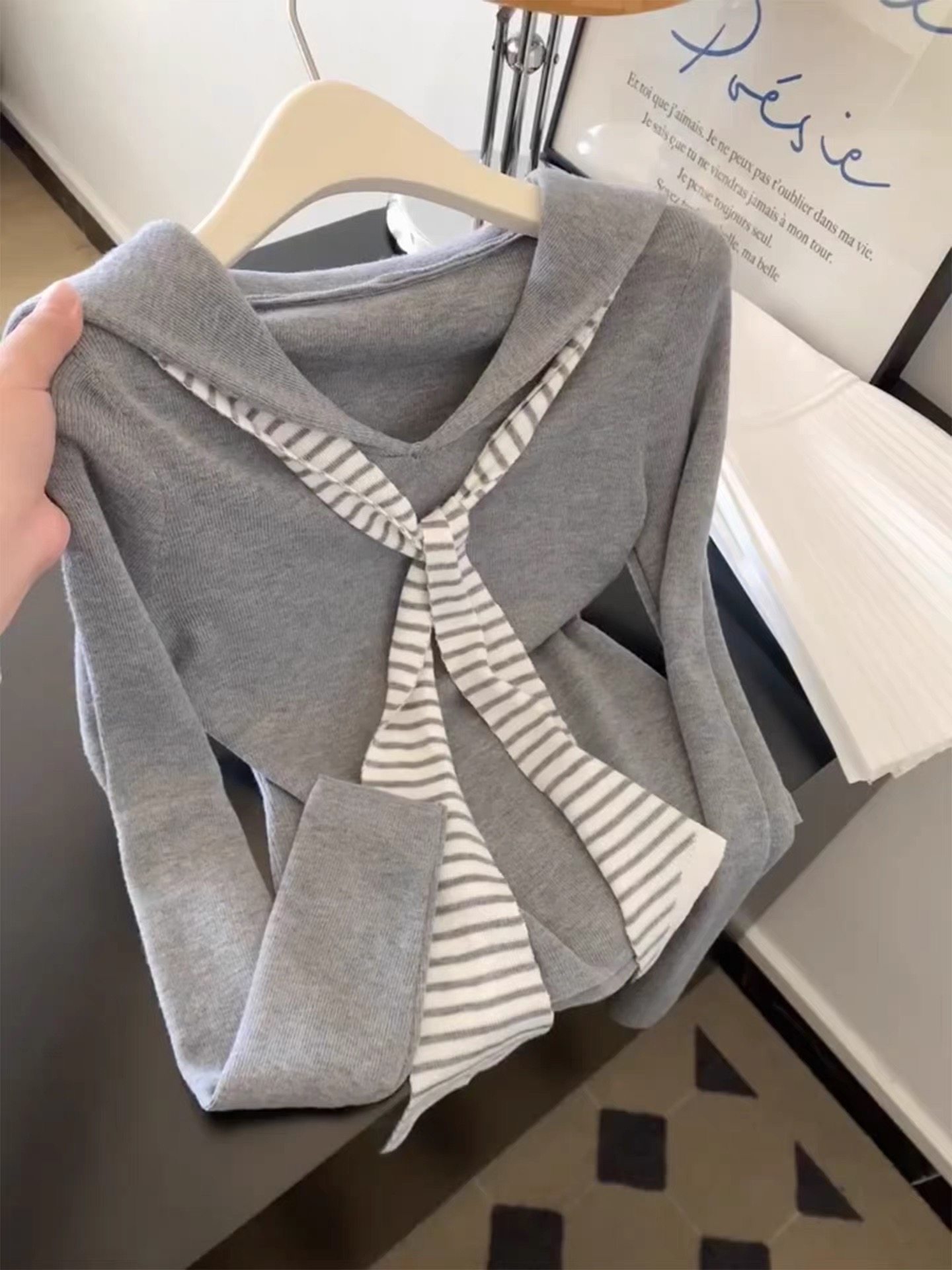 Navy collar striped shawl tie long sleeve T-shirt women's autumn and winter new Korean age-reducing niche V-neck shoulder top for women