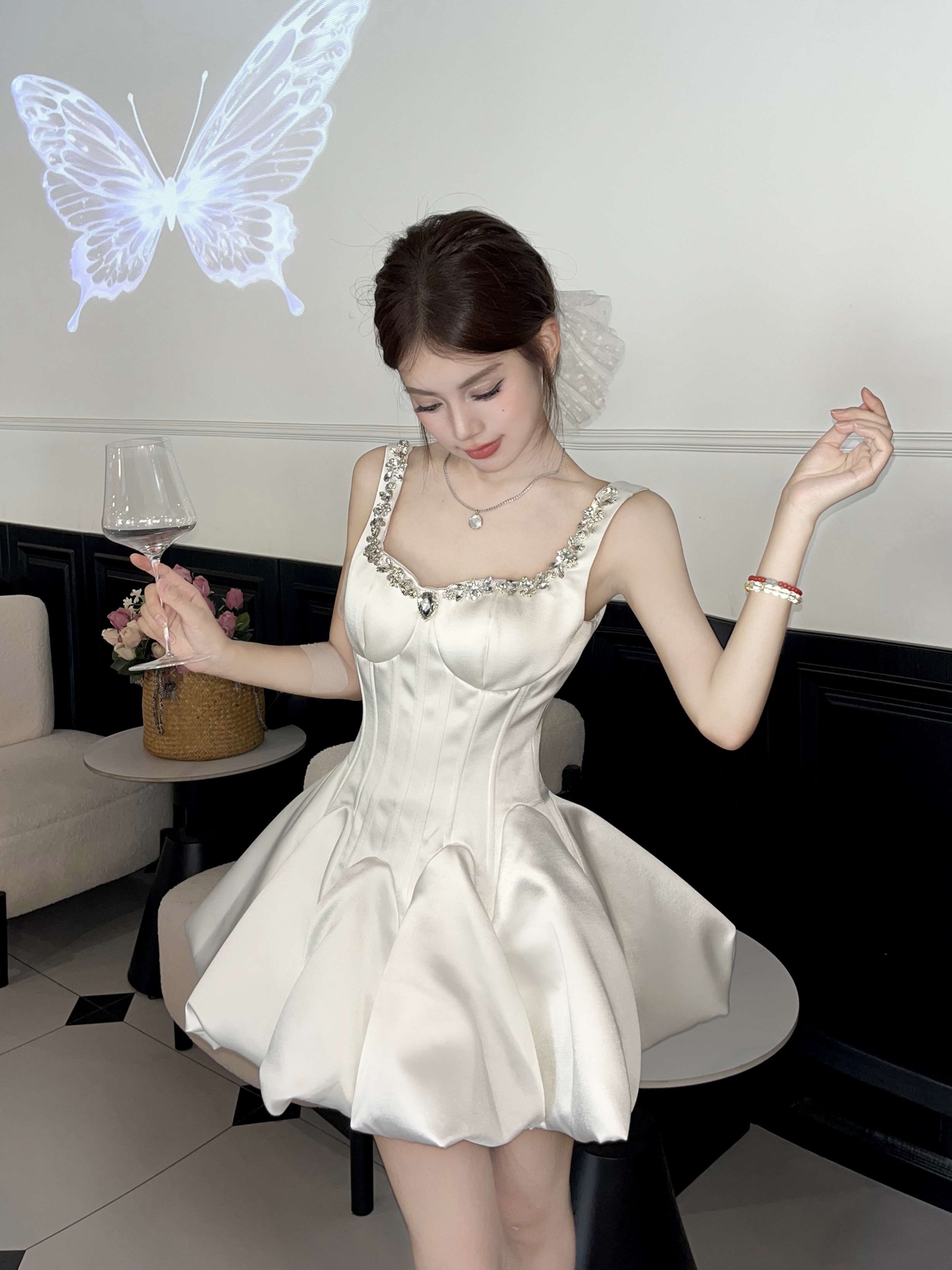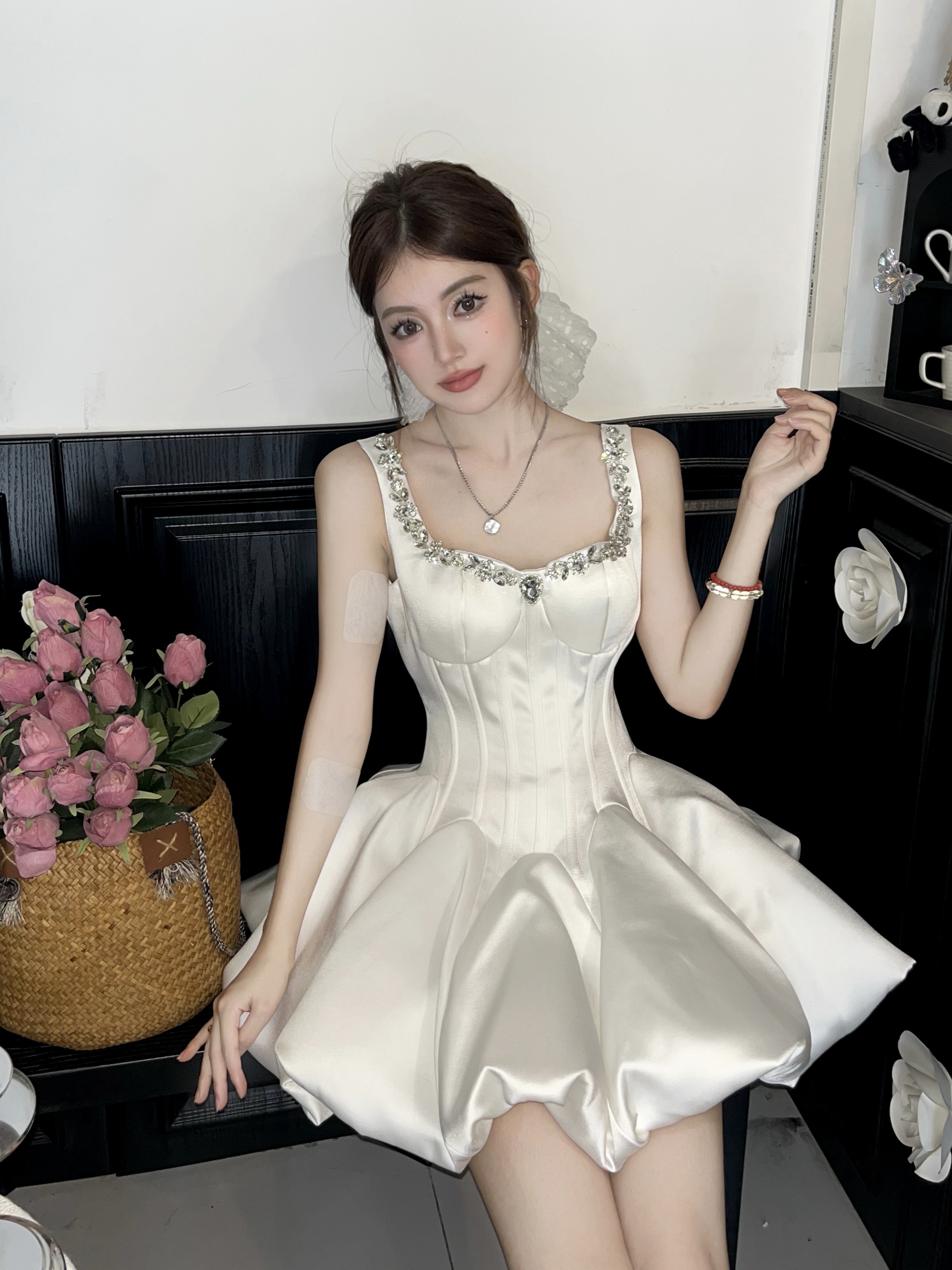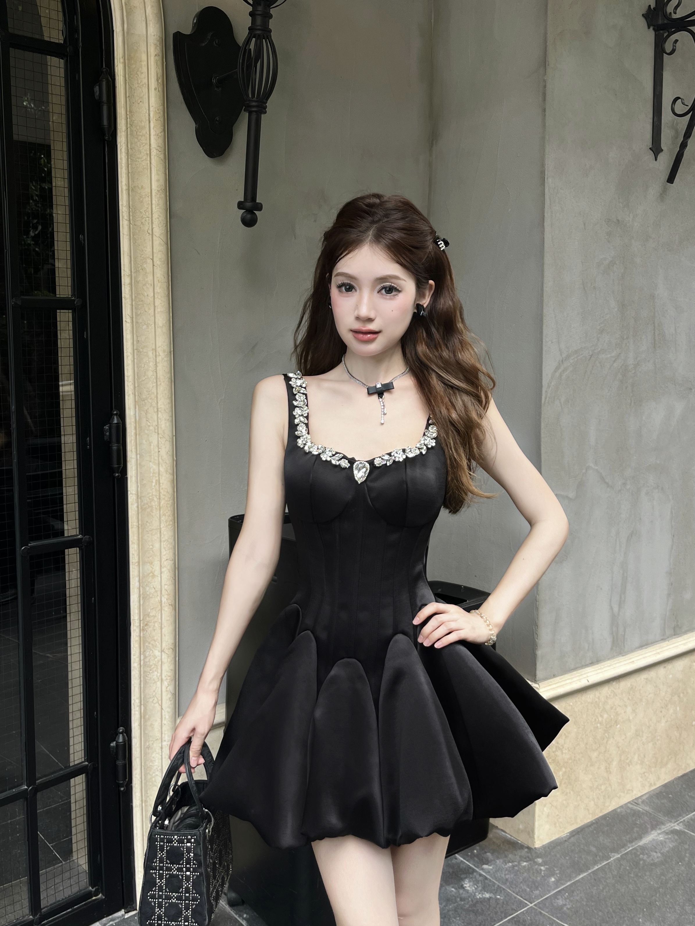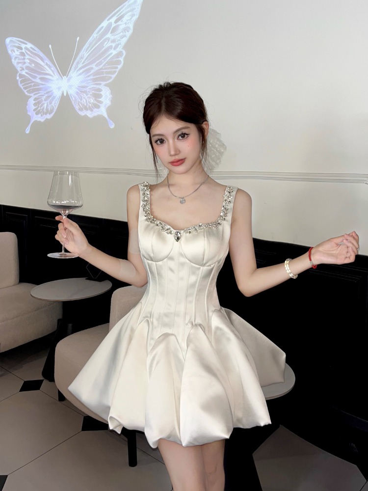 Daughter-in-law style black camisole dress women's 2025 autumn/winter with diamond-encrusted square neck waist small black dress banquet dress