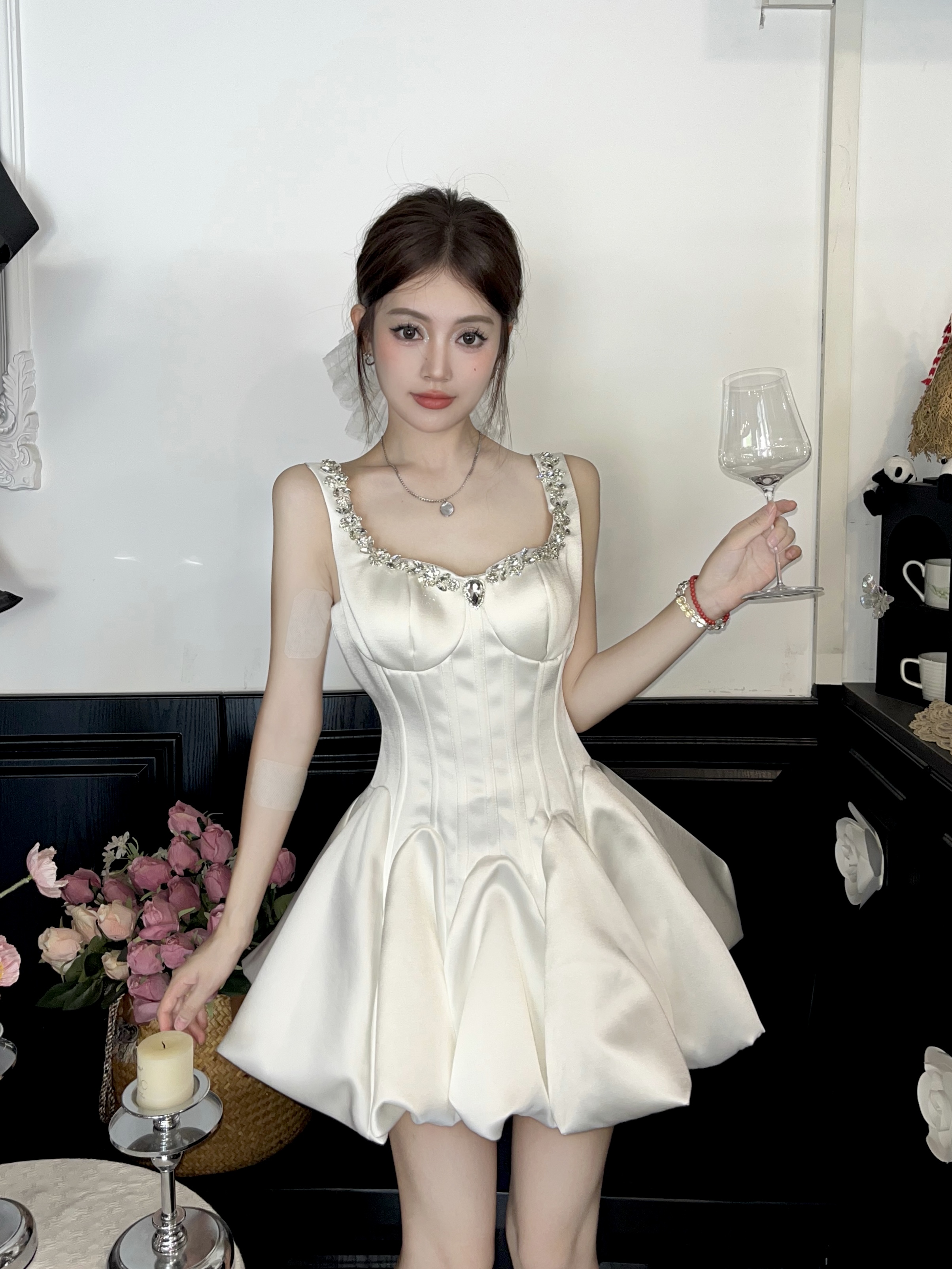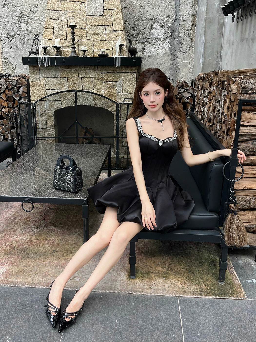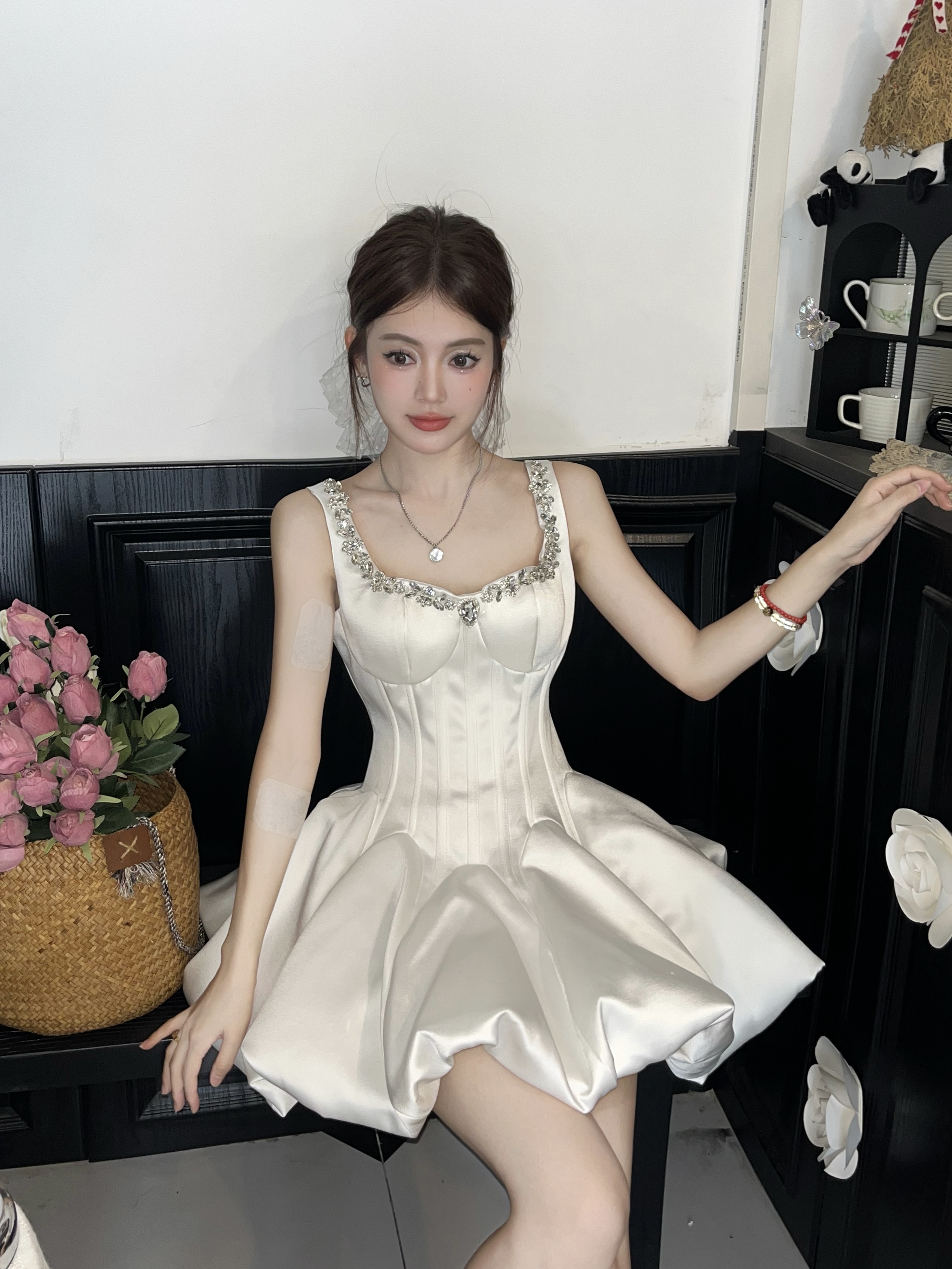 Daughter-in-law style black camisole dress women's 2025 autumn/winter with diamond-encrusted square neck waist small black dress banquet dress