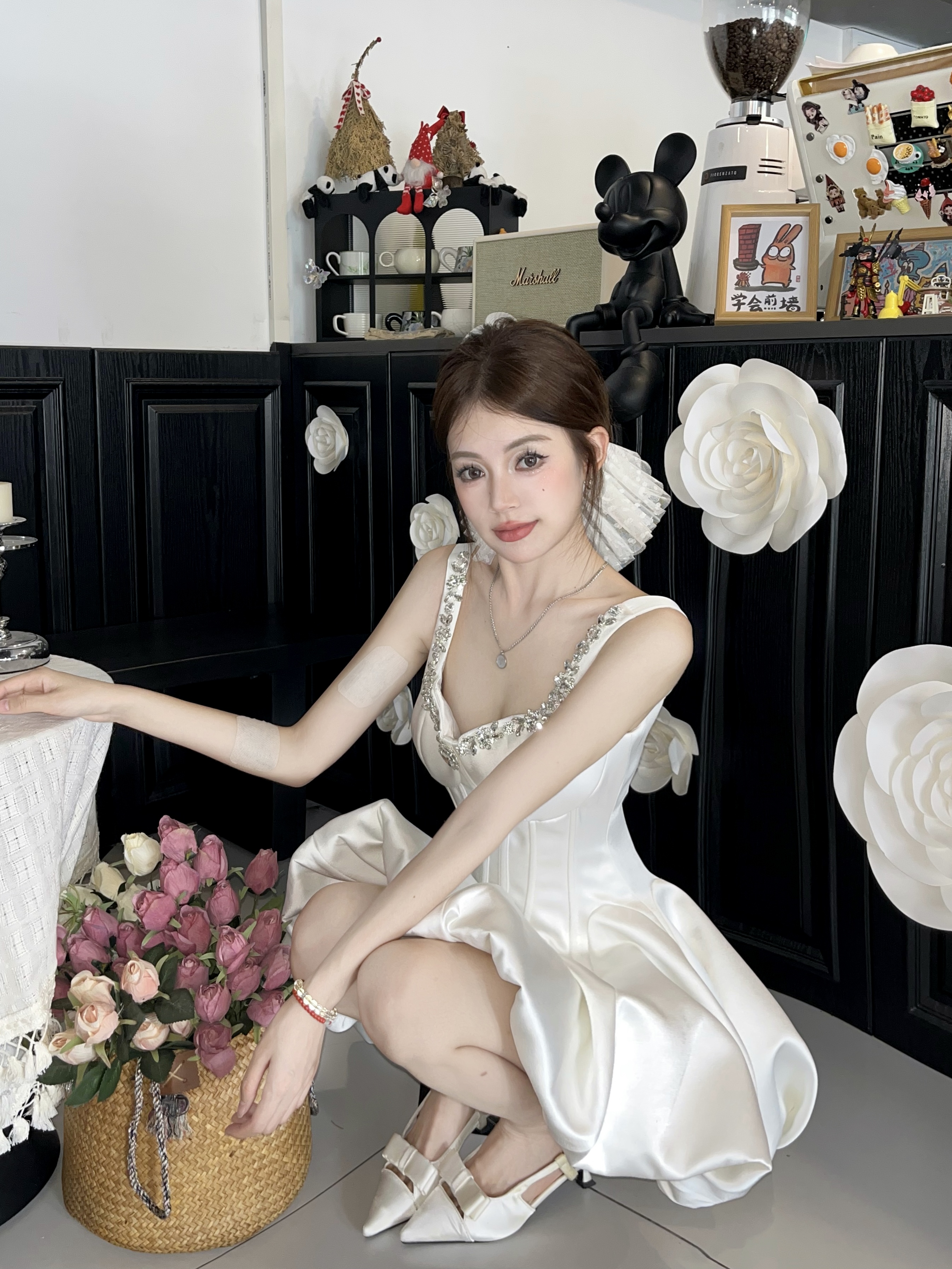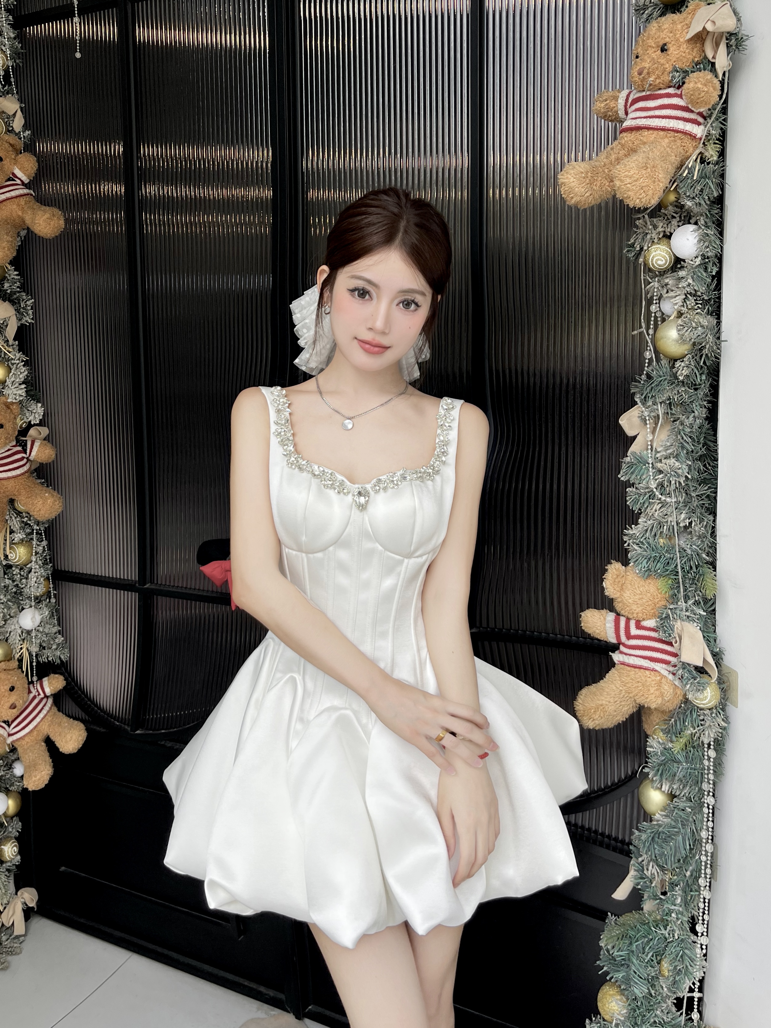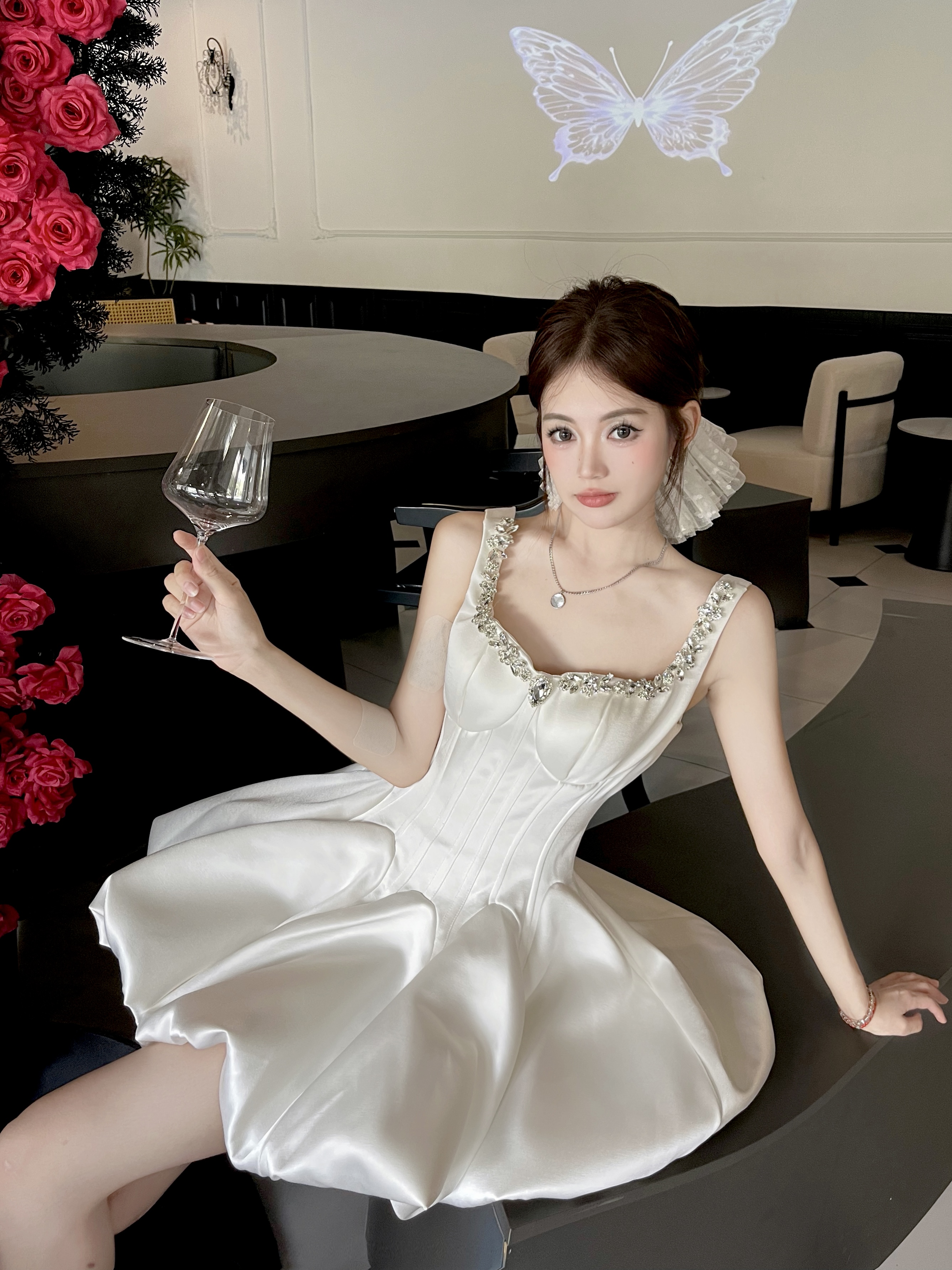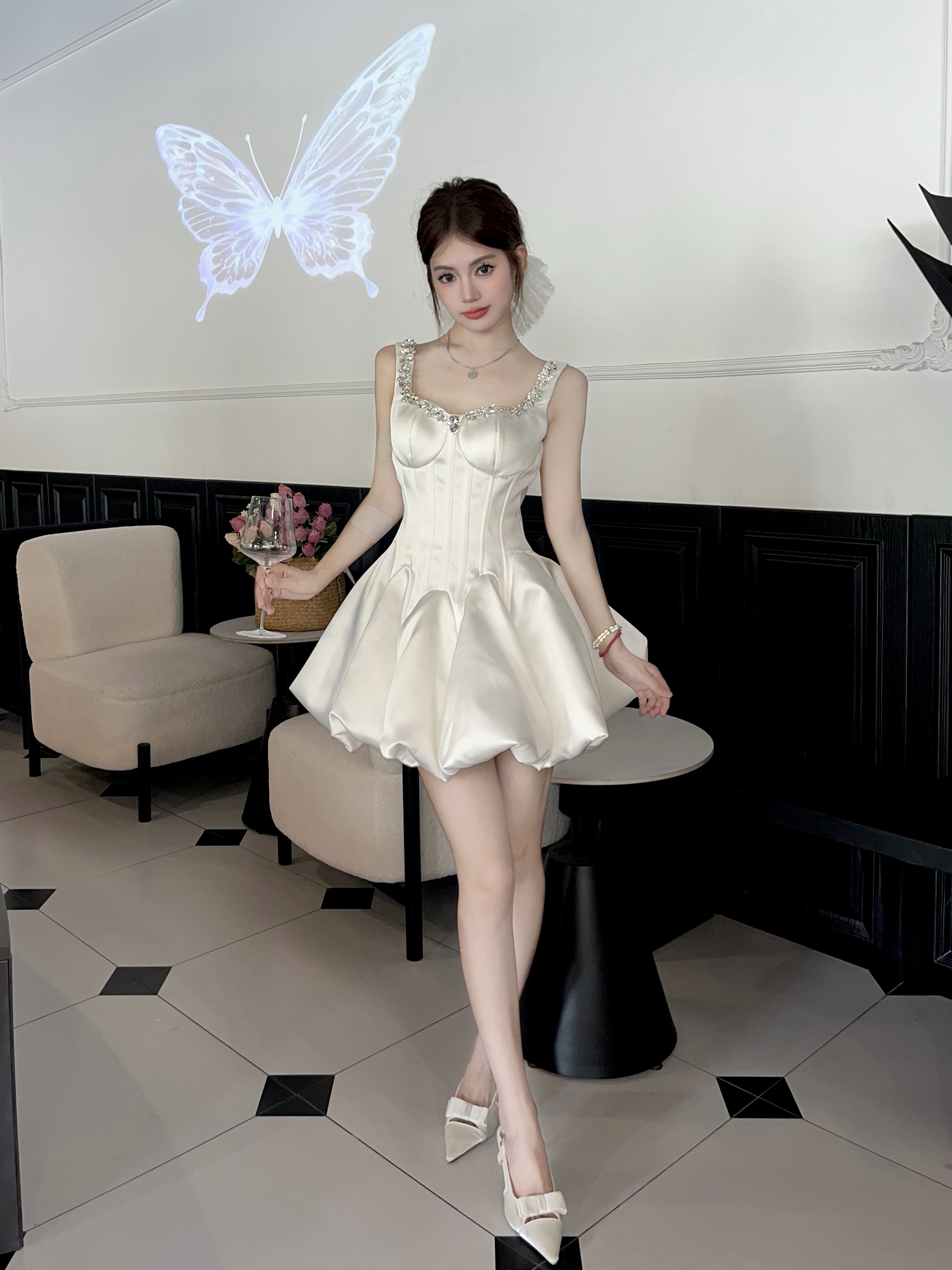 Daughter-in-law style black camisole dress women's 2025 autumn/winter with diamond-encrusted square neck waist small black dress banquet dress