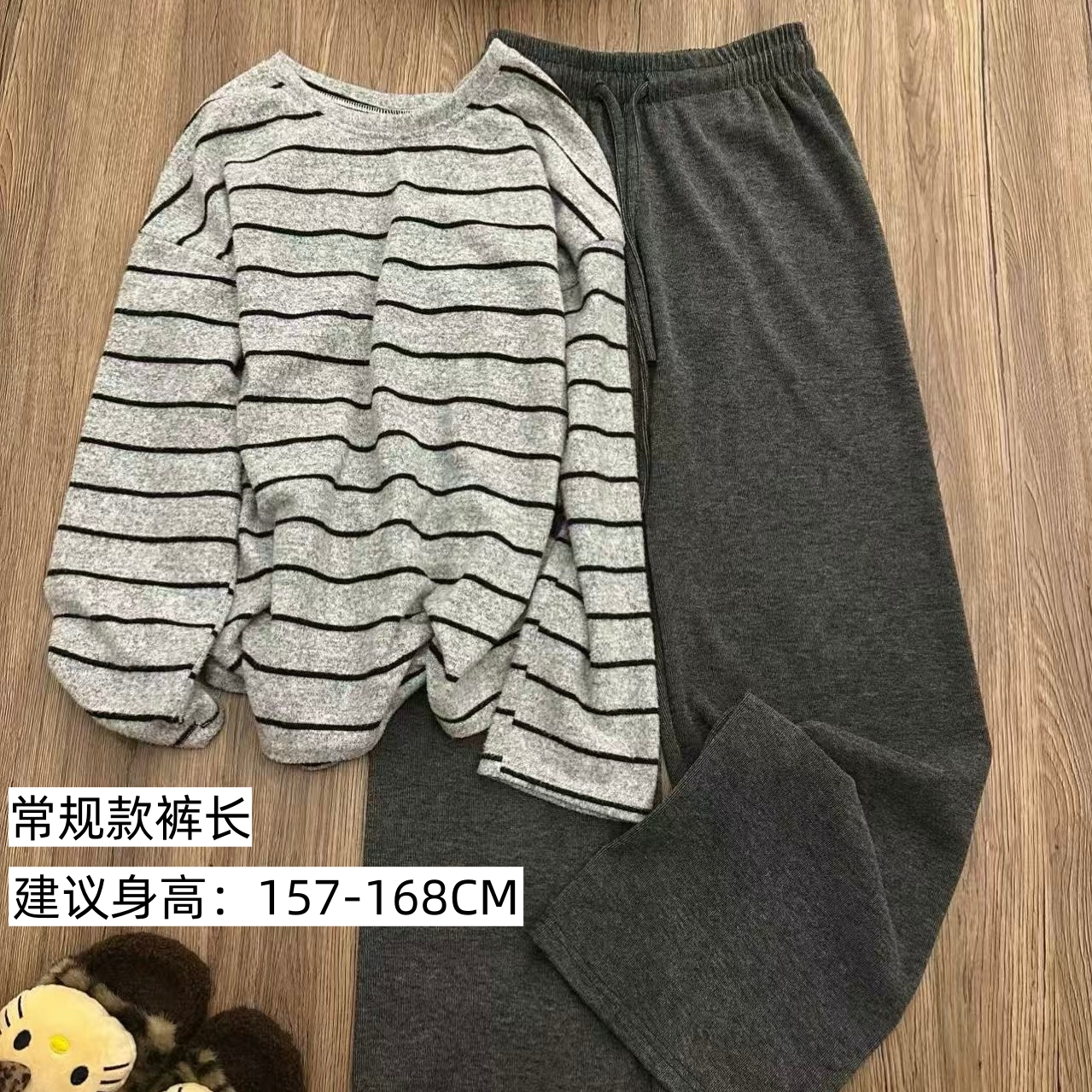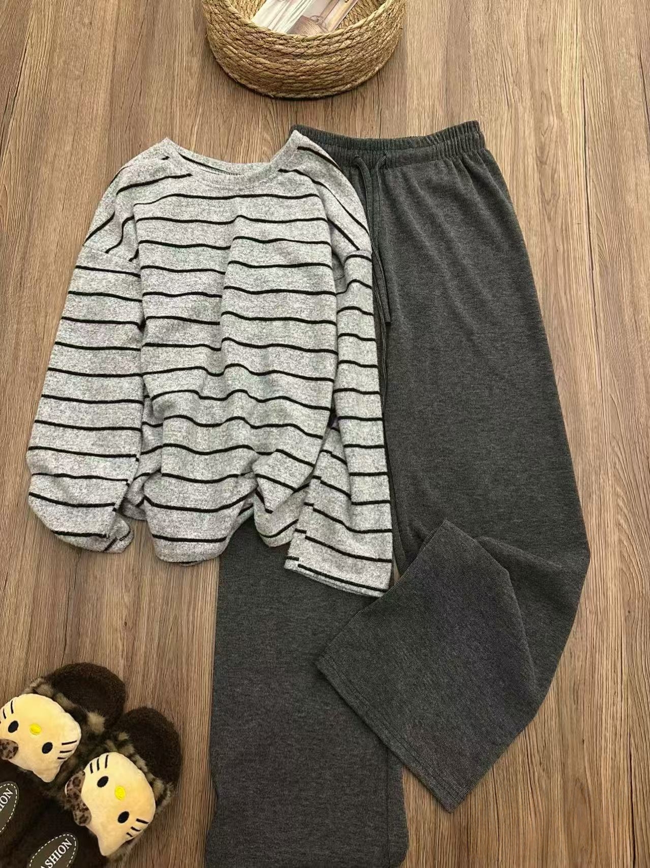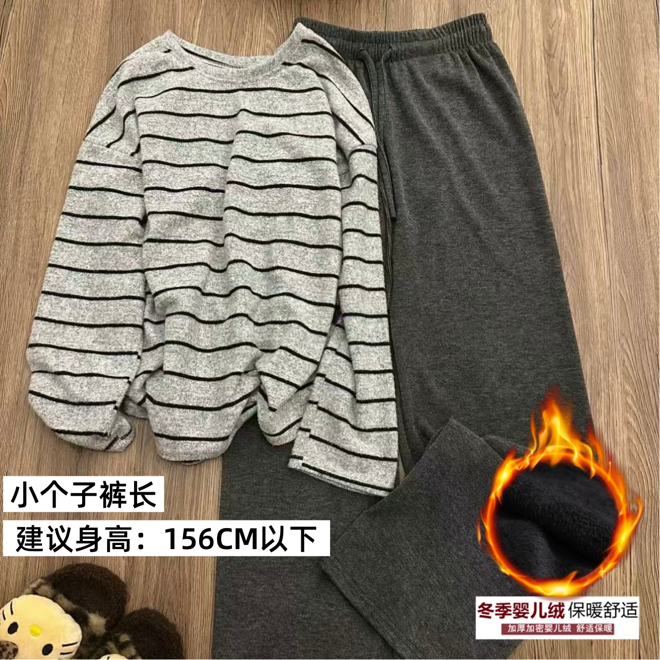 Korean set women's autumn and winter fleece 2025 new striped top loose slim wide-leg pants small women's clothing