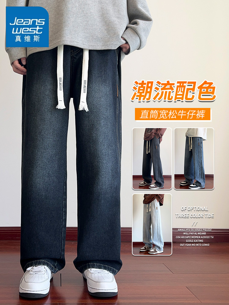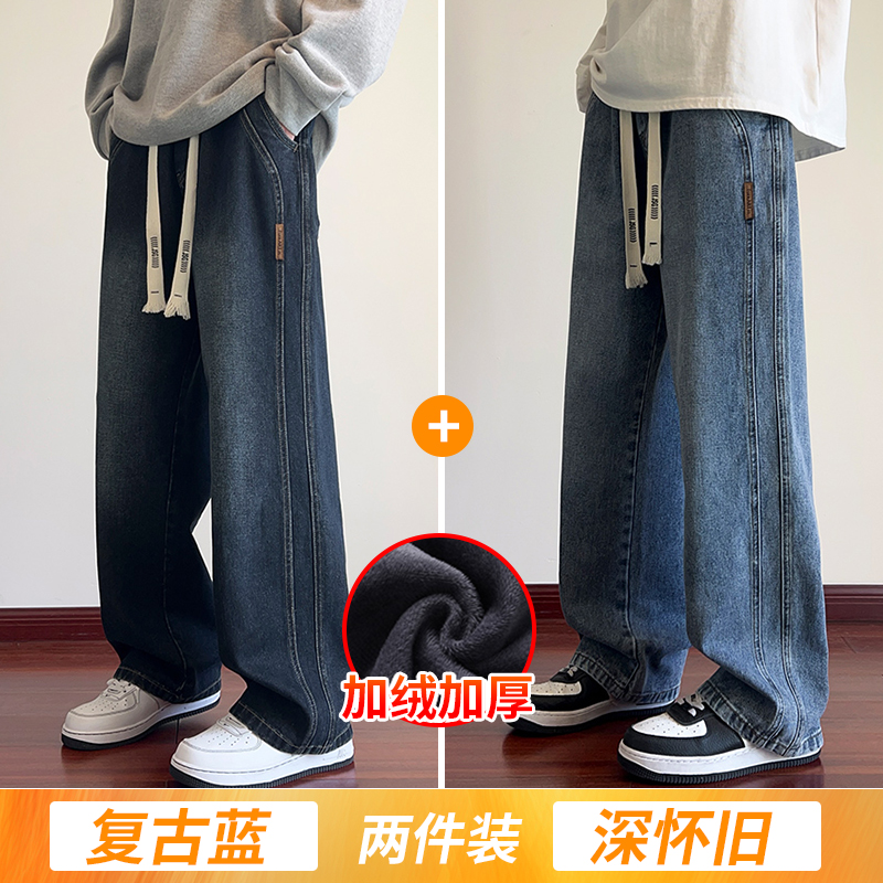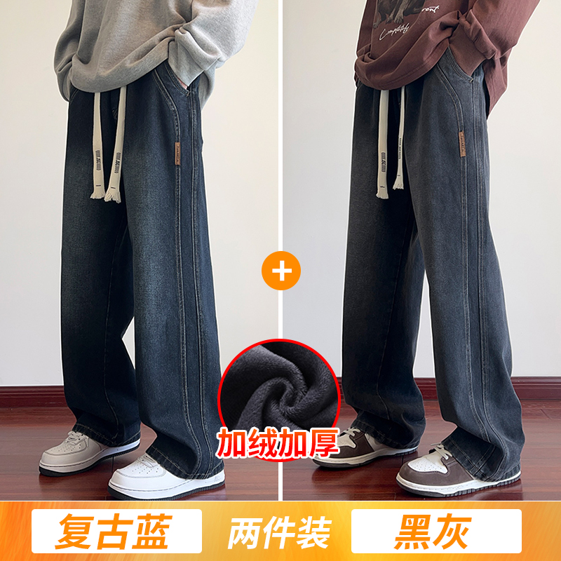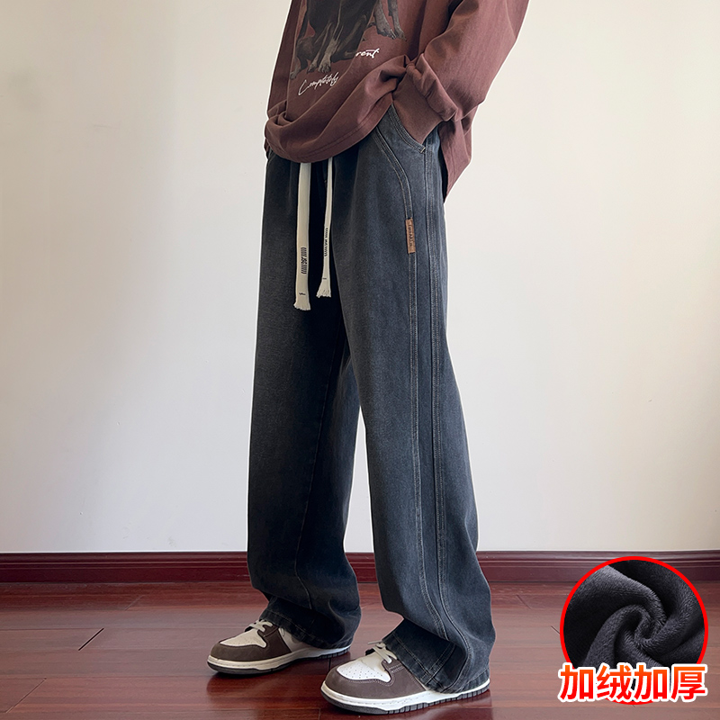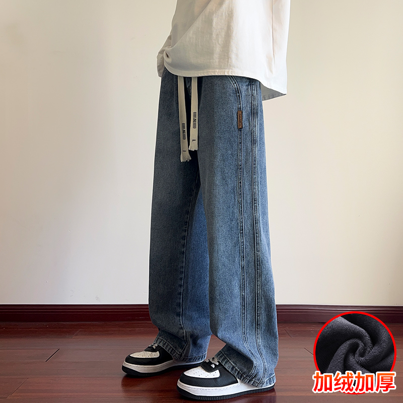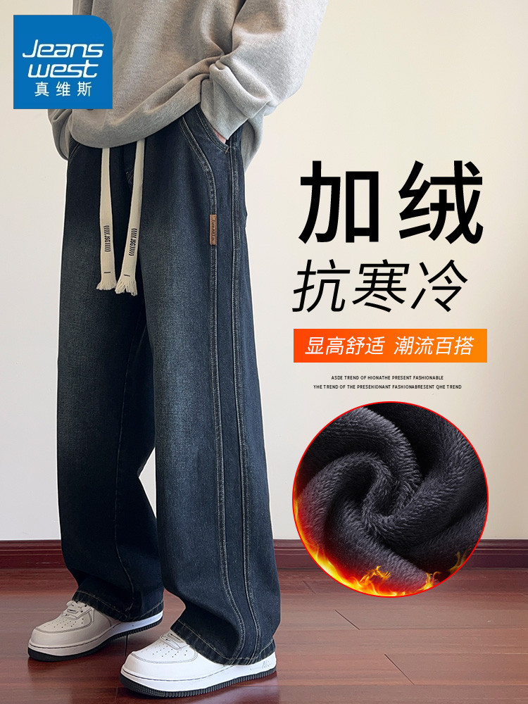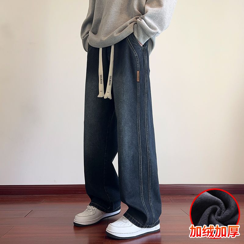 True Vista fleece thickened jeans for men 2025 autumn and winter new loose straight trendy brand wide-leg pants for boys