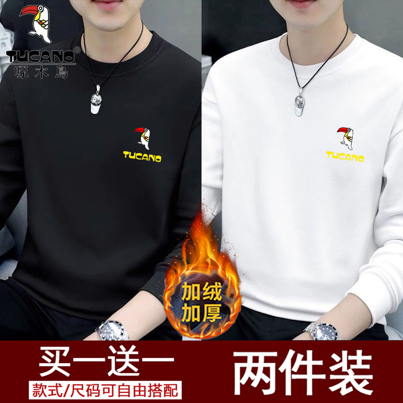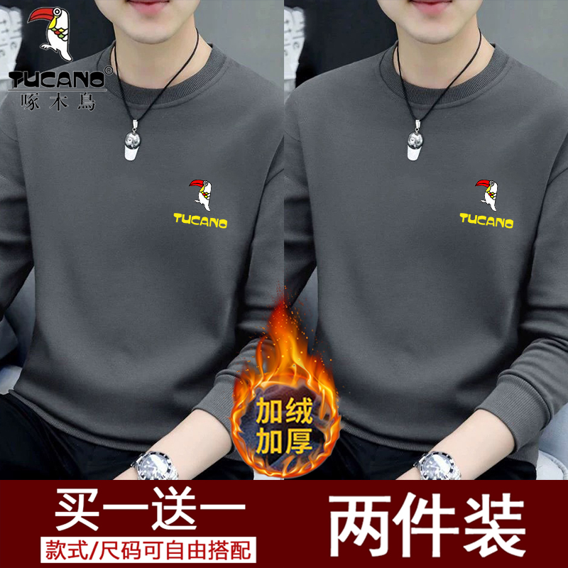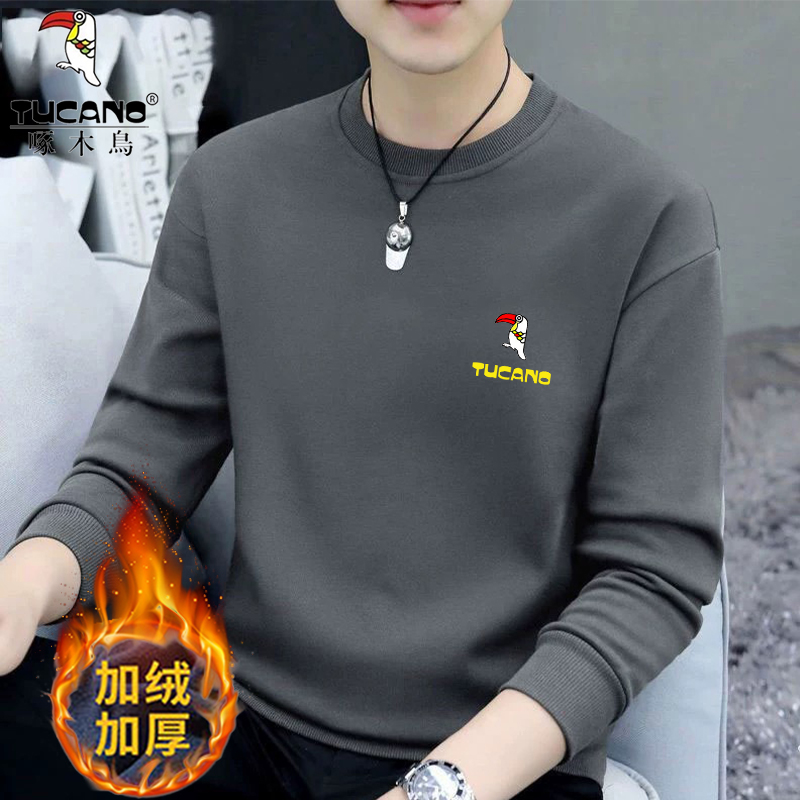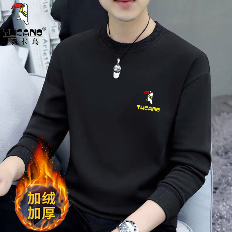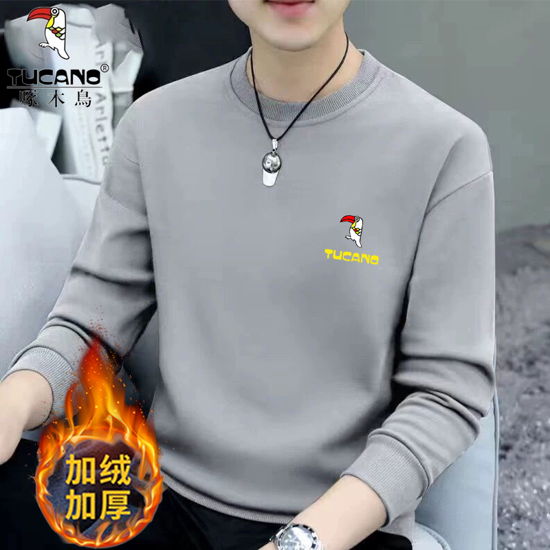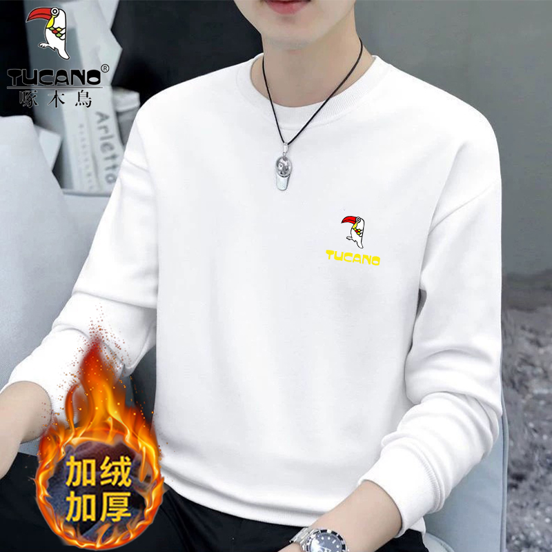 Woodpecker Spring and Autumn New Sweatshirt Men's Crew Neck Plush Long Sleeve Men's T-Shirt Winter Warm Top Base Shirt Men's Undershirt