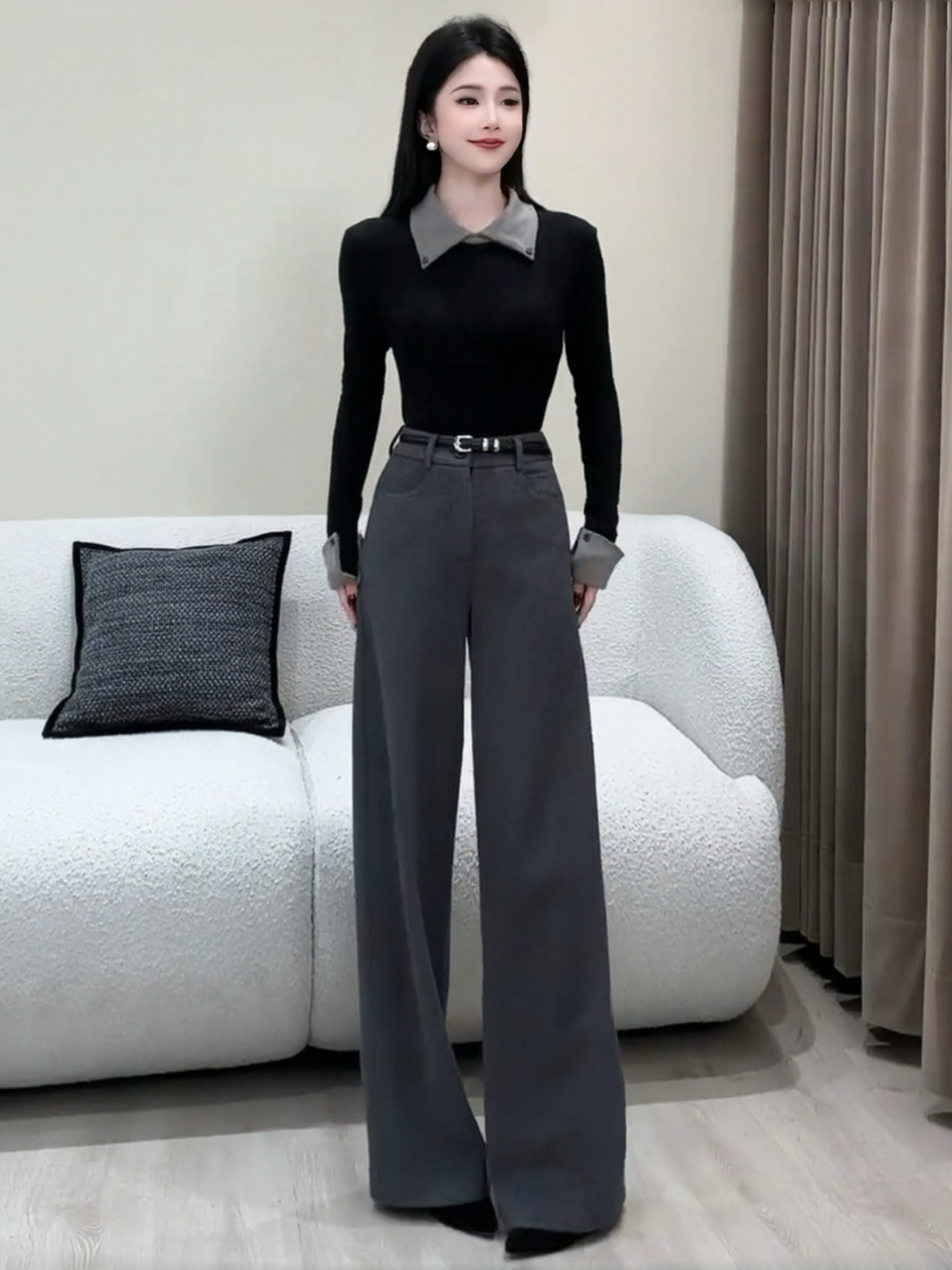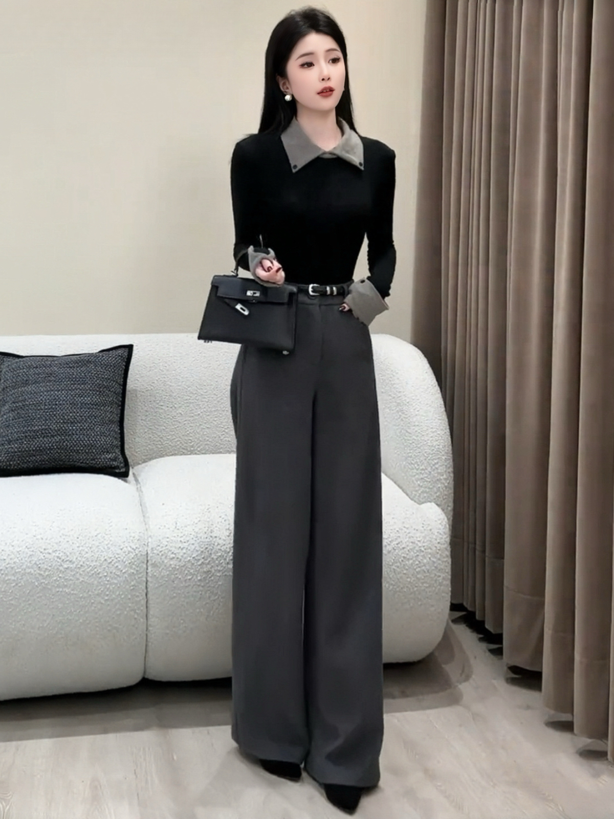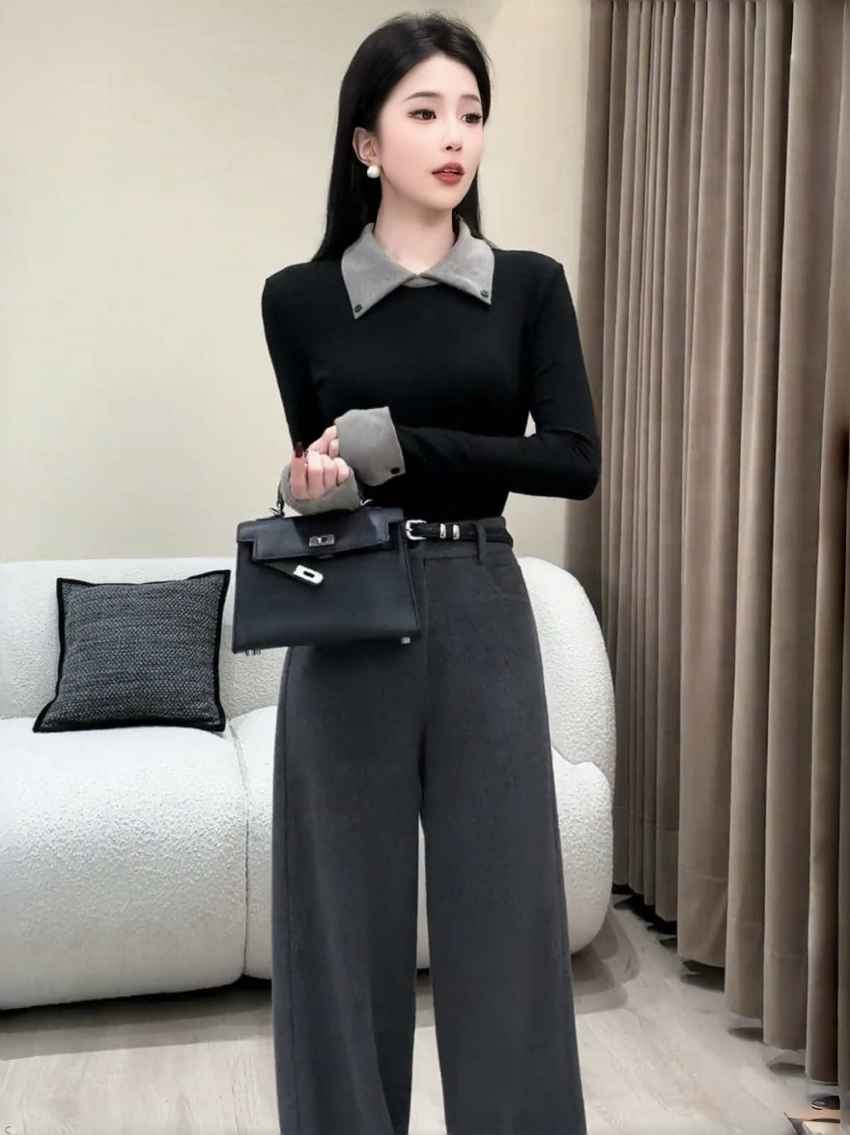 He is good-looking in autumn and winter, a complete set of Korean high-end royal sister temperament, plus fleece long-sleeved T-shirt and wide-leg pants
